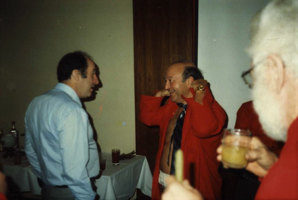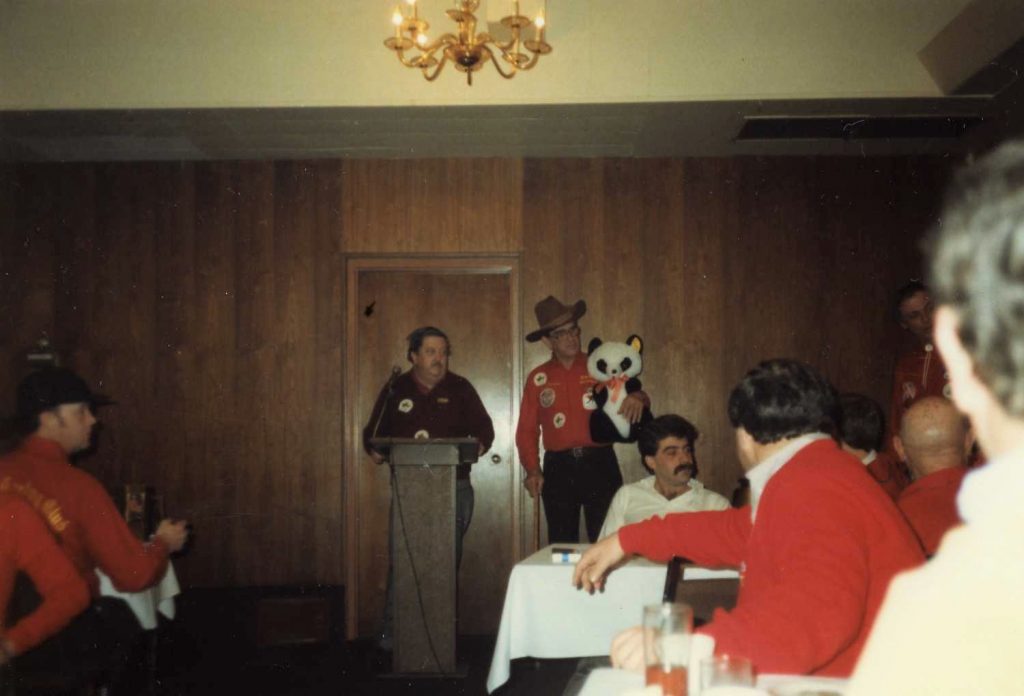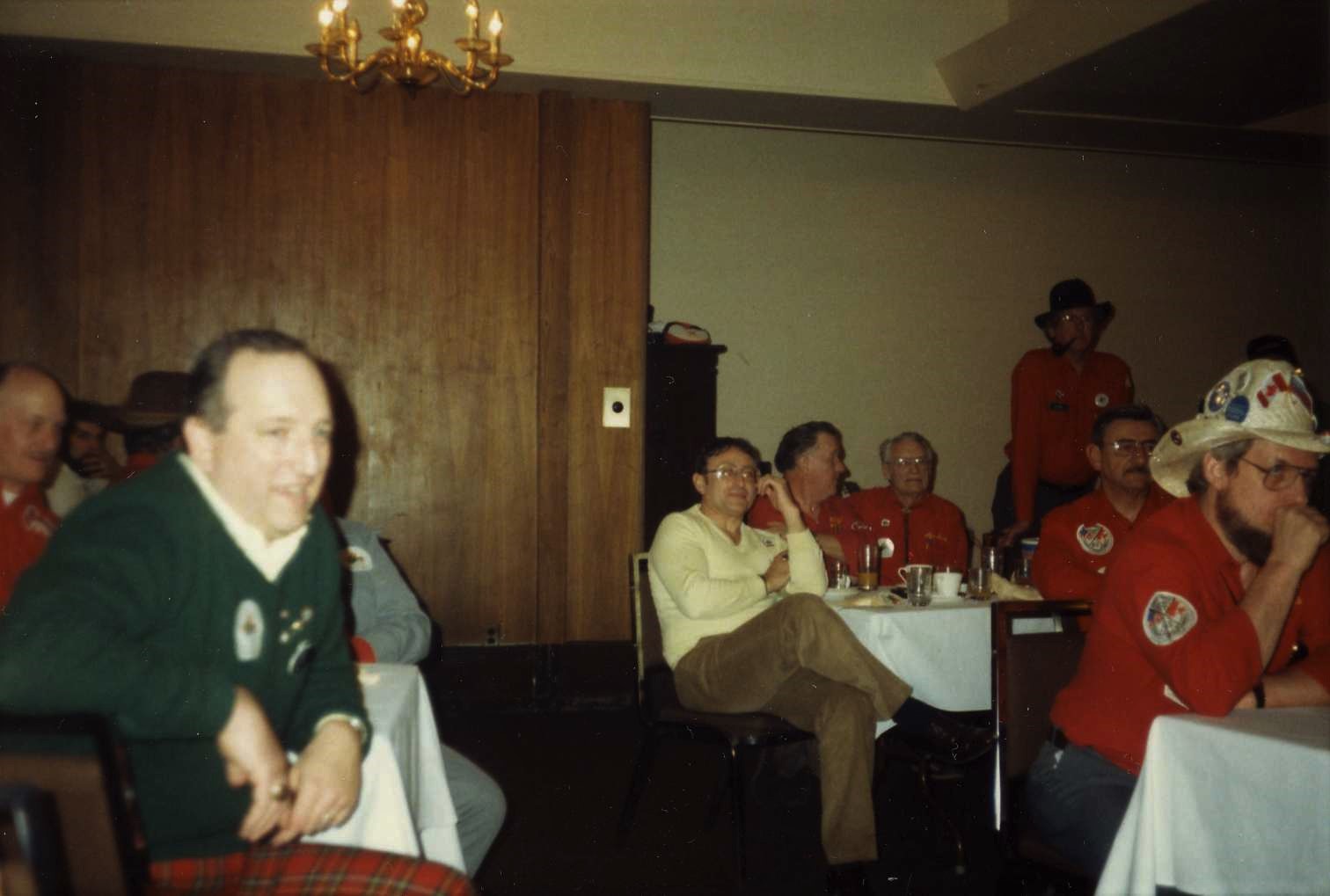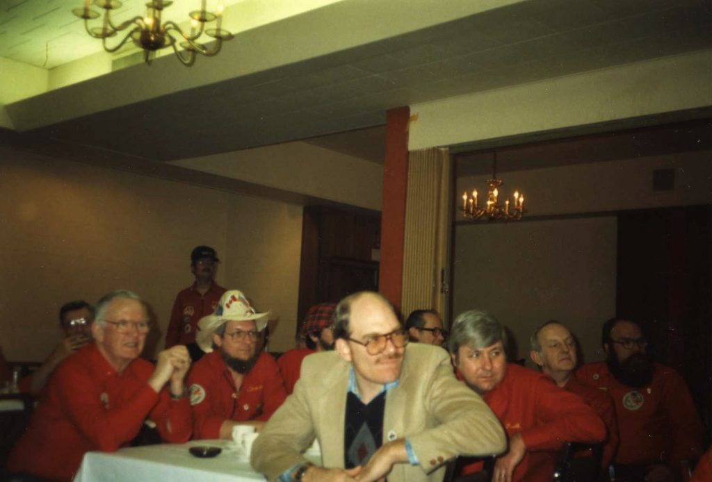 From the center going to the right: ?#1?, Don Luft, Alex Murray, Pat Bourke (standing), Don Reinhardt and Glen Thompson. (Mar 85)