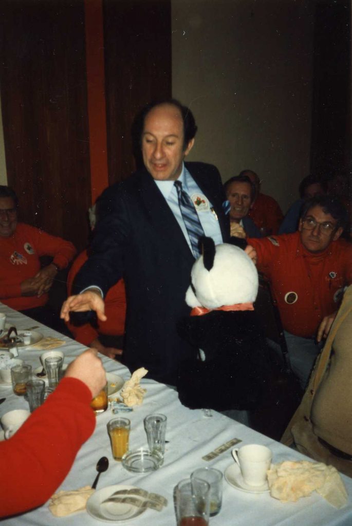 Harvey Deson collects the money from the winning bidder on the bear. Bob Kennedy has his eye on Harvey.