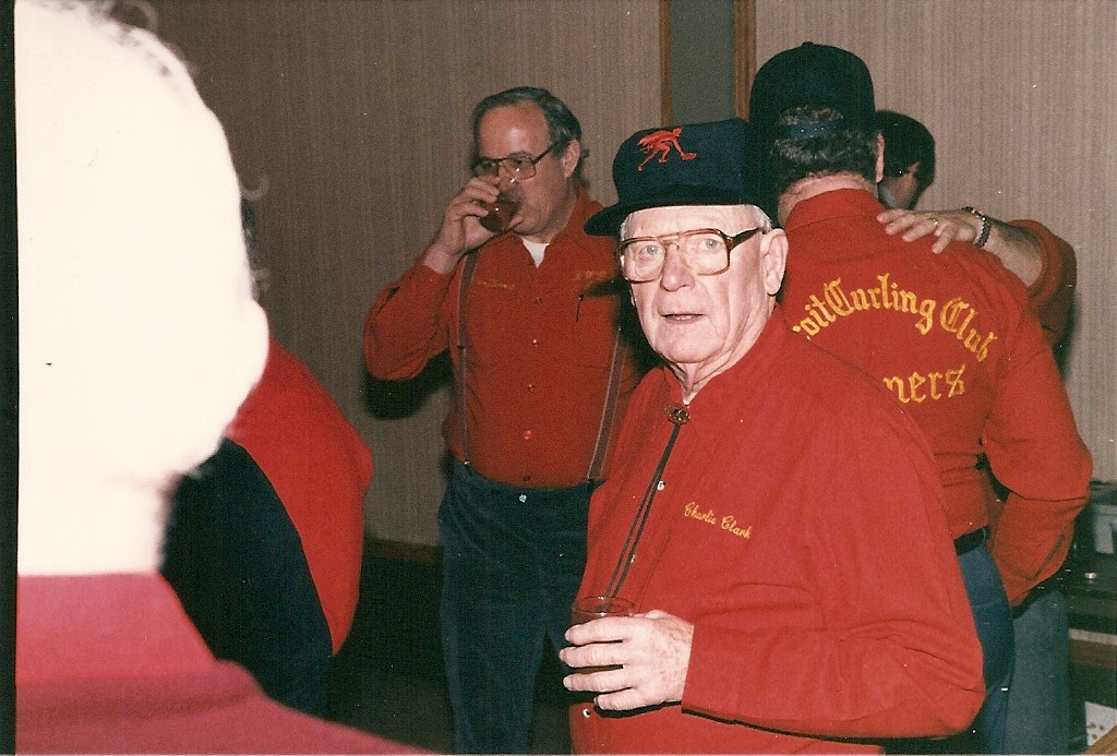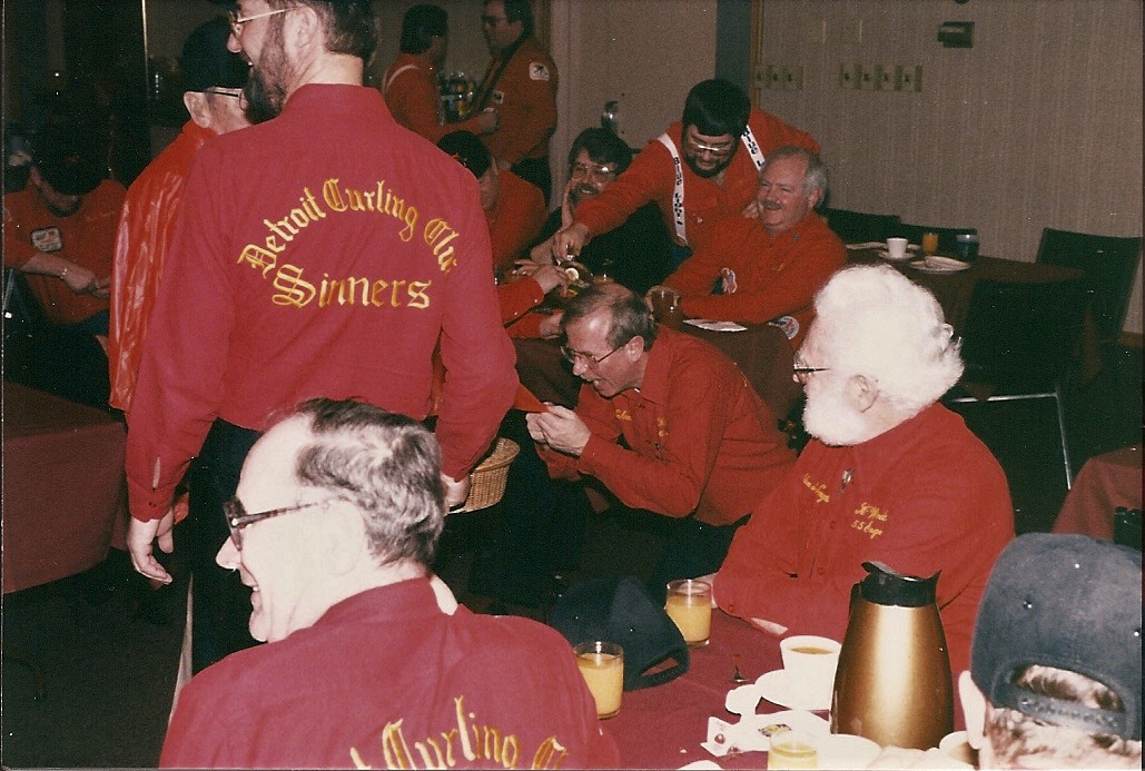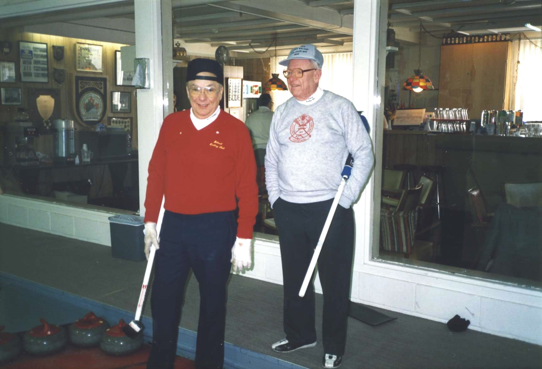 Out on the ice at the KW Granite club are: Aden Snyder, Roger Kurth, Ernie Lappin, Joe Livermore, Paul Sellner, Paul Badgero. Bob Mooney is on the left looking back at the camera.