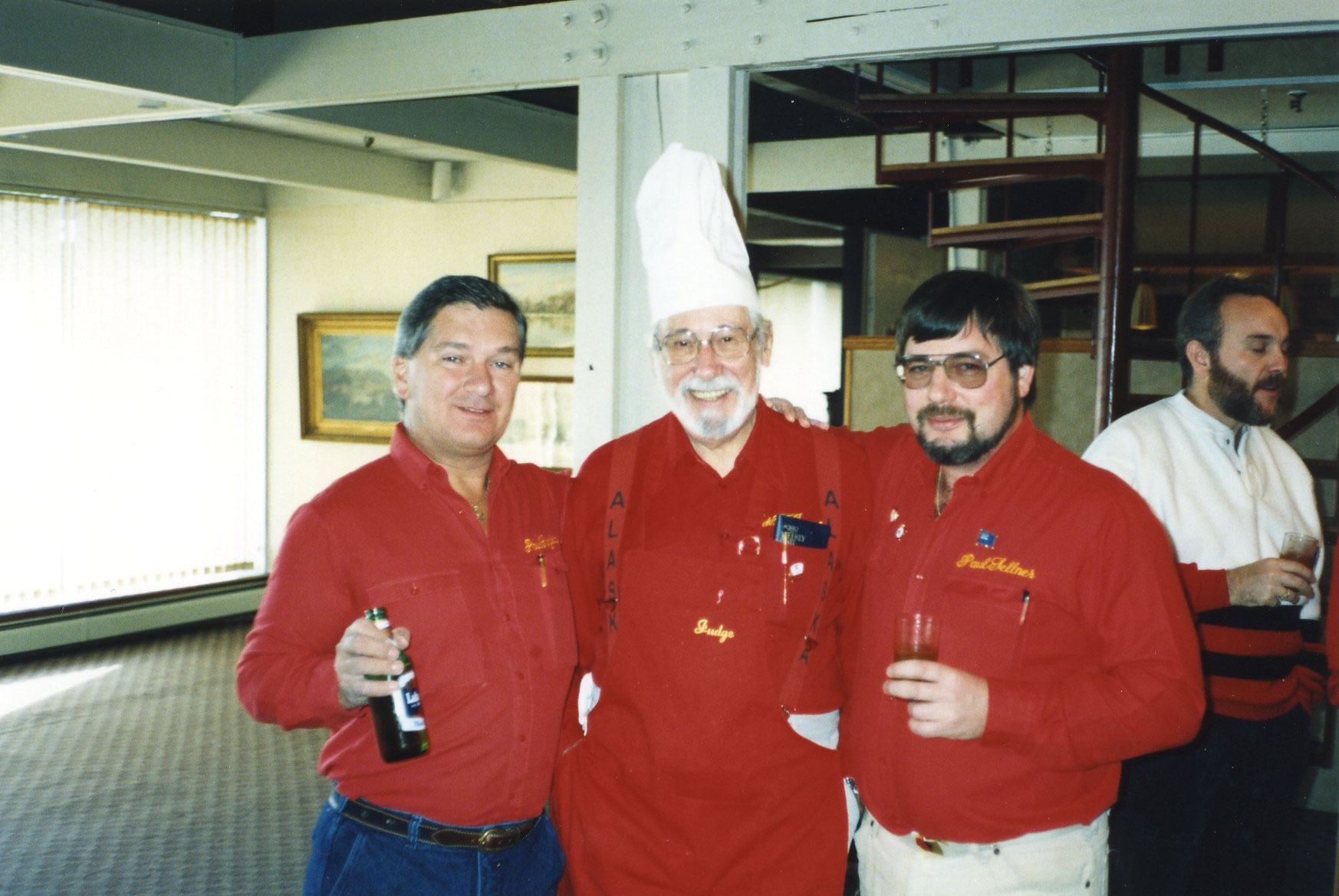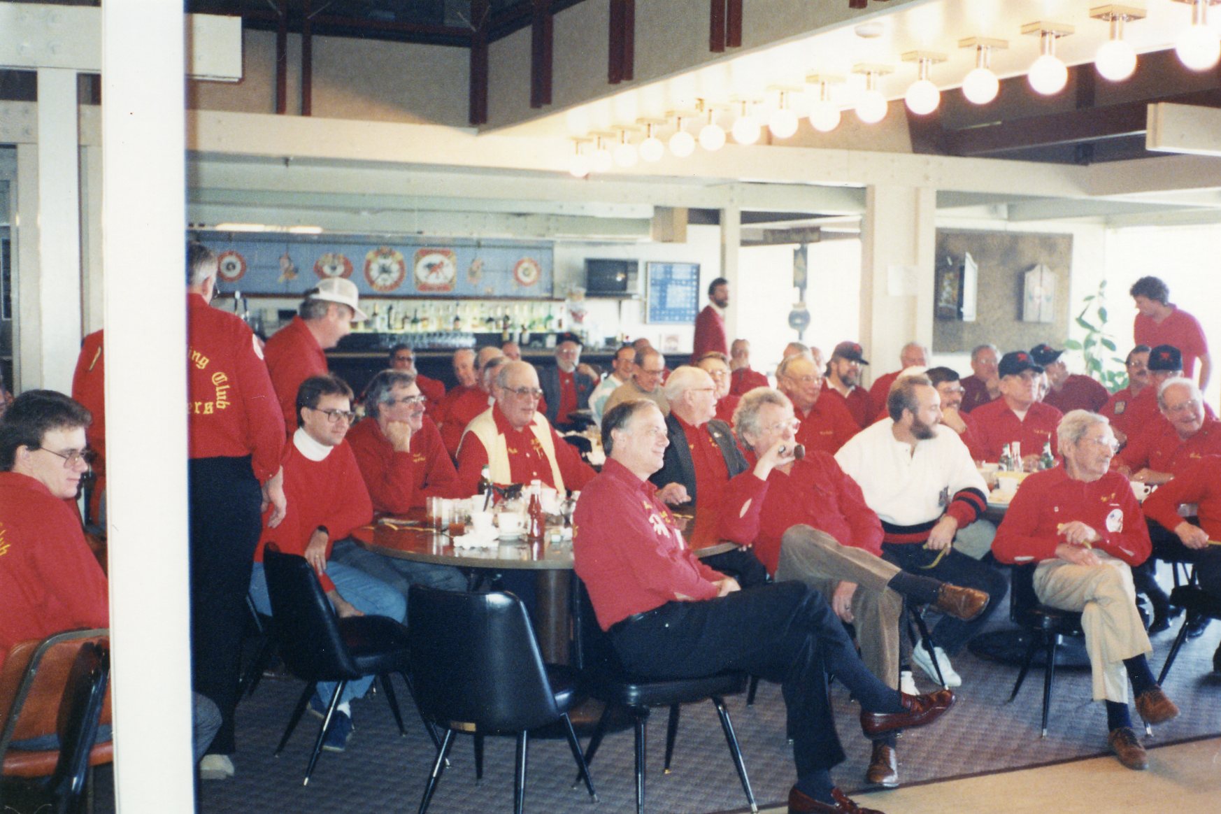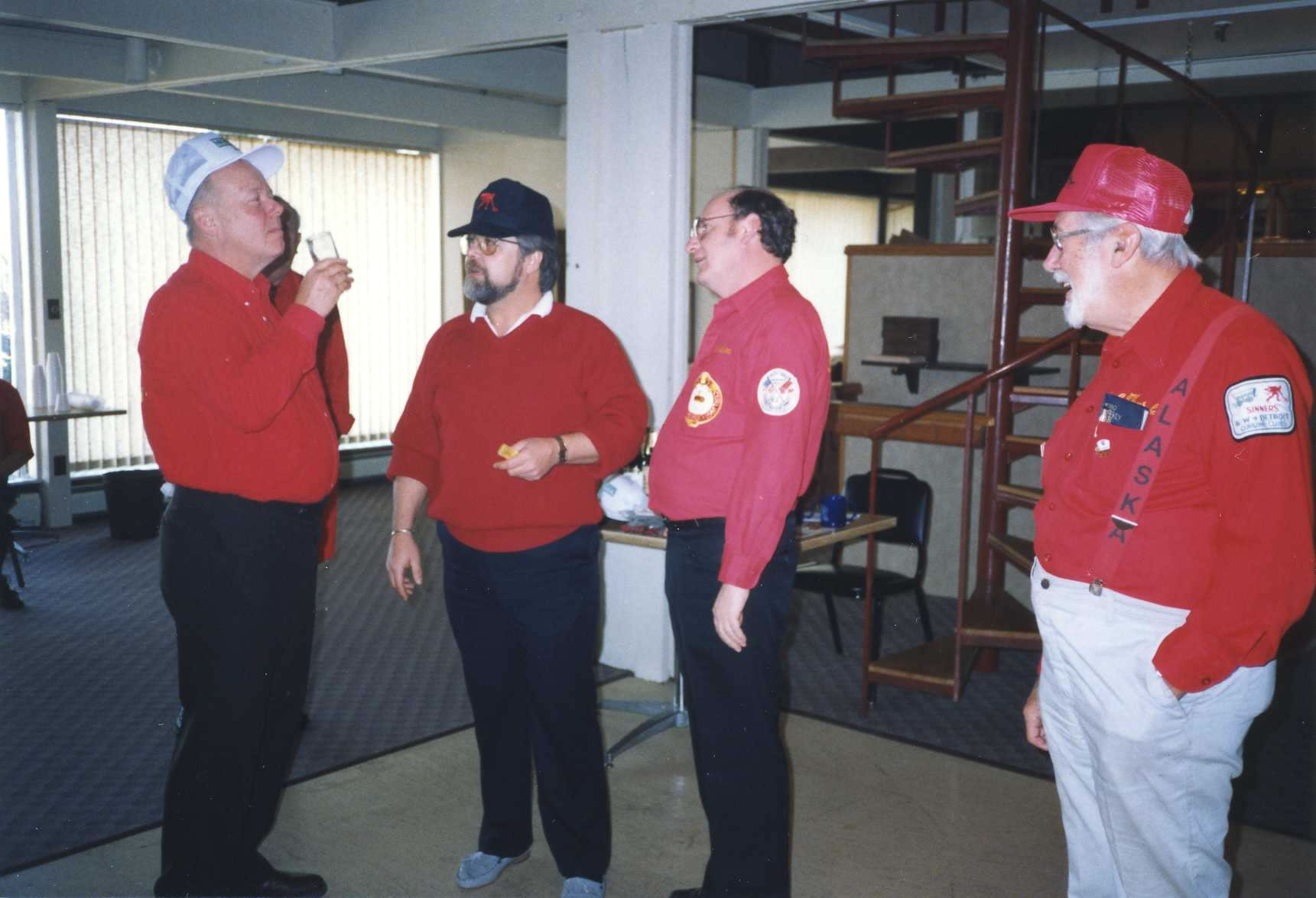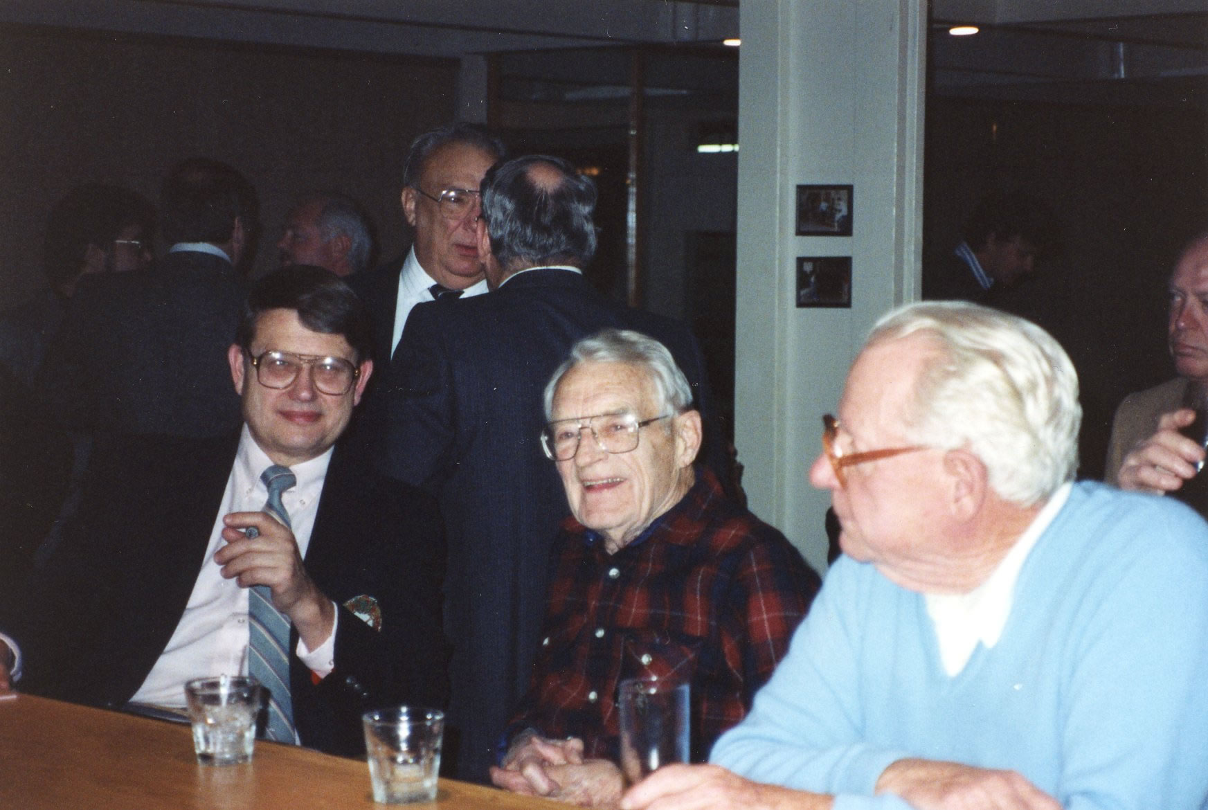 Having a drink after dinner are: Dave Nelsen, Alex Murray and Charlie Clark.