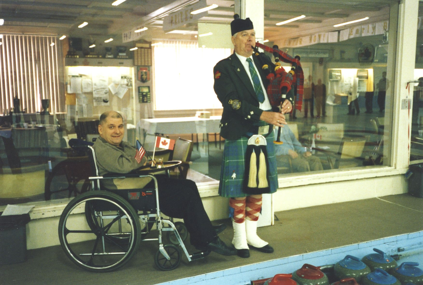 The piper pipes the curlers on the ice before the curling started on Saturday morning. Bill Burgess watches the curlers lining up.75th – March 1993
