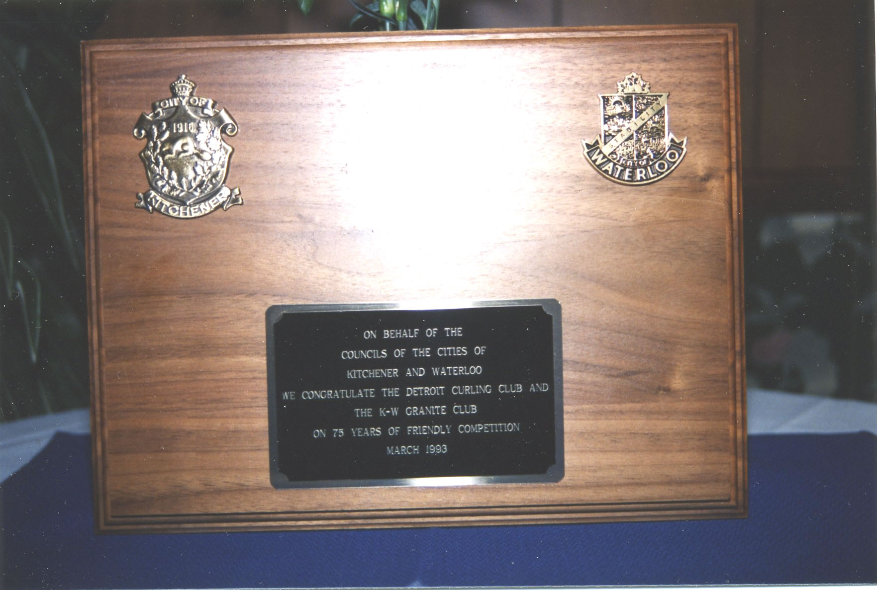 This plaque was presented to the Exchange by the Cities of Kitchener and Waterloo to celebrate the 75th.