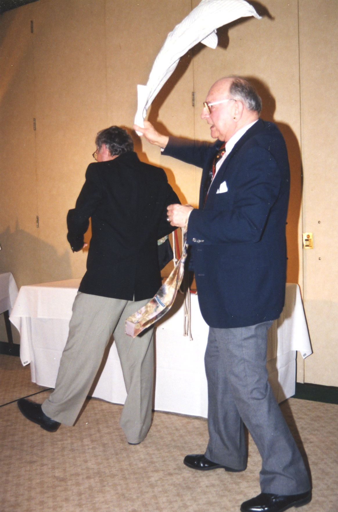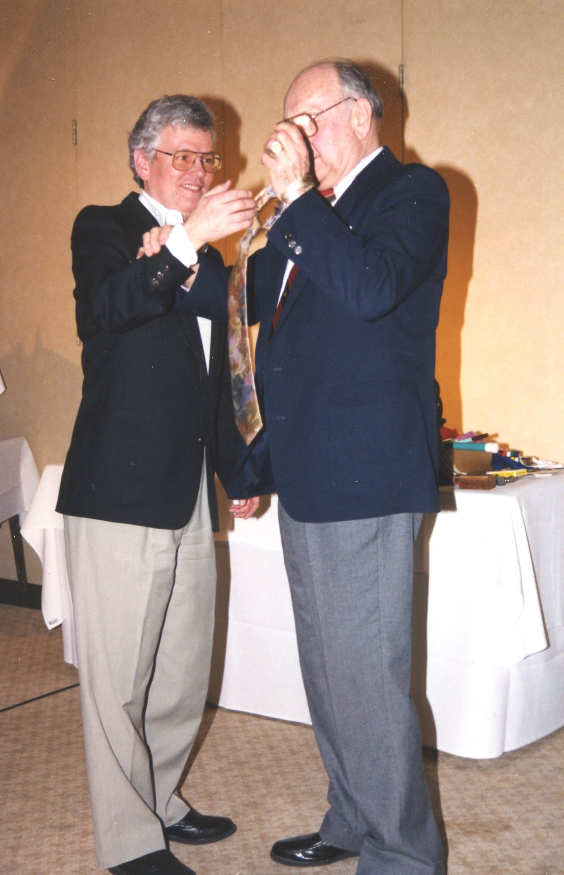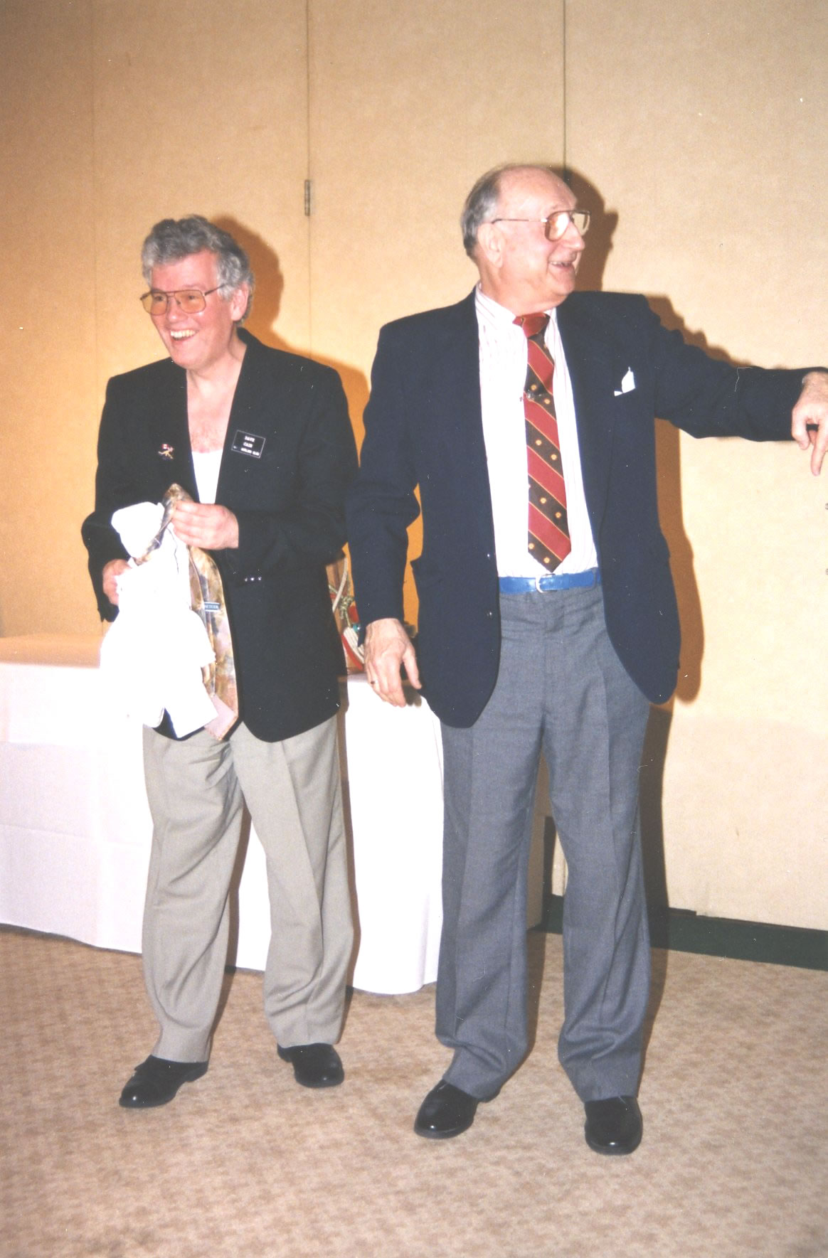 After the Saturday dinner, a magician did a few tricks. Pete Frisk on the left and Bill Rimmer on the right are getting a lesson on paying attention.