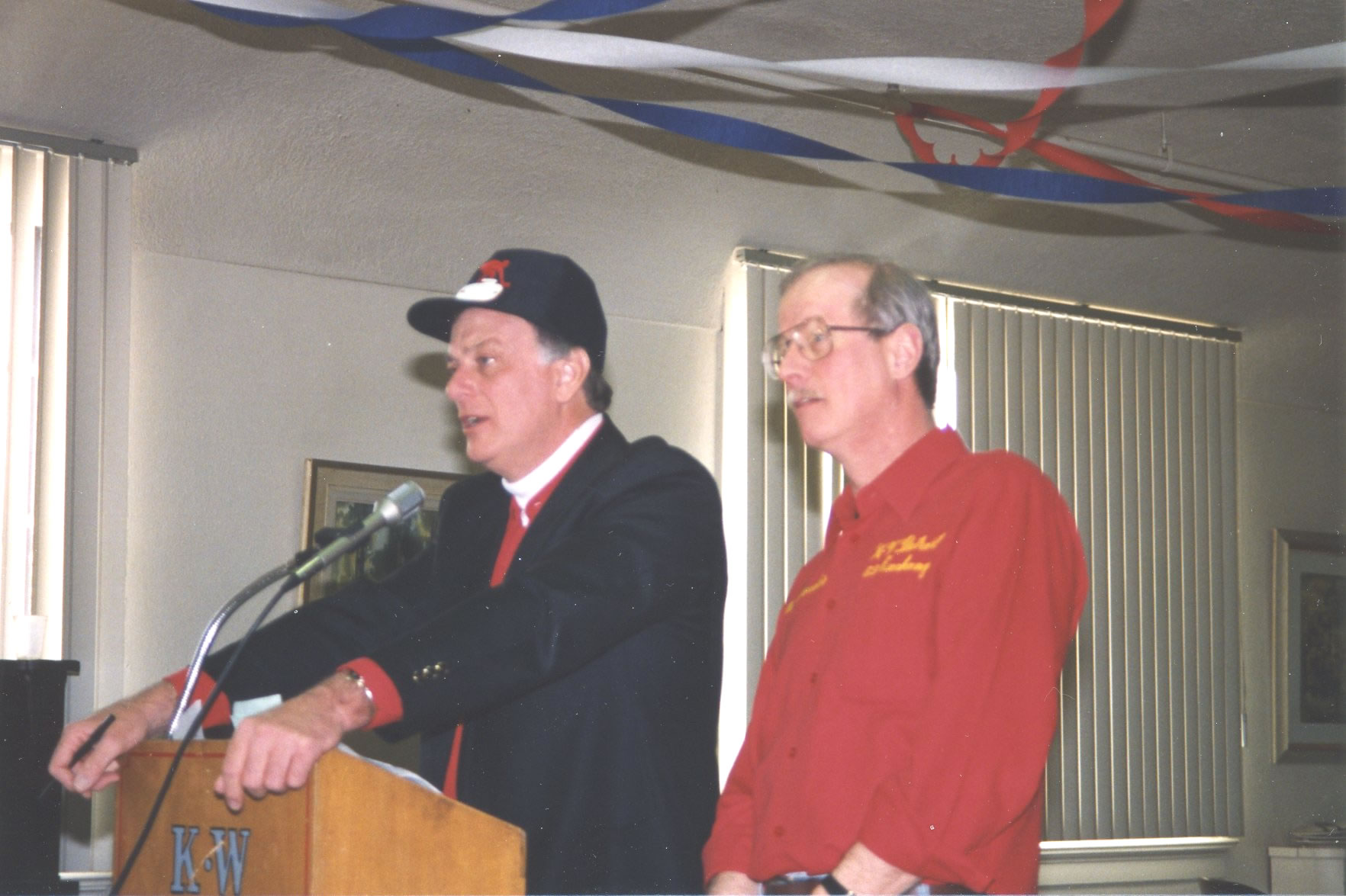 At sinners breakfast Don Fanstone (the Deacon) is addressing the assembled while Dallas Schneider looks on.
