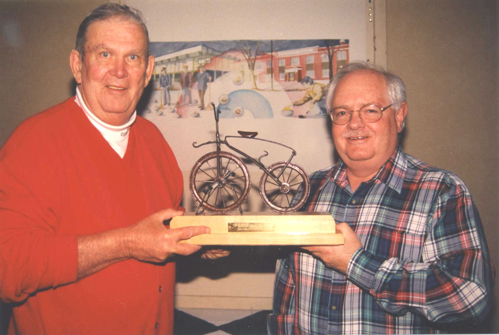 On the left is Joe Livermore unveiling the Jack Blamey “Bombay Bicycle Club” trophy for Dave Blamey. Dave’s father Jack was a long time member of the exchange. He was also a great story teller. In Jack’s memory, this trophy is presented at each exchange to the person who tells the best story.