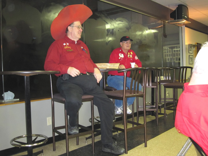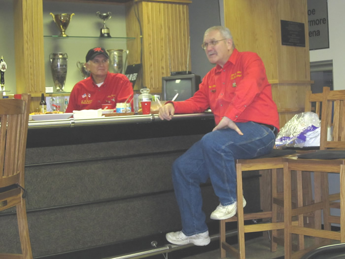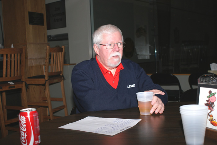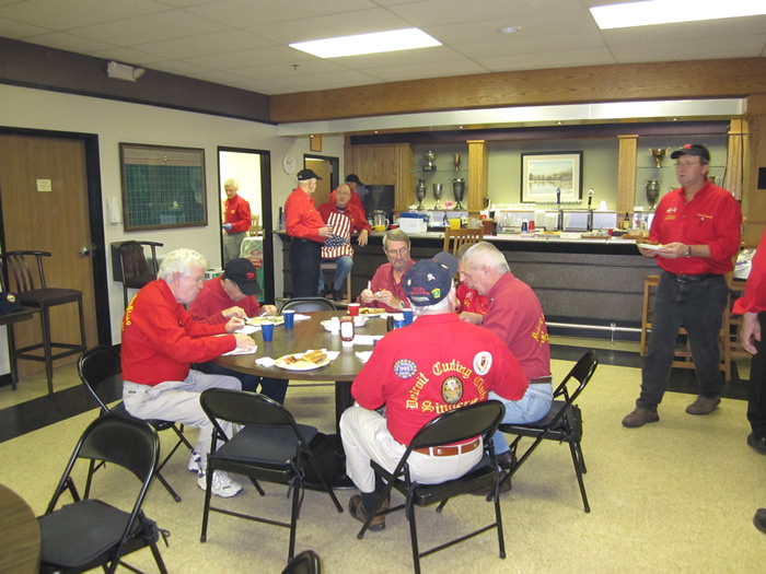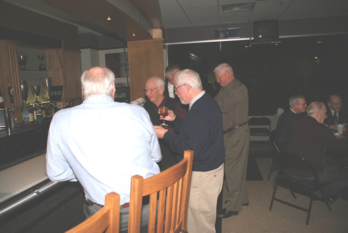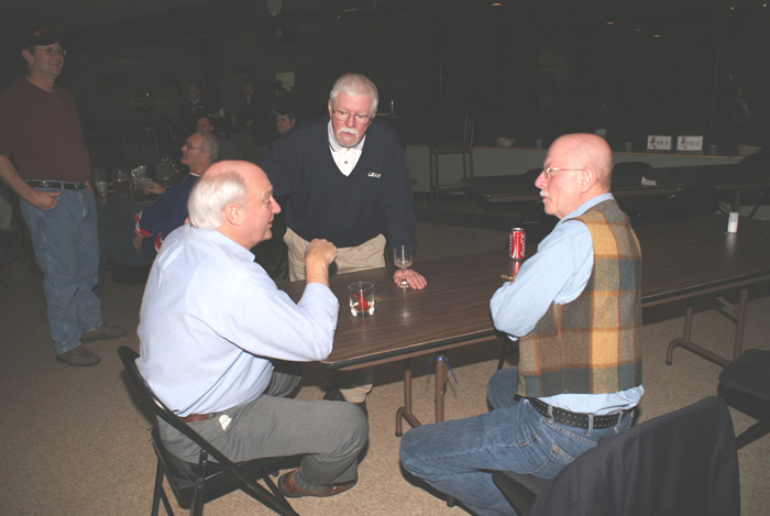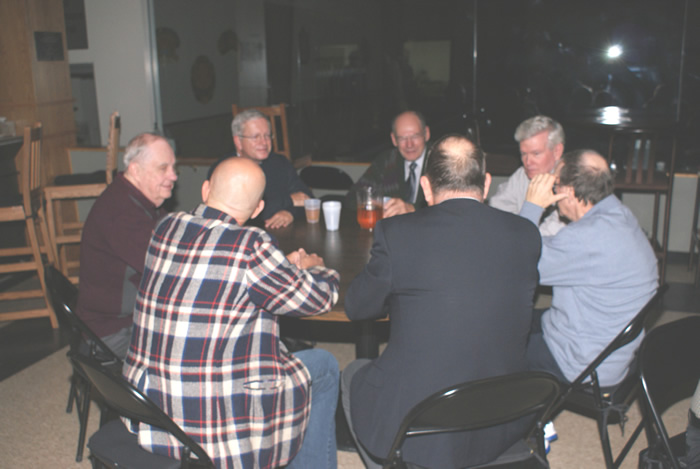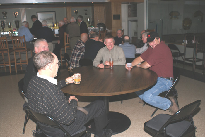 At this table are clockwise from the left: Dave Cain, Norm Green, Bob Mooney, Jim Renaud, Paul Sandford and Bob Kennedy. Cec Hofstedder leaves the buffet table with a full plate. Dave Hesse chats with Ken Zryd in the background.