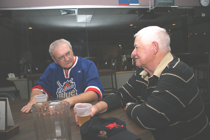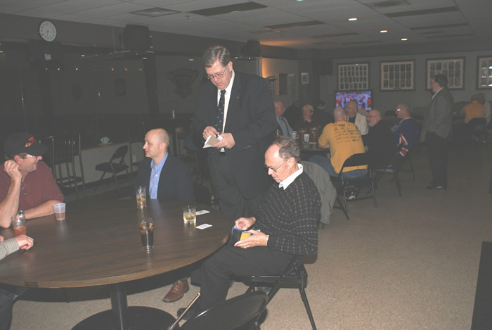Frank Duffey (standing) selling 50/50 tickets. From the left are Cec Hofstetter, Chris Zahorec and Ron Shane.