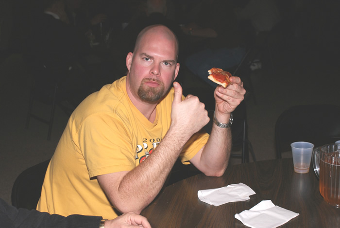 Some people got hungry between lunch and dinner on Saturday so they ordered a pizza. Dan Glendinning is enjoying his pizza.
