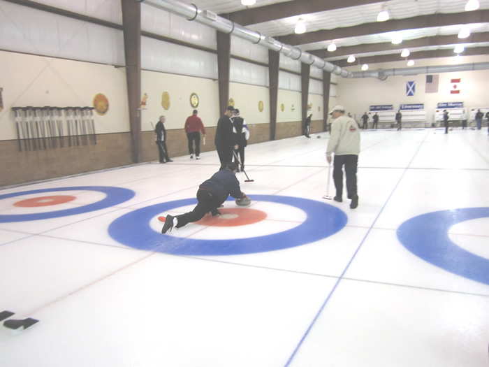 Dave Nelsen (nice tuck) delivers a rock as Bill Morris and Jeff Deneen get ready to sweep.