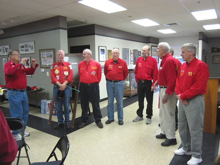 Dave Nelsen gives the choir the starting notes. From the left next to Dave are: Dallas Schneider, Paul Badgero, Ken Zryd, Dave Smalstig, Joe Livermore and Steve Rietz.