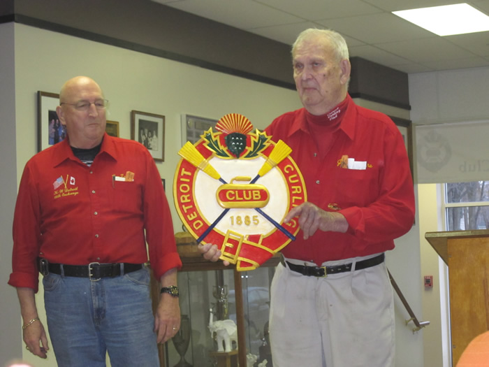 Joe Livermore accepts a wooden replica of the Detroit Curling Club crest from Ken Zryd. Ken carved the crest himself.