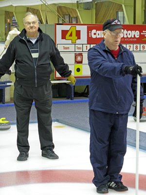At dinner on Saturday evening Dave Cain and Scott Rogers watch as Don Fanstone (middle) tries to find out why the Detroit curler’s game collapsed during the day. In the foreground, Graham Wallbank is waiting for an answer from the Detroit curlers.