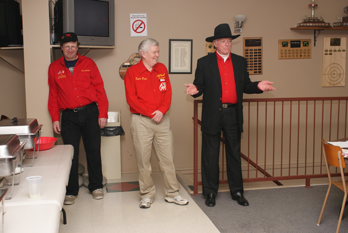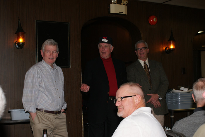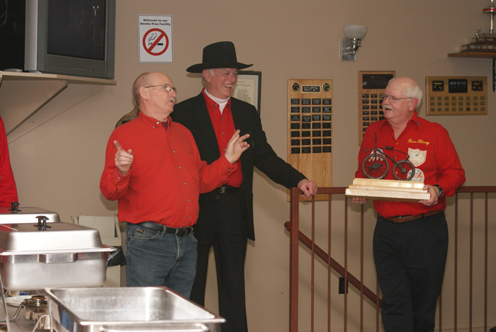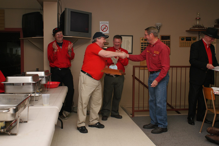 Bob MacMillan accepts the “Fish” trophy. Cec Hofstetter and Jim Renaud in the background.
