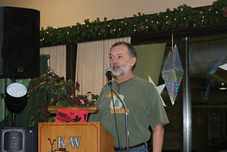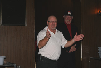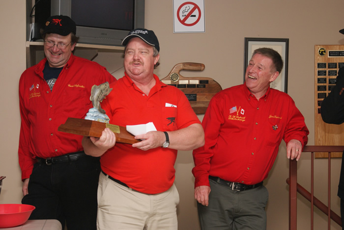 Bob MacMillan accepts the “Big Mouth Fish” trophy from Bob Mooney. Jim Renaud is in the background.