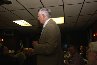 More stories were told Sunday morning. Les Houston (standing) is telling one here. At the table with Les are clockwise from the front: Don Warthman (his back), Ian Anderson, Martin Verhoeven and Dave Nelsen.