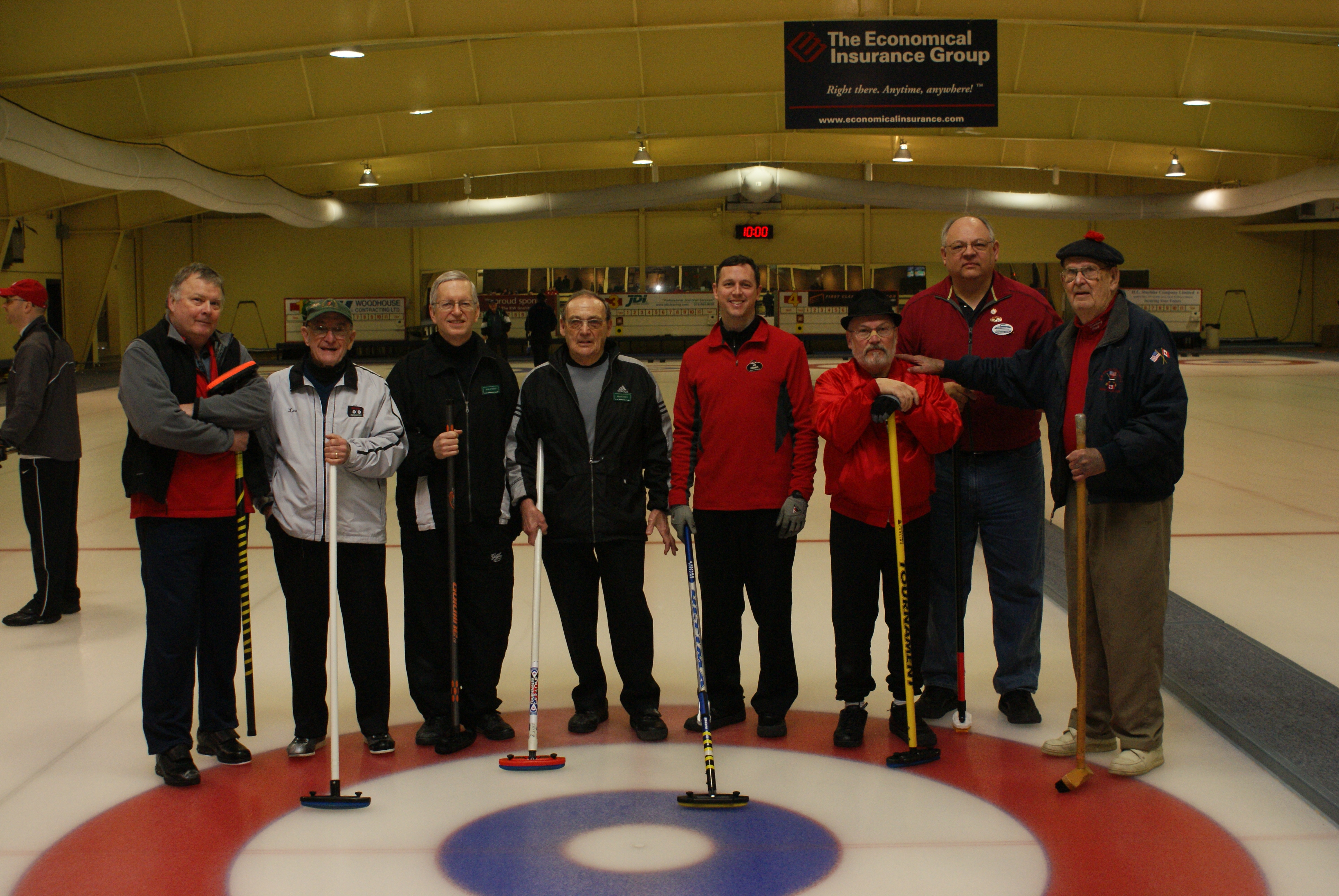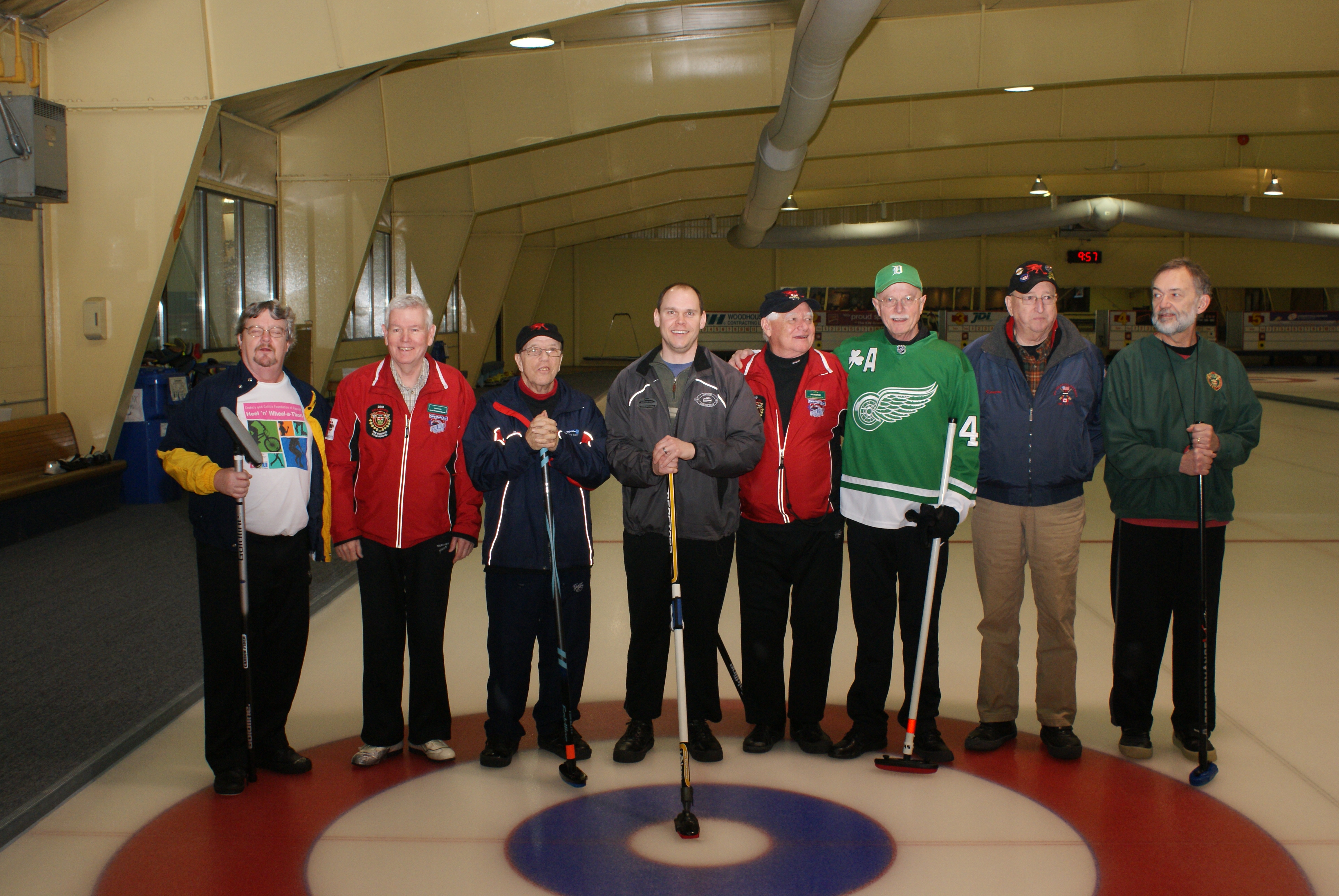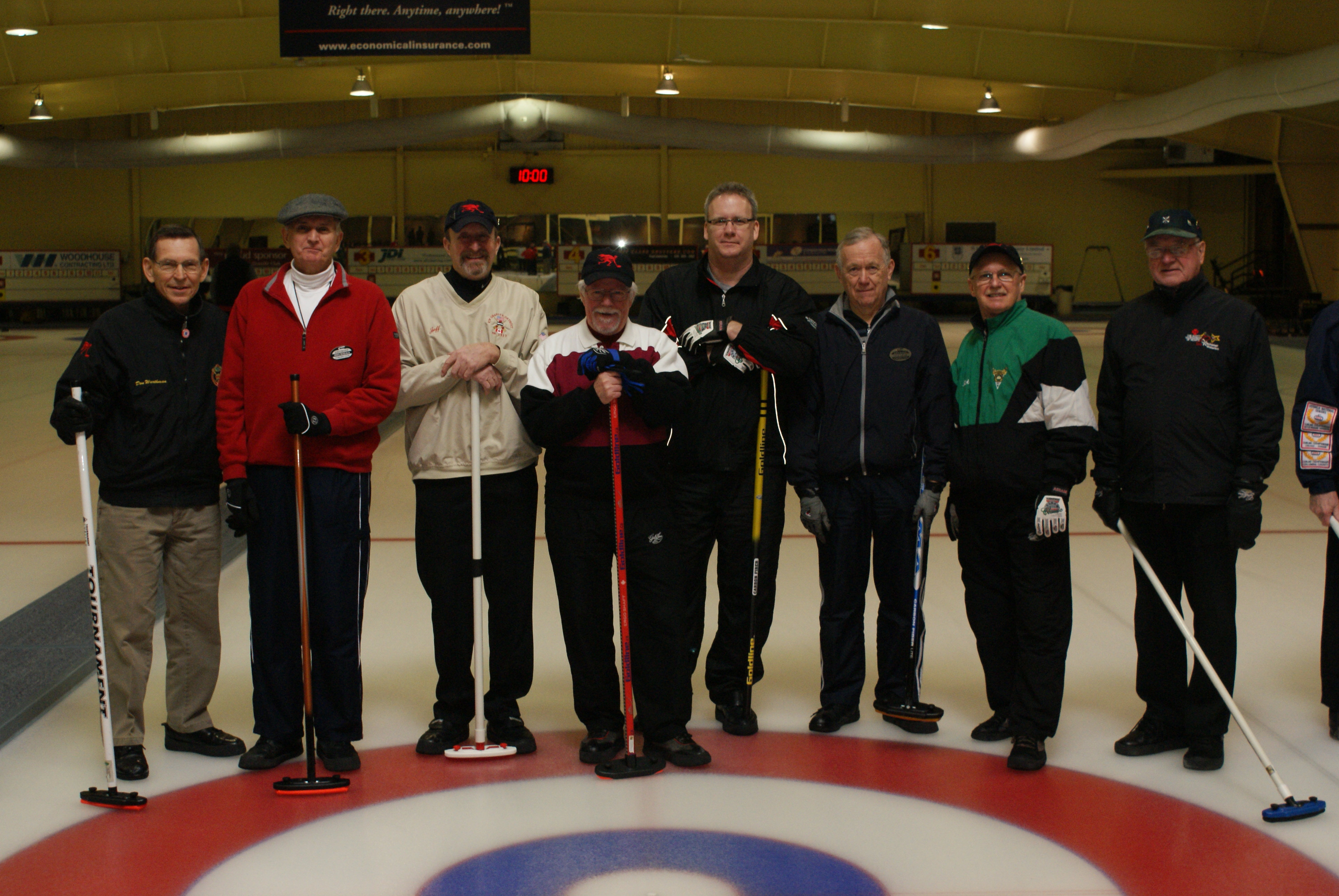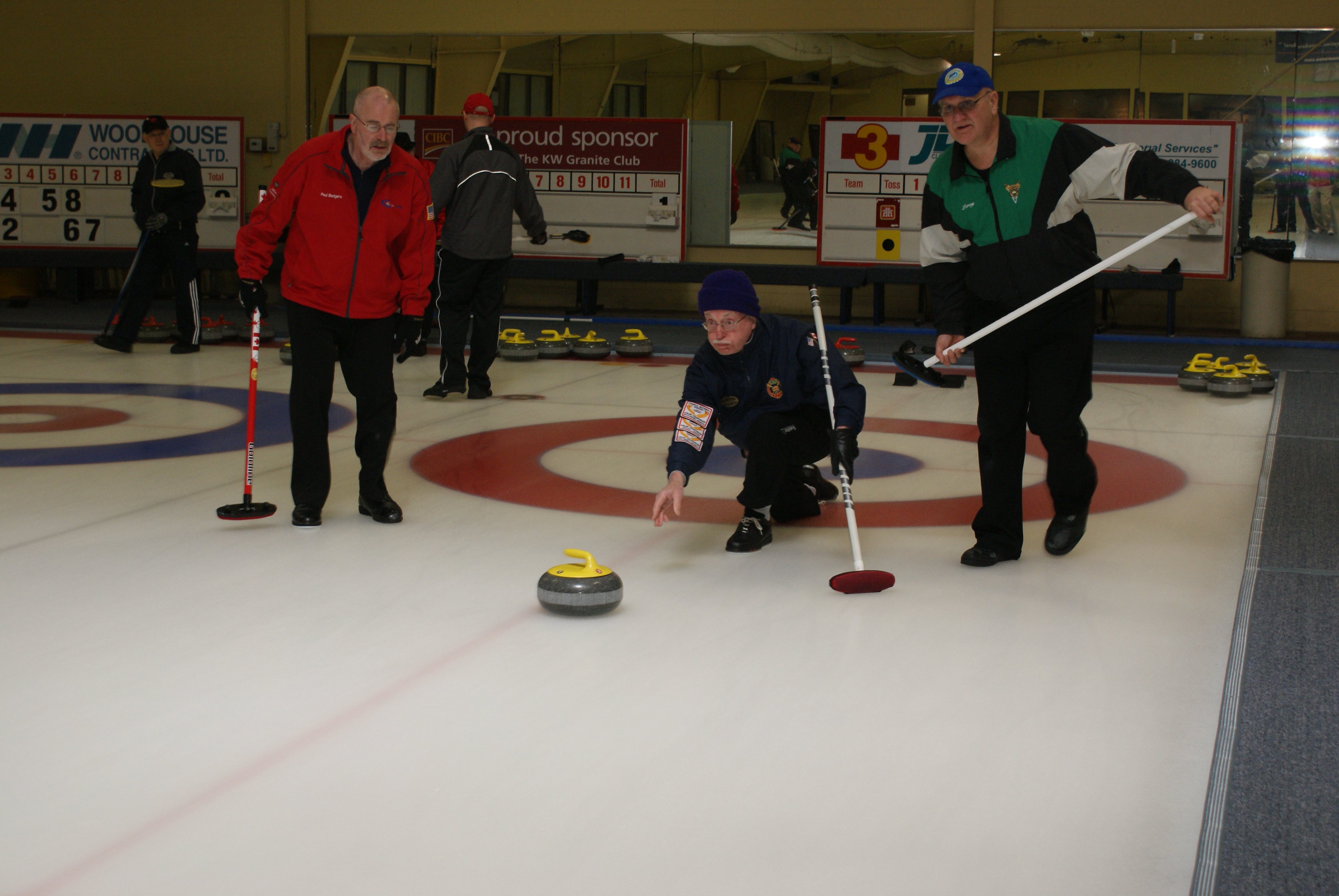 Pete Sylvain delivers the rock while Paul Badgero and Leroy Bliven prepare to sweep.