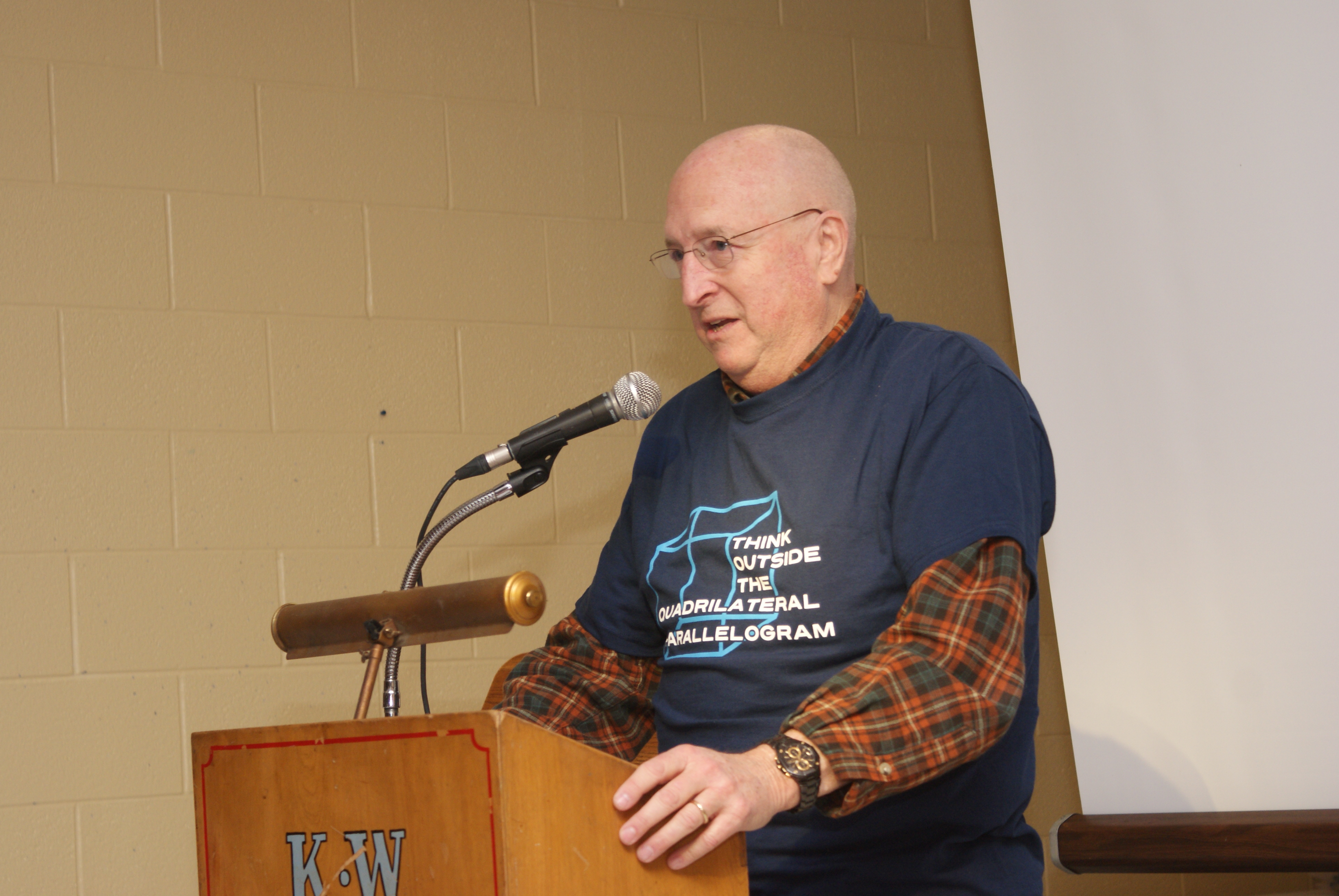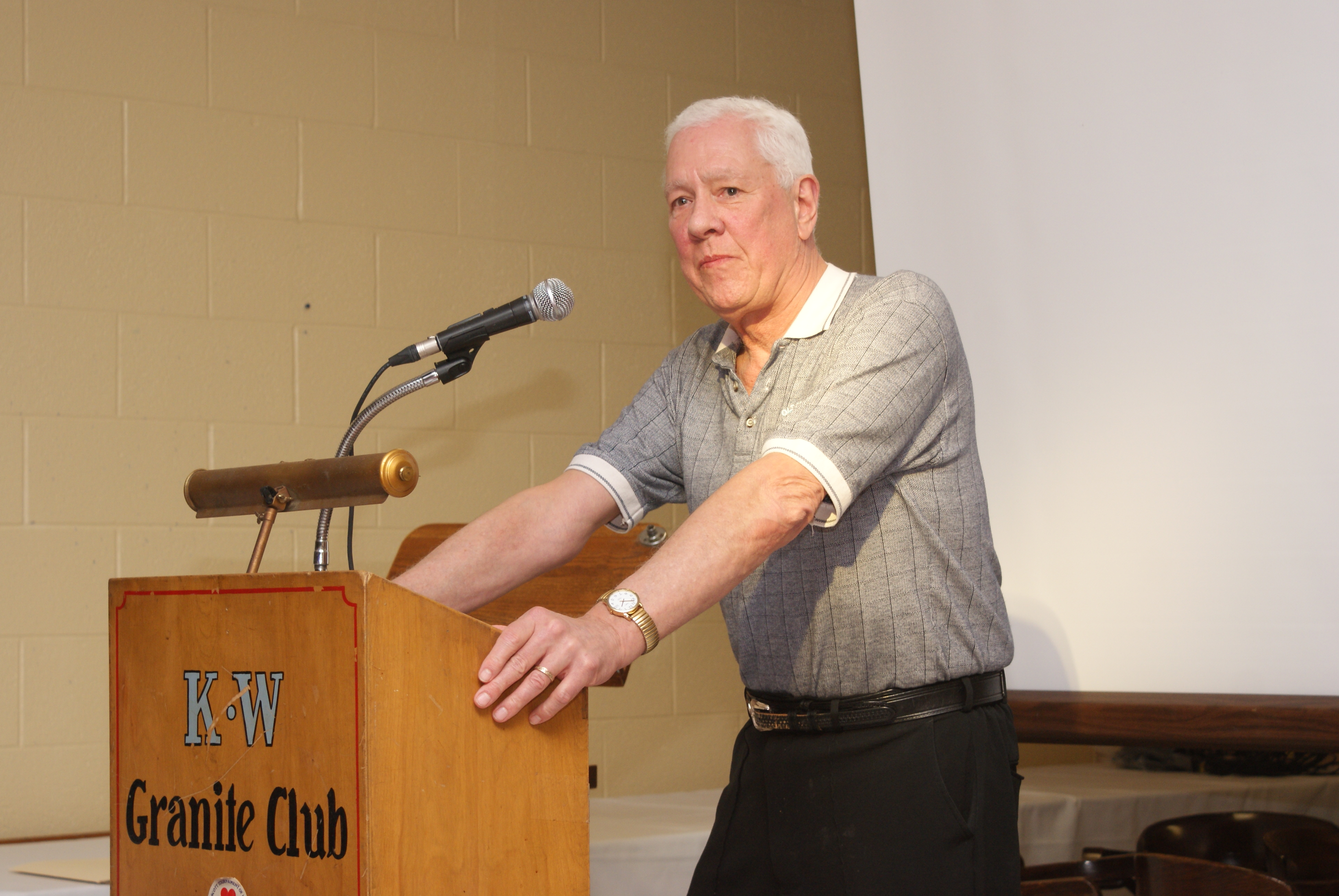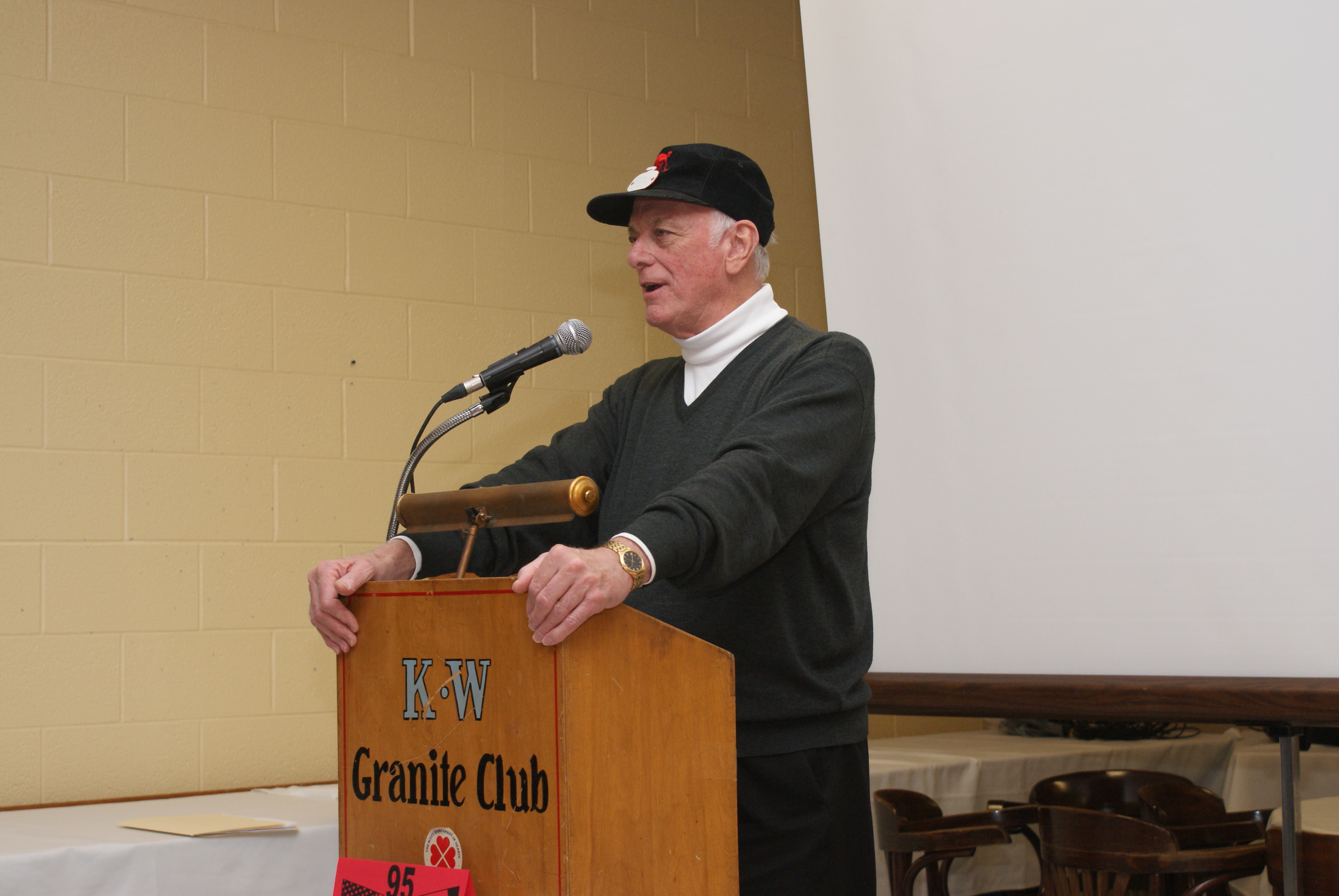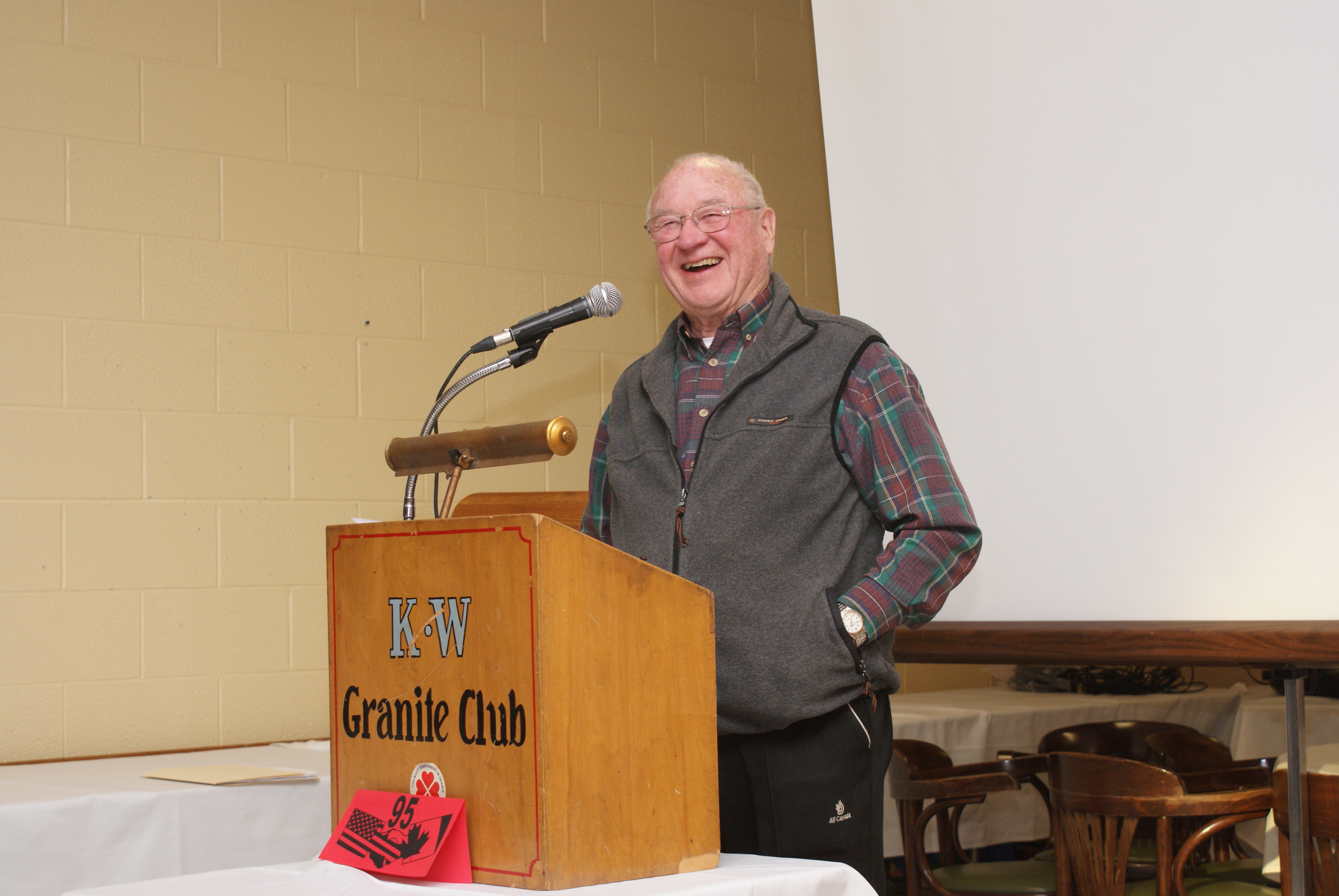 Gord McConnell introducing the members of the Saturday morning luncheon and curling club who join the exchange in Kitchener for lunch on Saturday.
