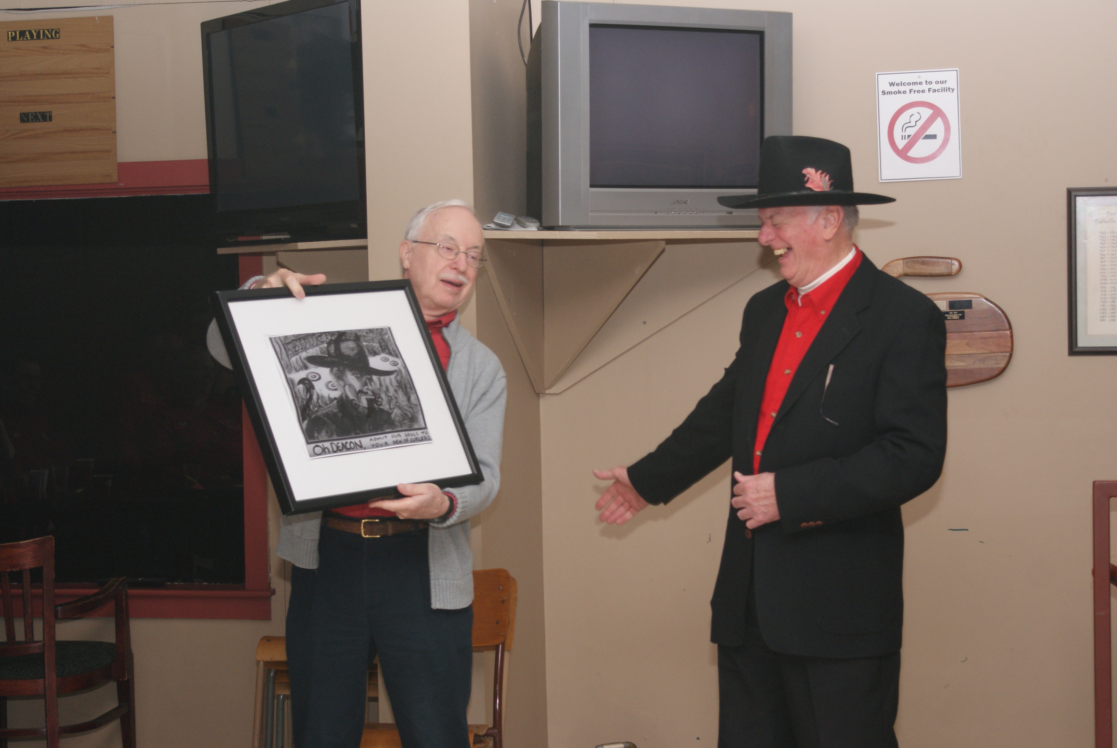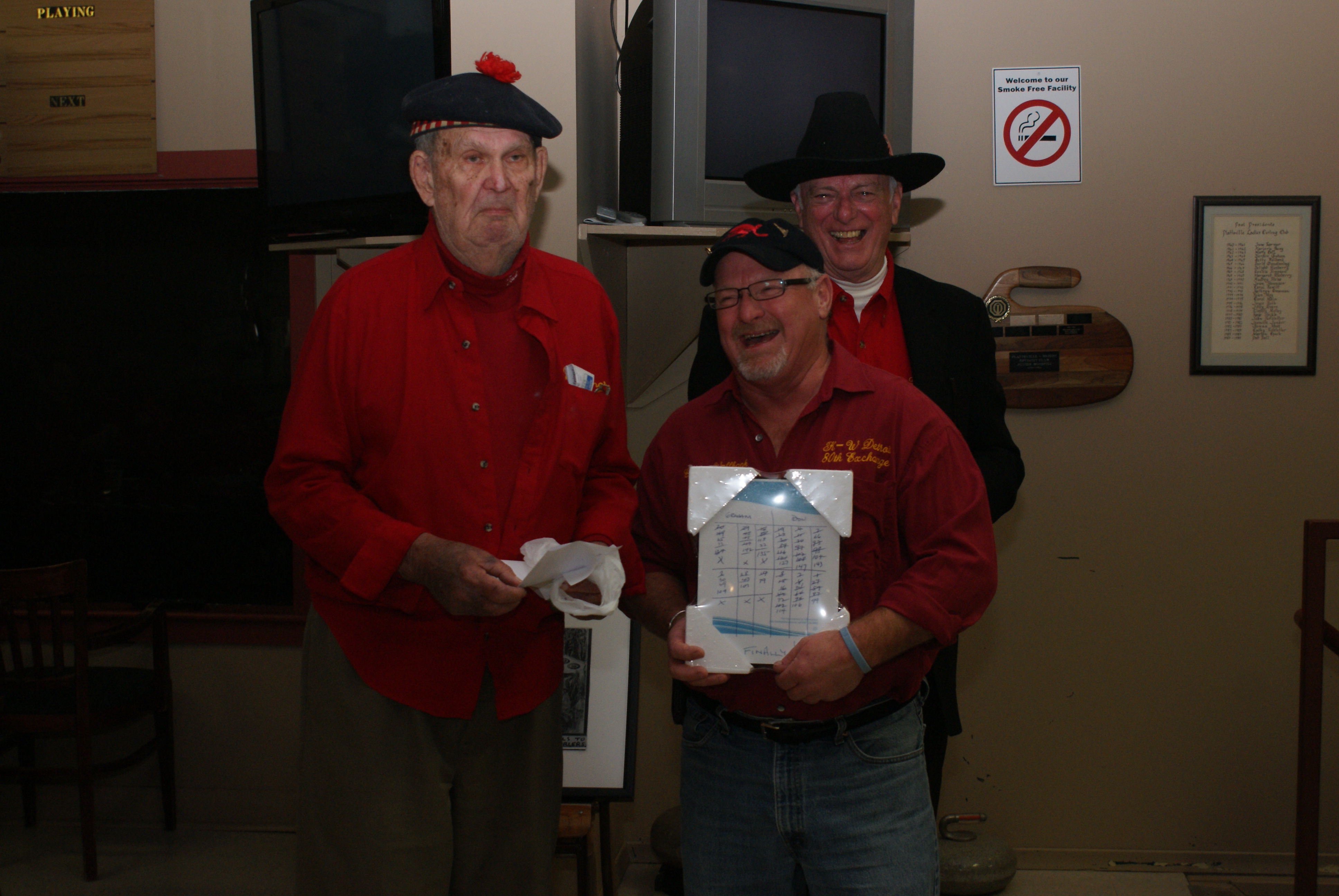 It is quite obvious who the loser of the gin rummy games was – Joe Livermore. Graham Wallbank holds a laminated version of the scorecard while Don Fanstone watches. Joe is the usual winner of the card games but, this year Graham won.
