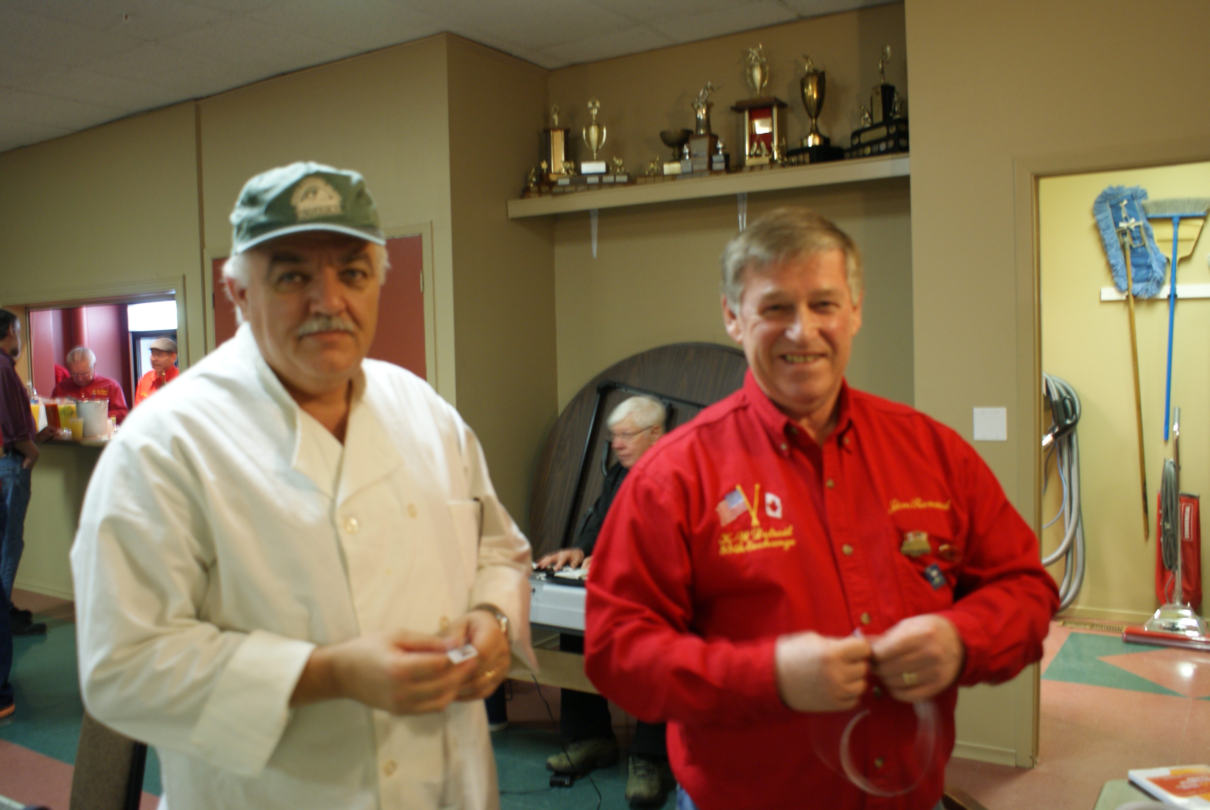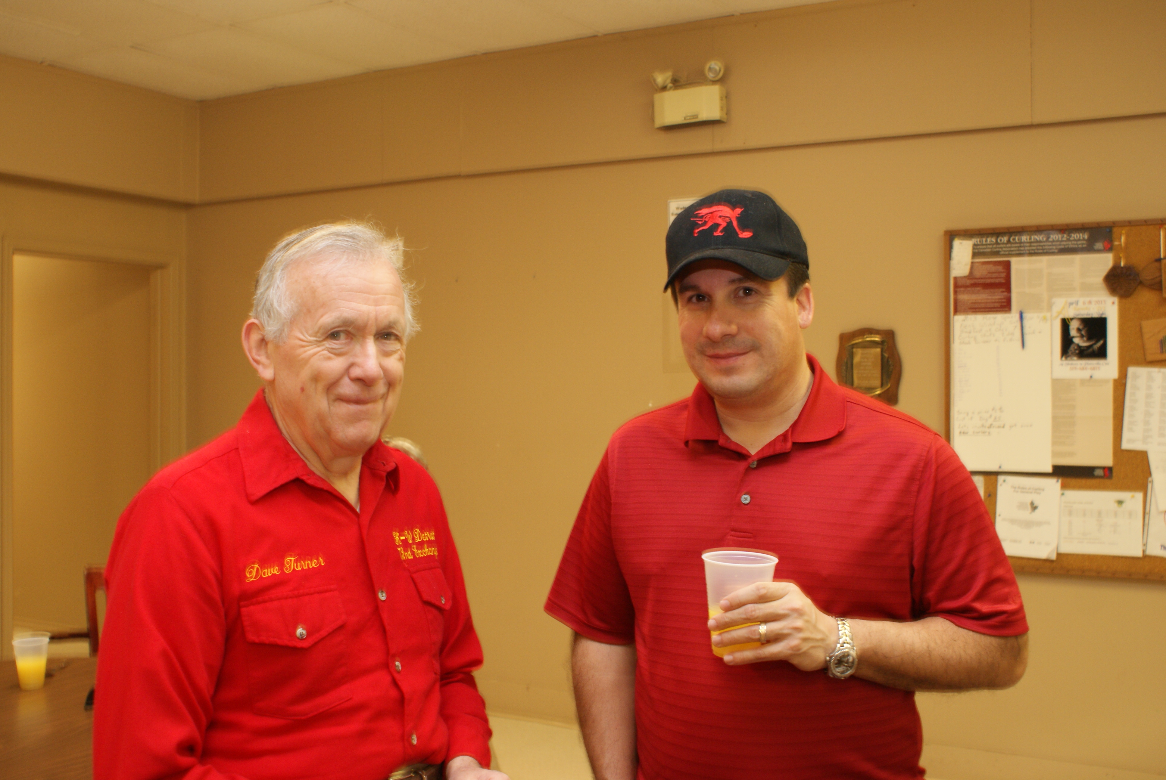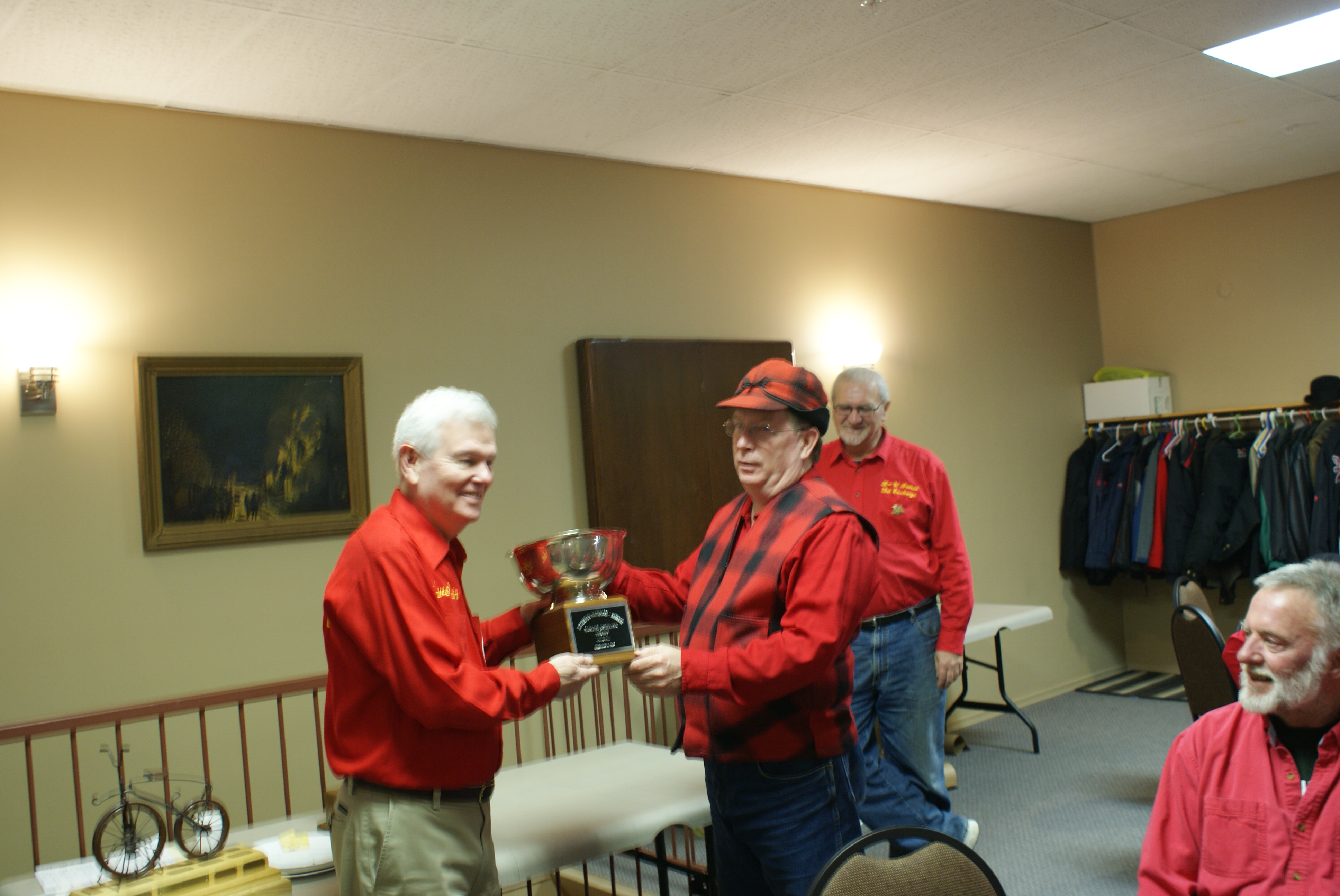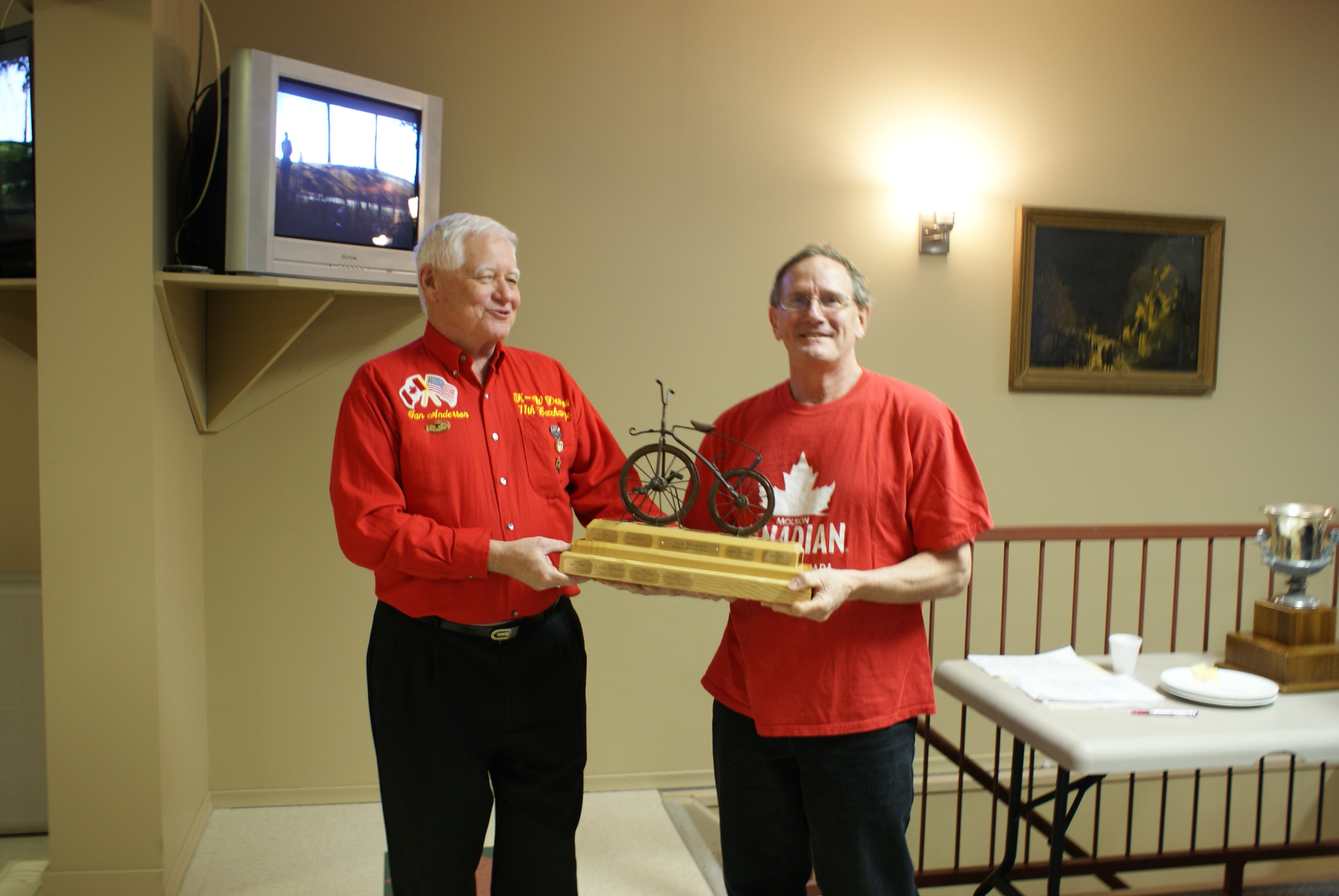 As a fitting ending to the weekend Dave Cain accepts the exchange trophy from Joe Bonfoey. The trophy goes to the winner of the curling competition. Thankfully the trophy showed up this year.