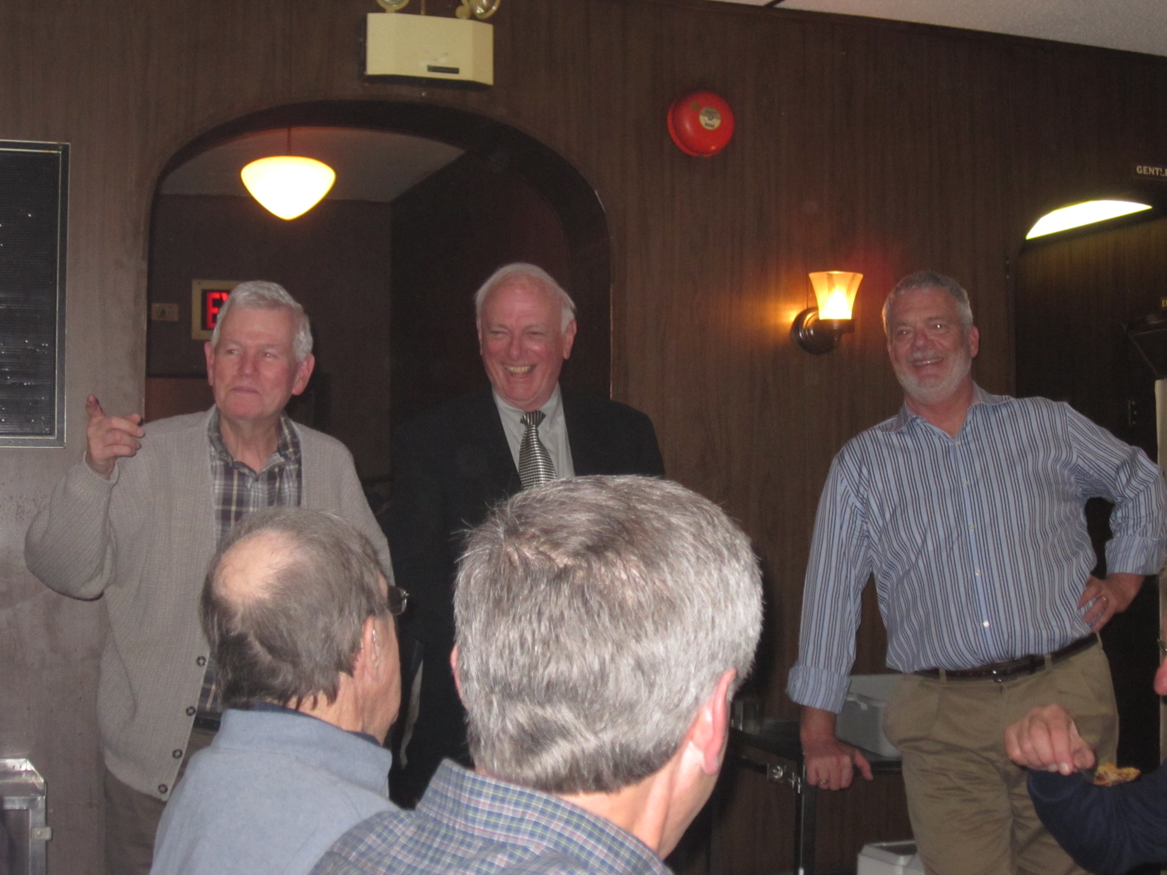 At dinner Dave Cain is pointing to the culprit (offense unknown). Don Fanstone and Scott Rogers find it amusing.