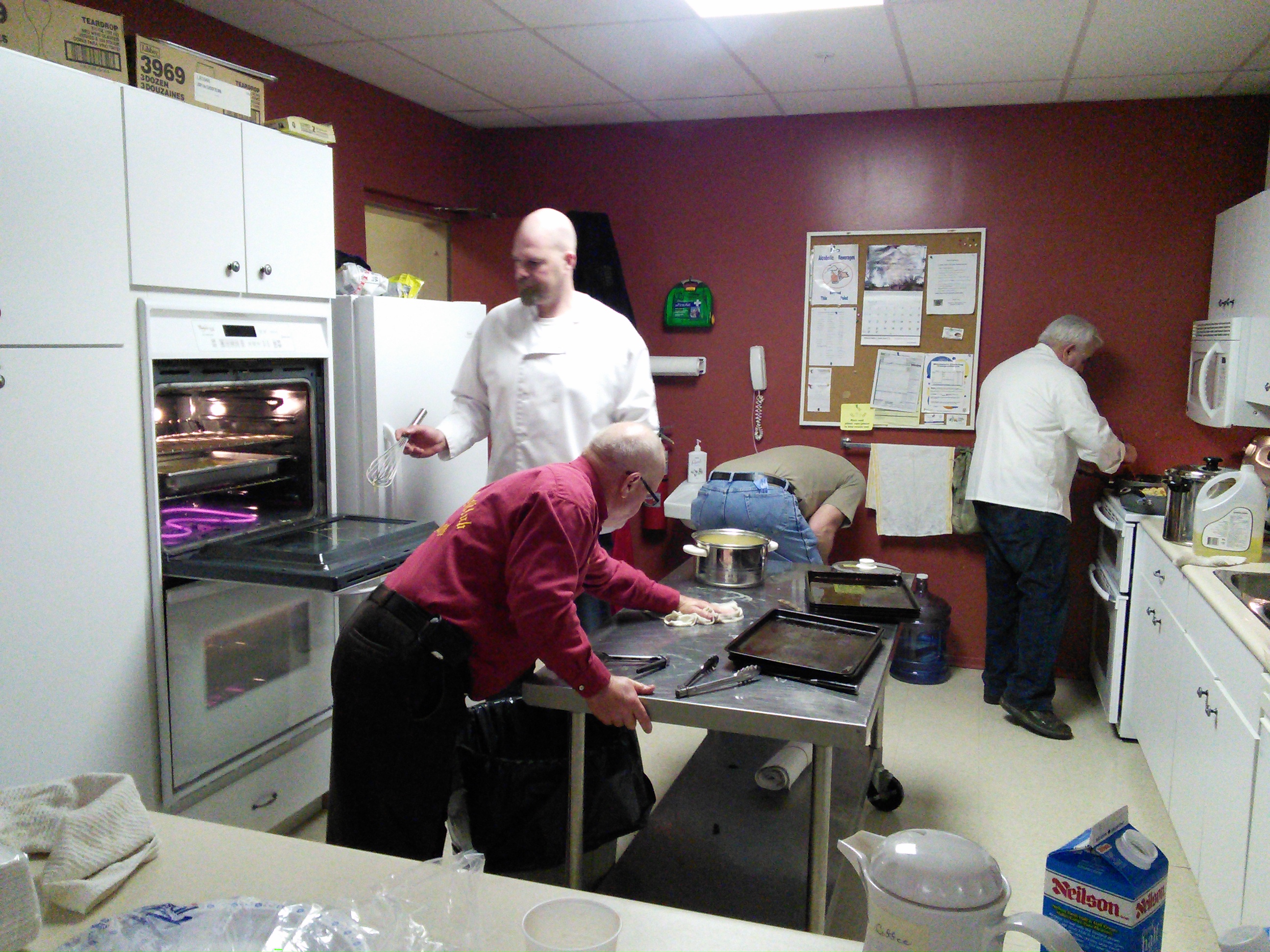 The kitchen crew calmly prepare the breakfast buffet: Graham Wallbank cleans up, Dan Glendinning checks the bacon in the oven, Cec Hofstetter is bent over the garbage pail and Brady Code makes sure that the eggs are not runny!