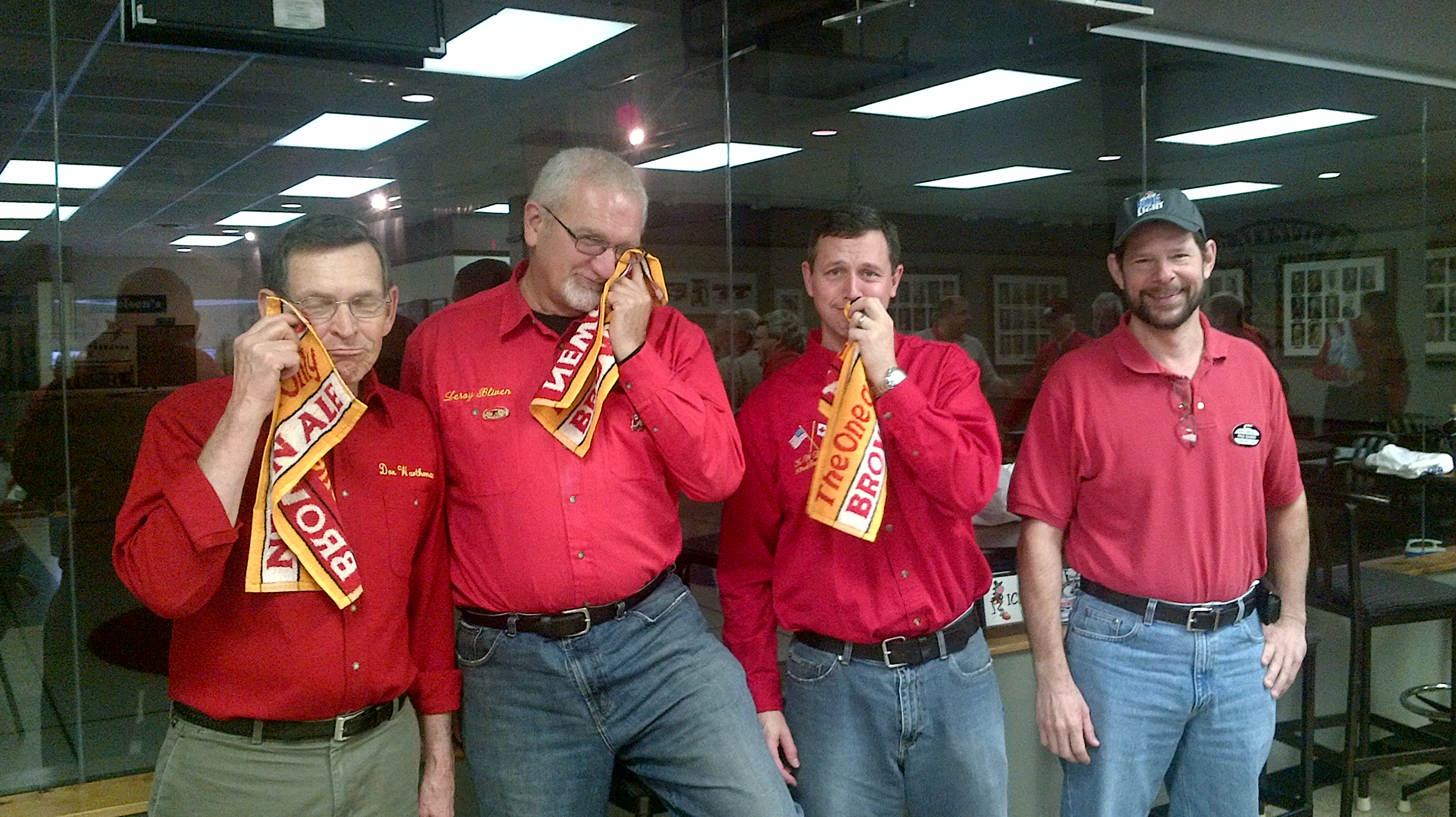An appropriate ending to the pictures.The Detroit team of Don Warthman, Leroy Bliven, Jim Morris and Paul Gaines were presented with crying towels after losing their afternoon game 12-1 against the Plattsville tigers. They must have only had 3 towels left at the club!