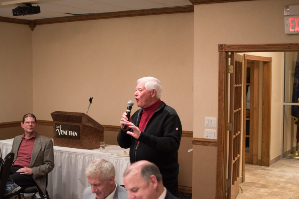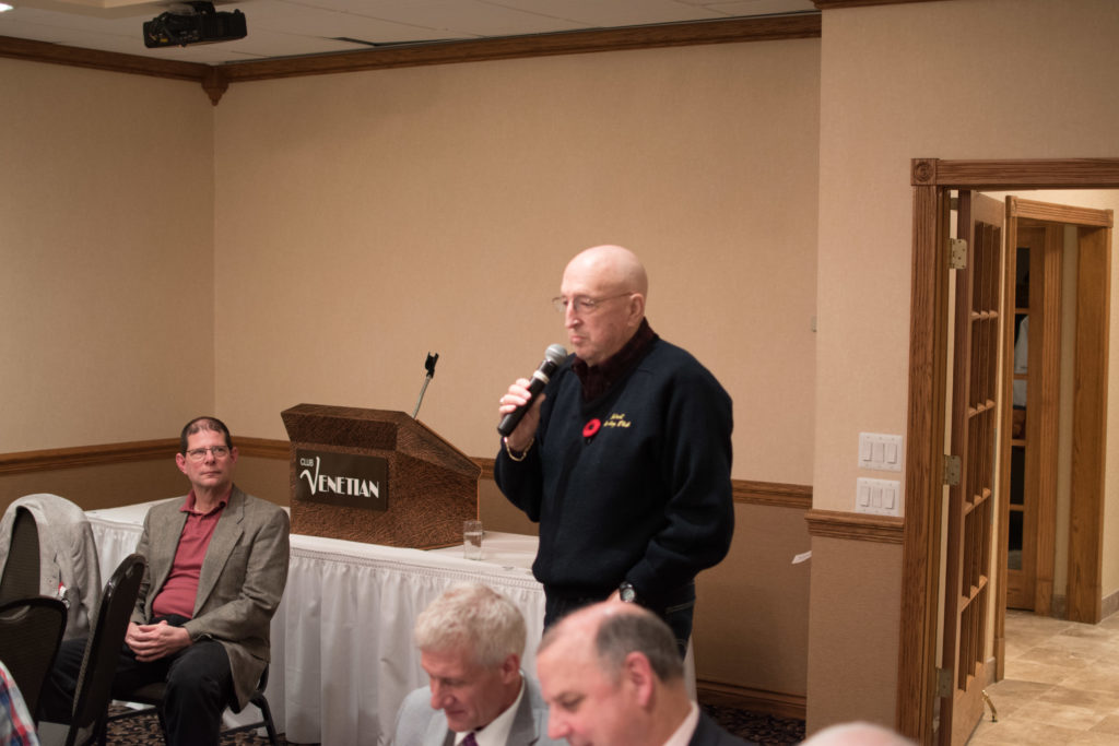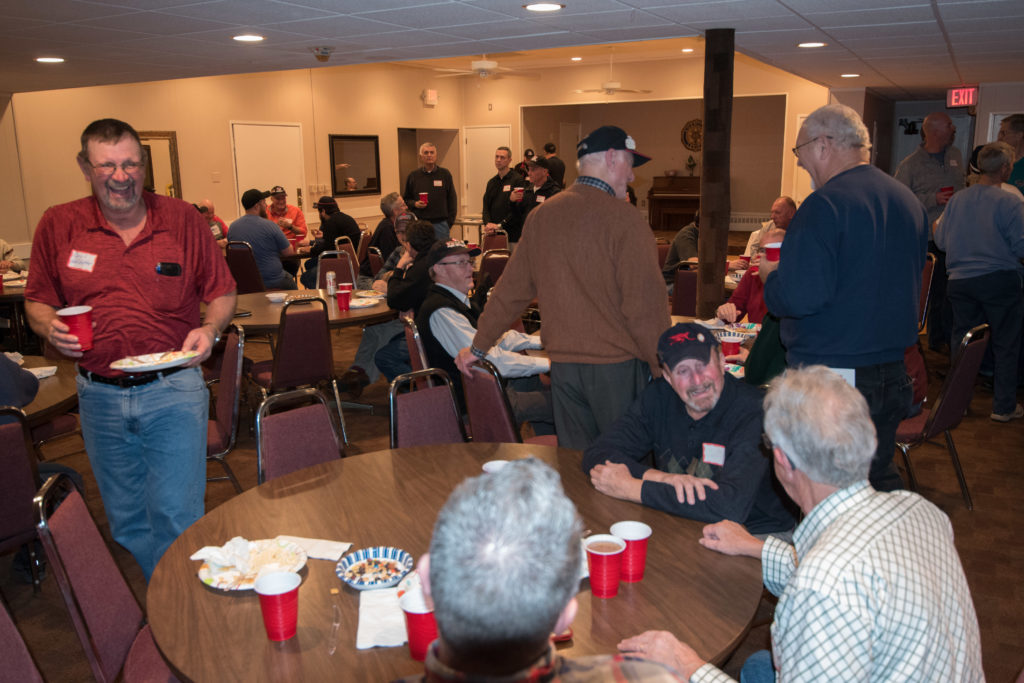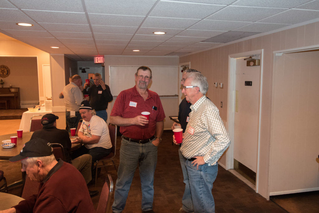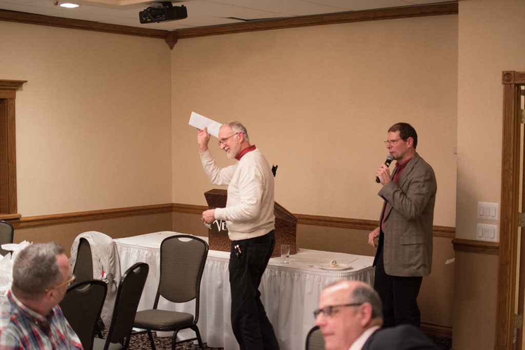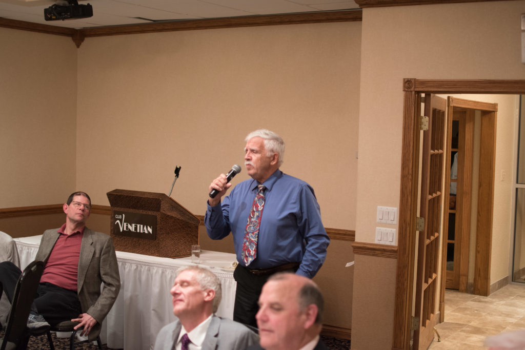 Cec & Dan enjoy the great corned beefClockwise from bottom left: Don Sloat, Dave Turner, John Danckeart, Peter Hartill, Herb Millard, and Brian Gleiser.Joe Bonfoey trying to make a point!Clockwise from bottom left: John Martin, Marcus Baker, Dallas Schneider, Paul Sandford, Bob Kennedy, Ken Zyrd and Marty VerhoevenDave Cain makes up teams.Clockwise from bottom left: Frank, Vack, Doug, John and Hugh.Josh and Duncan have a private chat.Sitting with Joe are Kevin, Luc and Matt.In Front: Kevin, Luc and Matt. Behind are Cec and Dan.Pat, Joe and BillGordy keeps Chuck and Leroy interested.Ron with Peter and DonVac is being introduced by Doug.It looks like Dallas is watching the footbal game.These guys don’t seem to be interested in the football game.Paul Gaines our master of ceremonies laughs at one of his jokesLuc another new exchange member is introduced by MattBob tells another storyGreat shoes Rick!