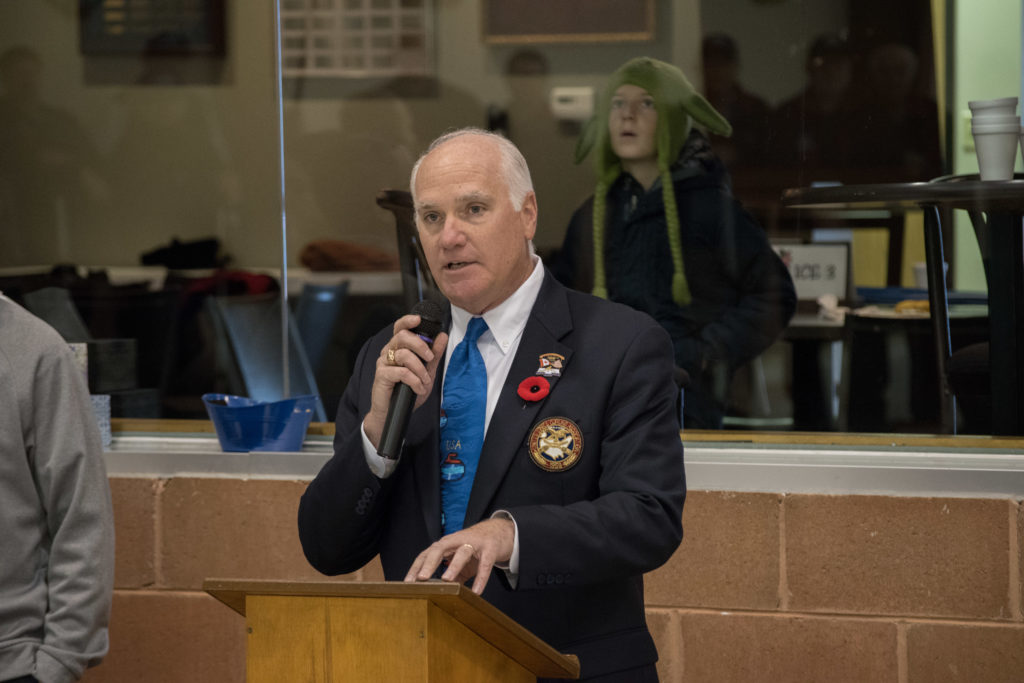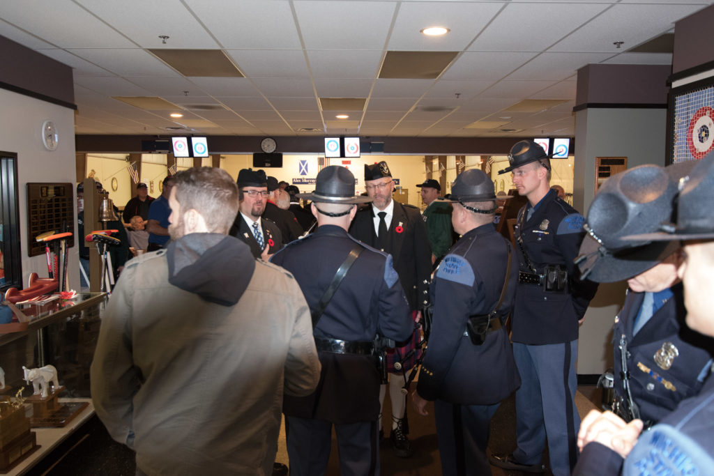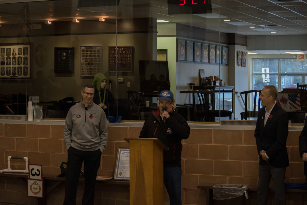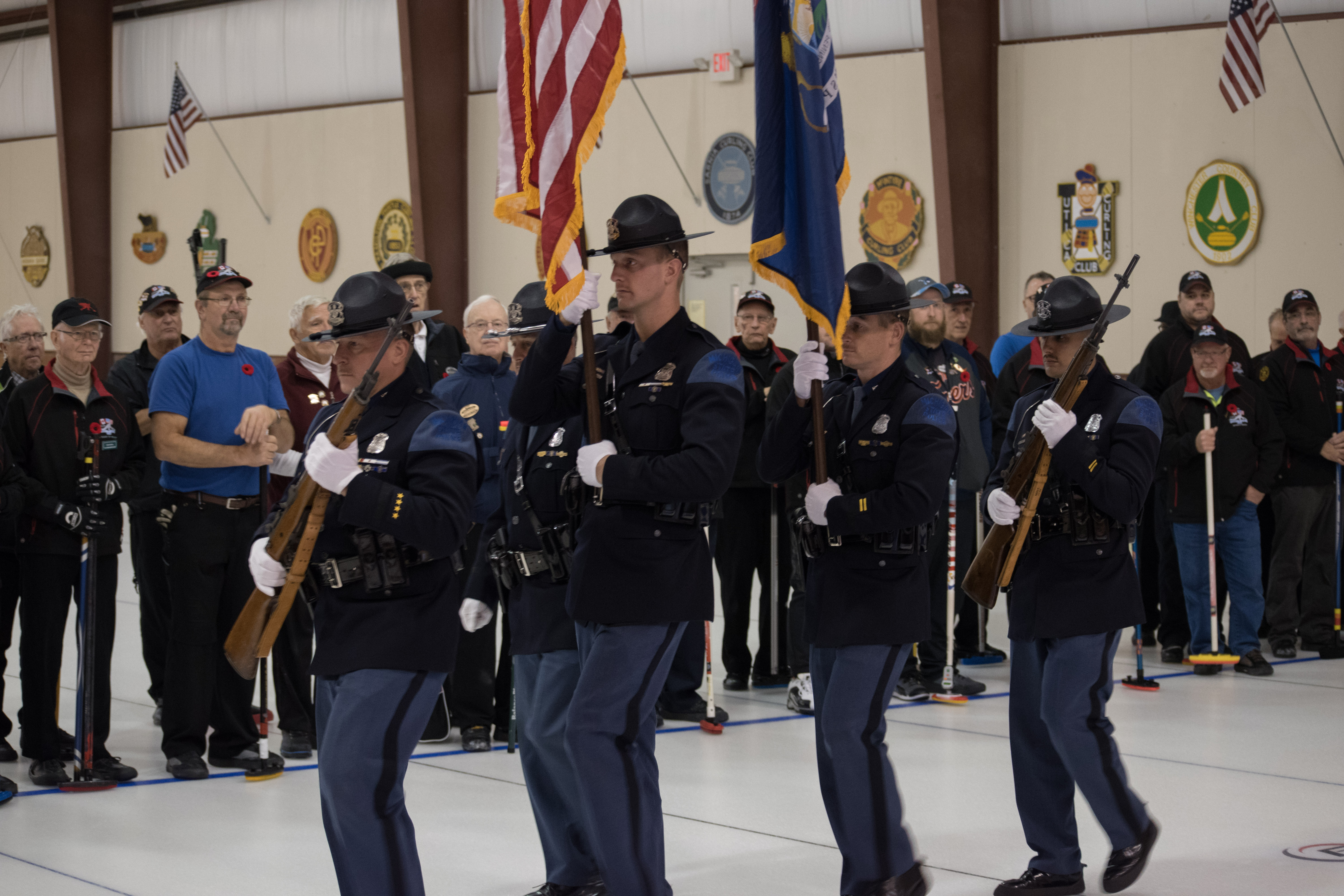 Michigan State Troopers provided the color guard and came prepared to take off in a hurry.The state police discuss the legality of bagpipes being played indoors.Gathering before the ceremonies are Marcus Baker Don Sloat, Ken Zyrd and Dave Turner.Waclaw Trebascz, Don Fanstone, Richard Lepping, Paul Badgero, Jim Renaud and John MartinPaul Gaines and the pipers discuss approach for the ceremonies.Paul tries to explain that he is not going to play the bagpipes!The 4 sheets of ice are ready for the action.The ice maker Eric KortebeinLong time exchange member Joe Livermore with Jim MorrisThree of the dignitaries chat before the ceremonies: David Coulter, Mayor of Ferndale; Richard Lepping, USCA Chairman and Douglas George, Consul General of CanadaThe dignitaries chat with Joe LivermoreThe pipers lead the colour guard in.The colour guardWalking down the narrow boardsThe line up.The rest of the line upPipers playingOne of the perks of helping to organize things is getting to do the toast to the pipers!