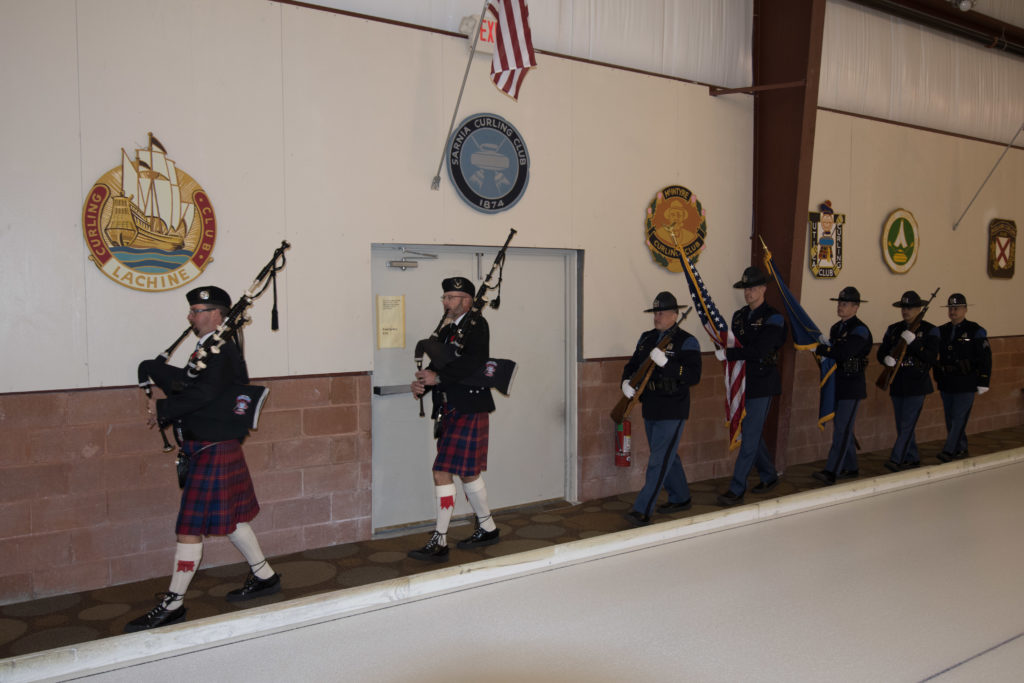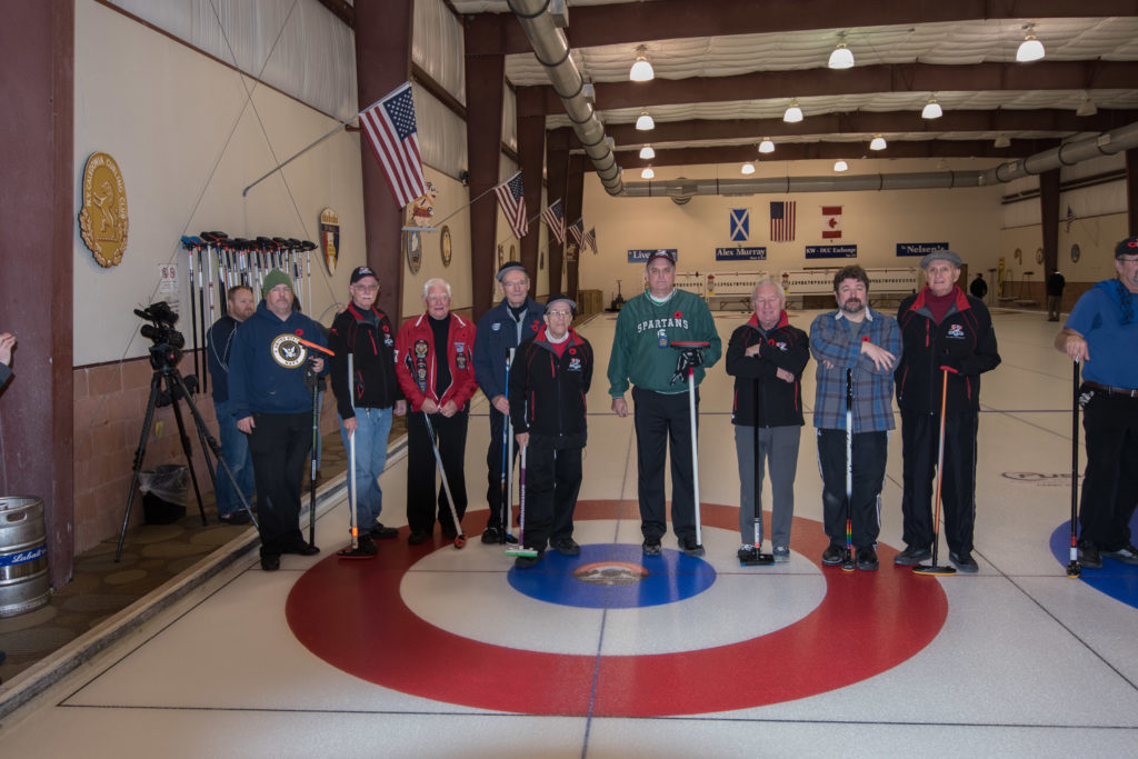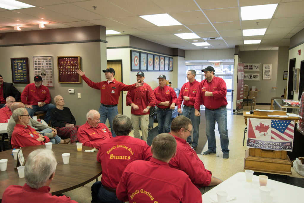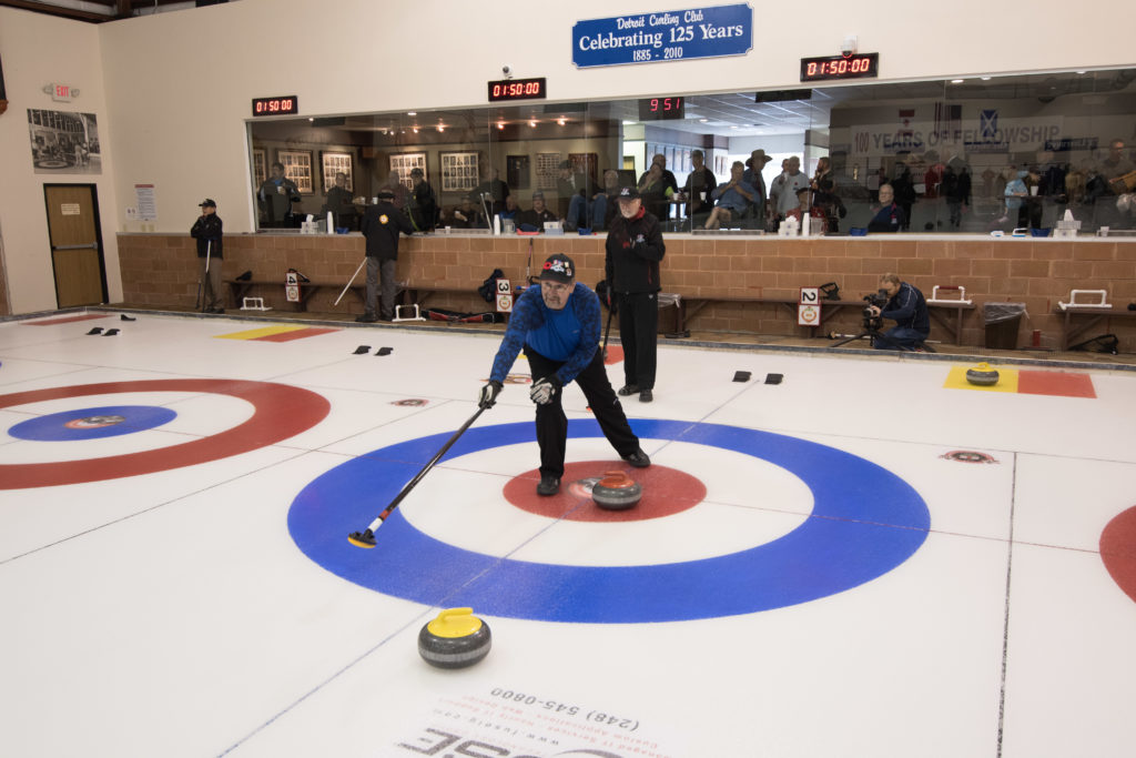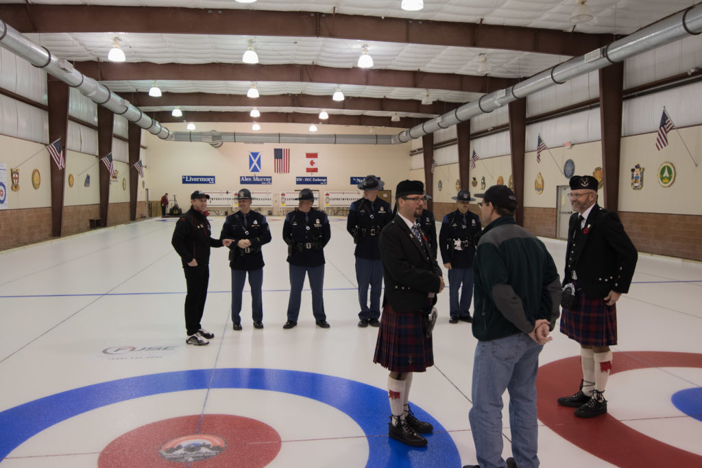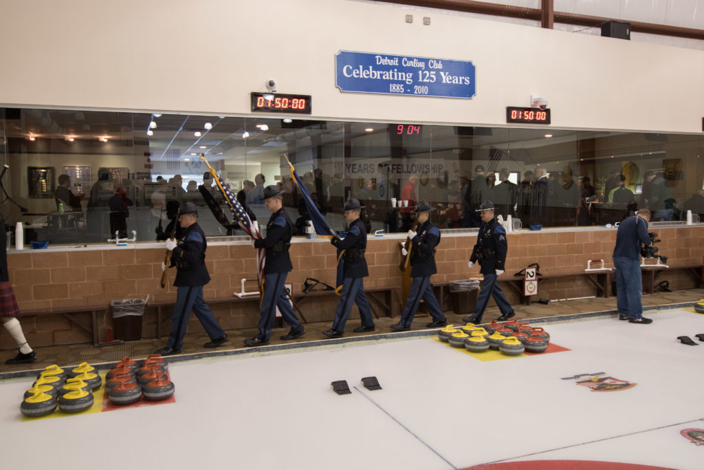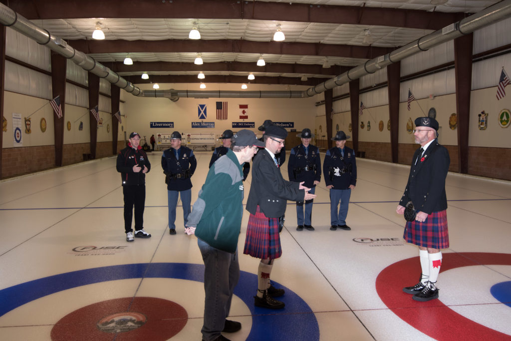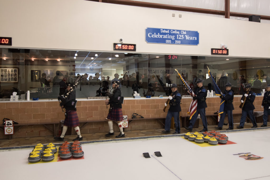 Jim Morris, President Detroit Curling Club; Douglas George, Consul General of Canada; Richard Lepping, Chairman, USCA; Richard Wittenberg, State Reresentative and David Coulter, Mayor of FerndaleIs everyone paying attention?Douglas George, Consul General of Canada brings greetings from Canada. He apologized on behalf of Justin Trudeau who was holidaying in the Bahamas.Richard Lepping, Chairman, USCA encouraging the gathered to continue this event for another 100 years!Bret Jackson, Joe Livermore and Damien BuchowskiRichard Wittenberg, State Representative presents a certificate celebrating the 100th to Jim Morris President of the Detroit Curling ClubDavid Coulter, Mayor of Ferndale brings greetings from the city.Bob MacMillan chair of the KW Granite exchange team gets a laugh from the attendees.The pipers play to end the ceremonies.The State Troopers lead the curlers off the ice.Bob MacMillan holds the broom for the KW Granite ceremonial rock throw.Ian Anderson prepares to throw the KW Granite ceremonial rock, as Graham Wallbank and Paul Sandford get ready to sweep.Ian is a little wobbly on the delivery. Where is his stick?Somehow Ian’s rock ended up over the button?Joe Livermore holds the broom for the Detroit ceremonial rock throw.Dave Nelsen delivers the Detroit ceremonial rock, with sweepers Dallas Schneider and Dave Hesse.Not to be outdone the Detroit rock covered more of the button!A fine group for the 100th!