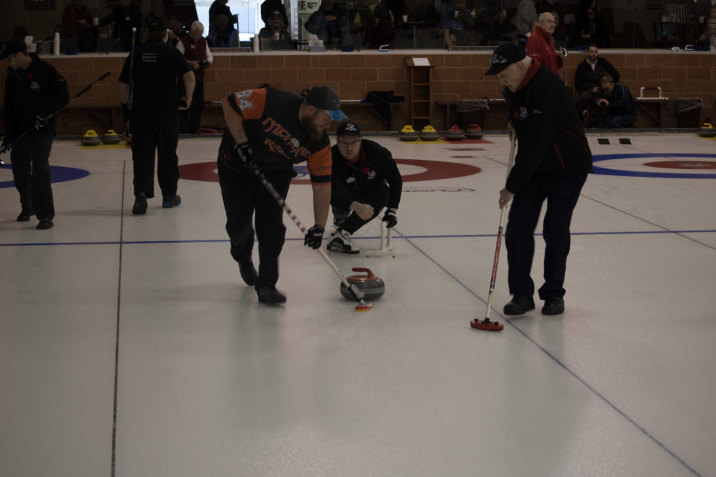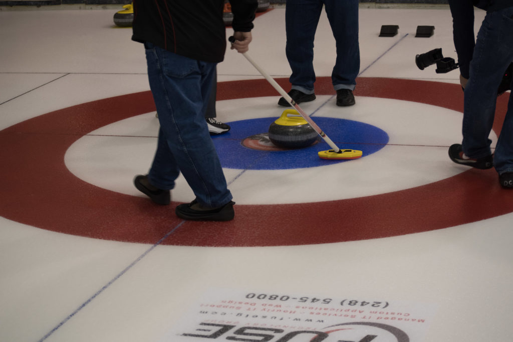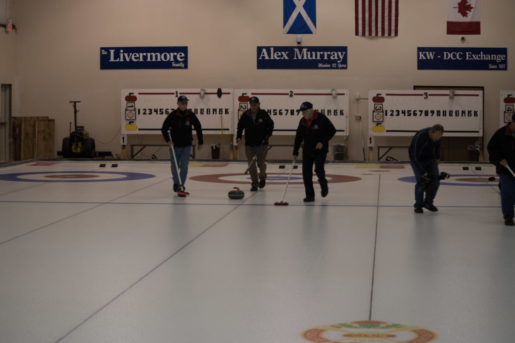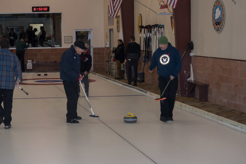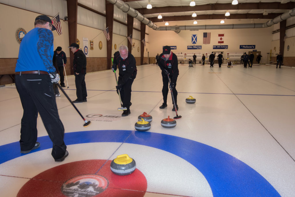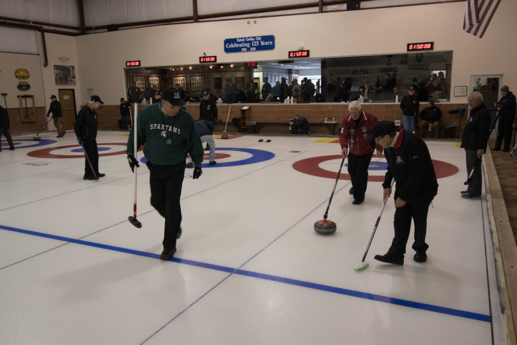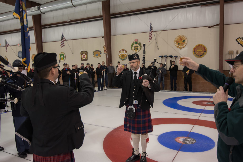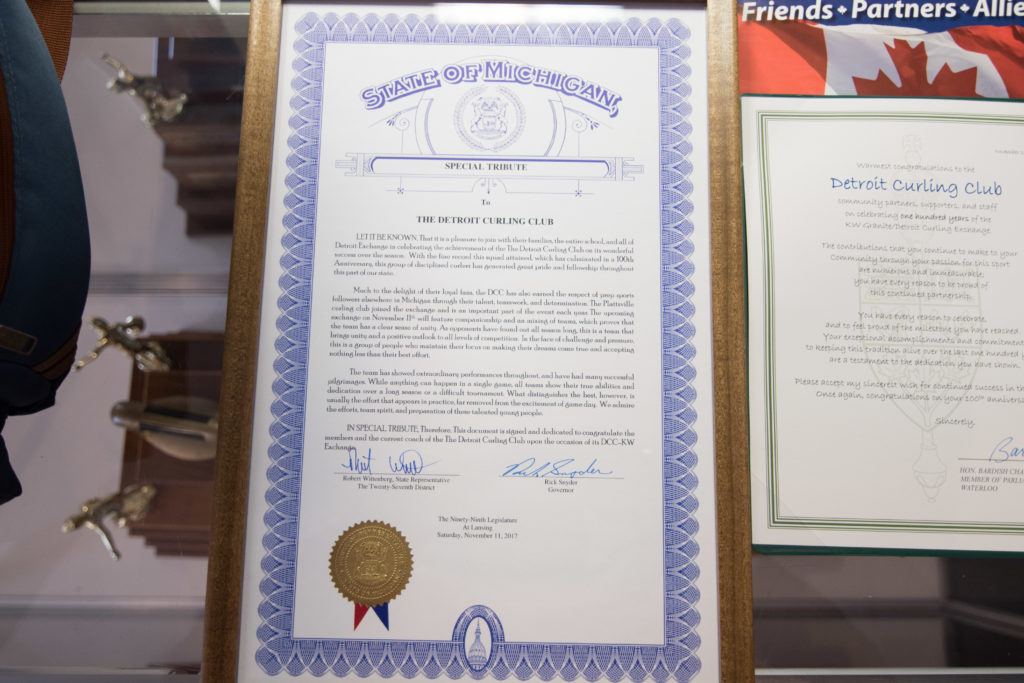 Jim Morris, President Detroit Curling Club; Douglas George, Consul General of Canada; Richard Lepping, Chairman, USCA; Richard Wittenberg, State Reresentative and David Coulter, Mayor of FerndaleIs everyone paying attention?Douglas George, Consul General of Canada brings greetings from Canada. He apologized on behalf of Justin Trudeau who was holidaying in the Bahamas.Richard Lepping, Chairman, USCA encouraging the gathered to continue this event for another 100 years!Bret Jackson, Joe Livermore and Damien BuchowskiRichard Wittenberg, State Representative presents a certificate celebrating the 100th to Jim Morris President of the Detroit Curling ClubDavid Coulter, Mayor of Ferndale brings greetings from the city.Bob MacMillan chair of the KW Granite exchange team gets a laugh from the attendees.The pipers play to end the ceremonies.The State Troopers lead the curlers off the ice.Bob MacMillan holds the broom for the KW Granite ceremonial rock throw.Ian Anderson prepares to throw the KW Granite ceremonial rock, as Graham Wallbank and Paul Sandford get ready to sweep.Ian is a little wobbly on the delivery. Where is his stick?Somehow Ian’s rock ended up over the button?Joe Livermore holds the broom for the Detroit ceremonial rock throw.Dave Nelsen delivers the Detroit ceremonial rock, with sweepers Dallas Schneider and Dave Hesse.Not to be outdone the Detroit rock covered more of the button!A fine group for the 100th!