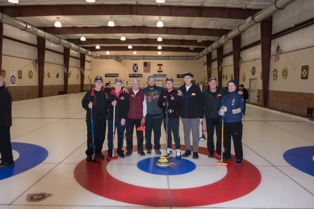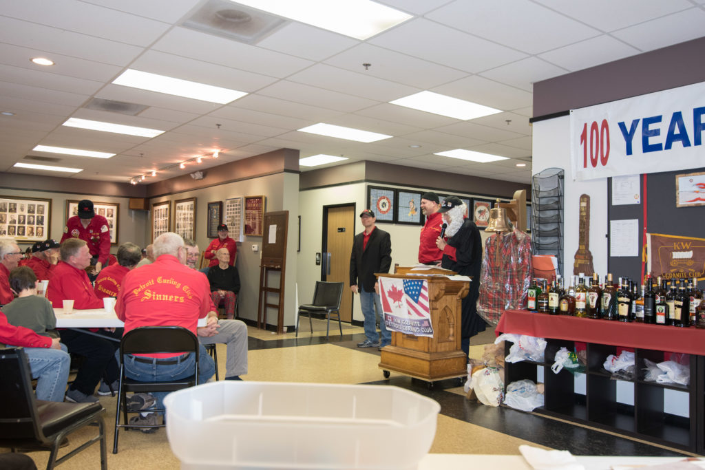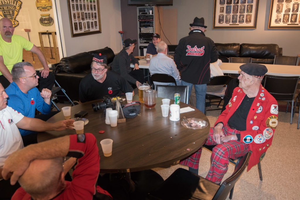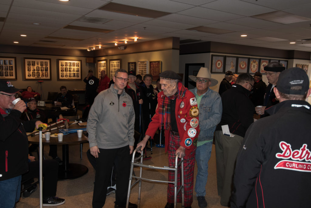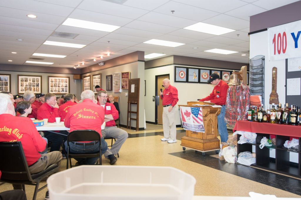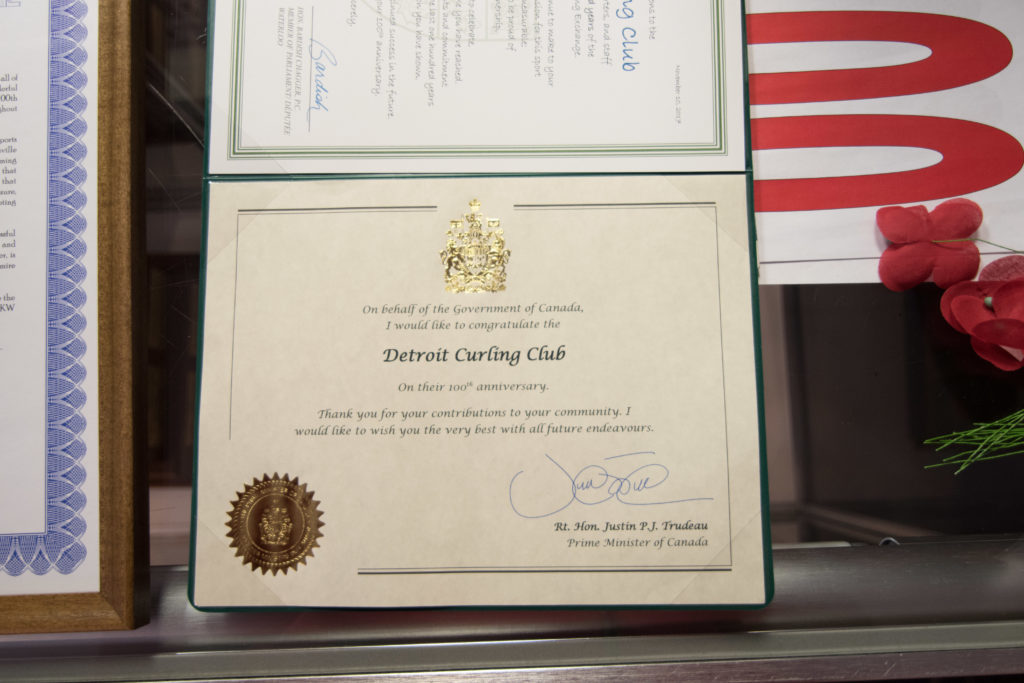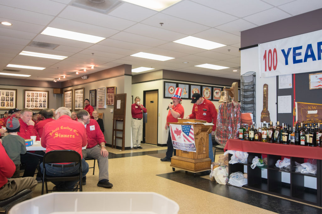 On Ice #1: Hugh Smith, Dallas Schneider, Ian Anderson, John Martin, Norm Green, Gordy Loud, Paul Sandford, Paul Carmouche and Mike RogalaOn Ice #2: Cec Hofstetter, Paul Badgero, Herb Millard, John Danckaert, Sam Kilby, Brian Gleiser, Pat Cannon and Peter HartillOn Ice #3: Matt Schumacher, Dave Hesse, Marcus Baker, Duncan Whitmore, Nate Glitman, Frank Duffey, Marty Verhoeven and Pete SylvainOn Ice #4: Luc Cormier, Kevin Bradley, Dave Nelsen, Graham Wallbank, Kevin Ingraham, Ron Boehmer, Dave Urbiel and Rick HarrisonIan Anderson wonders where his sweepers are?Showing fine form is Paul Sandford,while John Martin is ready to sweep.John Martin and Hugh Smith trying to decide whether to sweep.Sam Kilby and Pat Cannon figure this rock does not need sweeping.Will the rock curl that much Dallas?Frank Duffey with Marty Verhoeven behind.Graham Wallbank is not giving much broom for this takeout as Dave Nelsen looks on.Marcus Baker shows great form as Matt Schumacher is ready to pounce. Pete Sylvain is a little more patient.Marty reaches out to Dave NelsenNate Glitman delivers as Duncan Whitmore and Dave Hesse sweep.Luc Cormier follows the rock down the ice while Kevin Bradley and Dave Urbiel wait.Waiting behind the glassDouglas George chats with Dave CainAppropriately near the bar are the pipers and Larry AubuchonIan Anderson delivers better using a stick. Gordy Loud and Norm Green look on.Paul Badgero is telling Brian Gleiser not to sweep yet.Are you sure you want the rock there Cec?Looks like a narrow port to go through John!Big sweeping from Matt and Marcus.Did Pat and Peter sweep hard enough to make the double for Cec?Everyone is sweeping this one!A good use for a broom Cec!Ian wonders what is going on – over there?Certificate from Gov’t of Canada signed by TrudeauState of Michigan certificateDan Glendinning, Leroy Bliven, John MacDonald and Jim RenaudBob MacMillan and Nick YamburaI see you too Jerry!Don Sloat and Ken ZyrdJoe Livermore and John SpencerJim Morris being interviewed by Fox Sports – see video clipRichard Lepping being interviewed.Is that stick hollow Bob?Bret and John in front 100th bannerTeams getting ready for the second draw in the morningDave Cain, Mike Rogala, Nick Yambura, Duncan Whitmore, Gerry Dolff, Ken Romanik and Kevn Ingraham.At 11am the Last Post was played by boy scout Matthew McDonnell and his father Sean. There wasn’t a dry eye in the clubDallas Schneider with Matthew and SeanYou are supposed to stretch after you exercise Dan!Brett Dubrick ready to deliverDave wonders where all the rocks came from?Duncan is a little shakeySam is focusedDave is determinedGreat style BrettPaul has his eyes on the broomGreat stick delivery from LesKevin rests between shotsJoe is in charge of the houseVac deliversYou are supposed to look at the broom Jim!Kevin & Gerry sweep hardNich has great style in delivery and clothesI guess all that stretching before the game worked for Dan!Unlike his brother, Bill is focused on the broom.He is still focused on the broom!