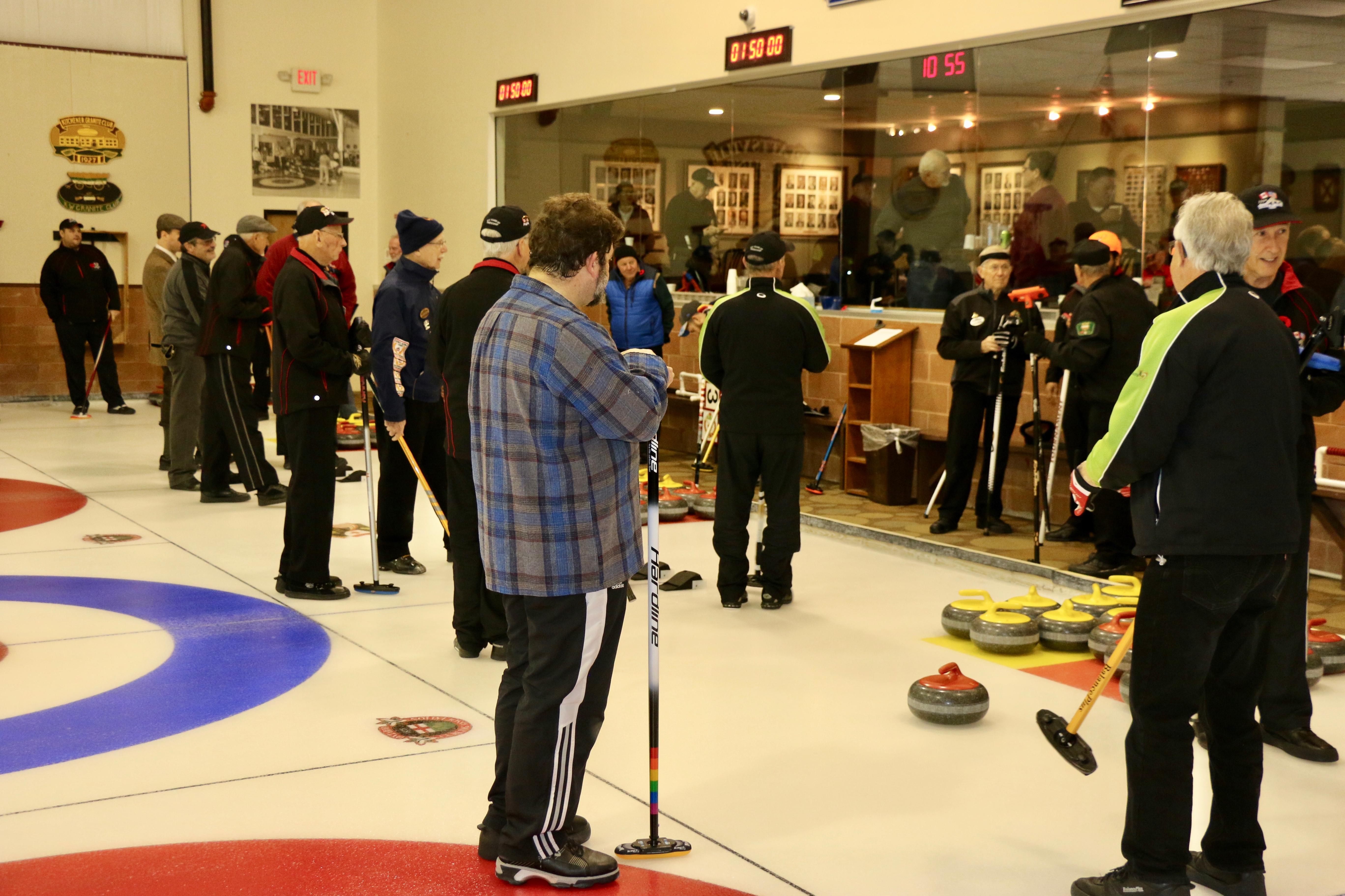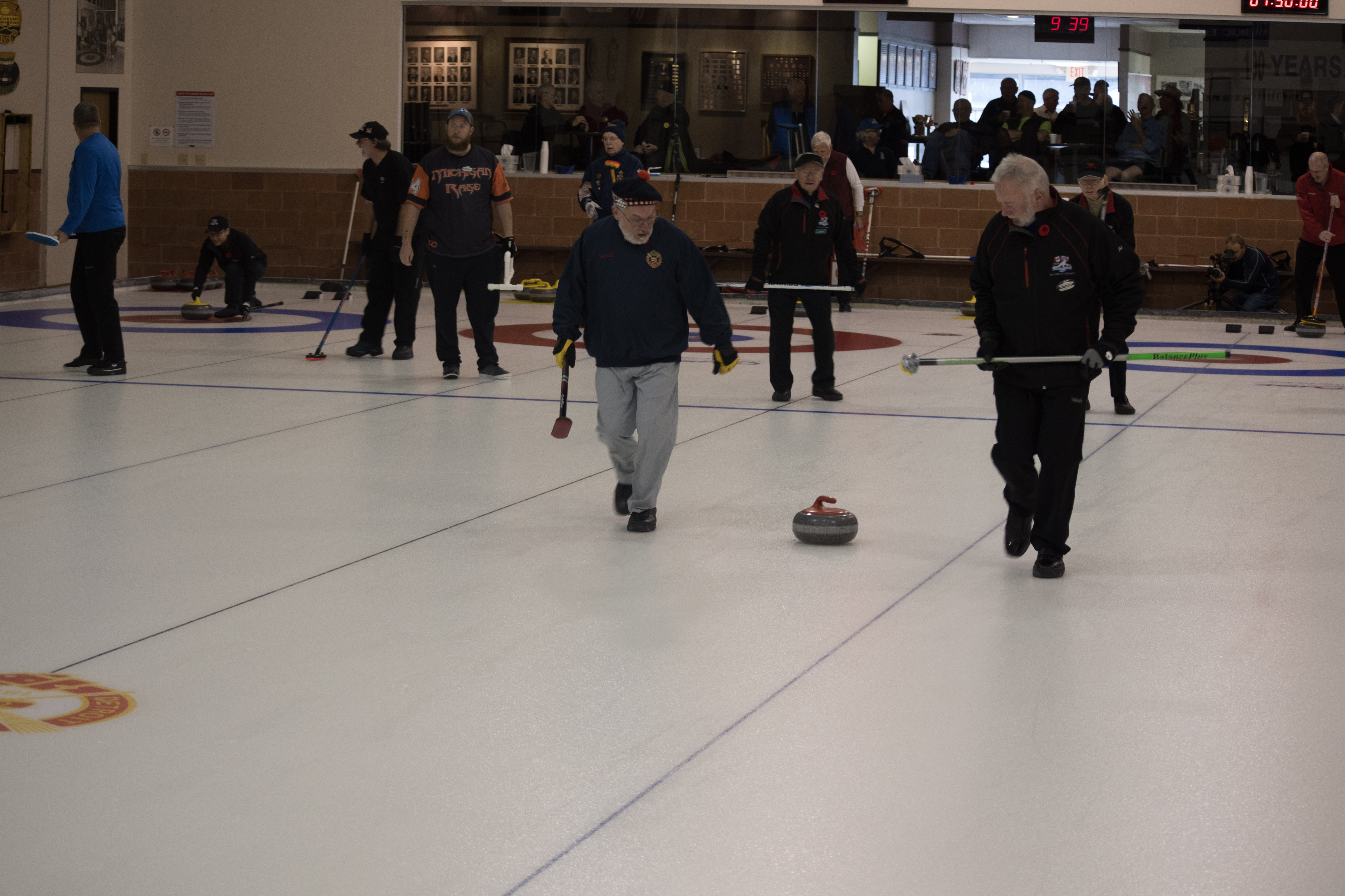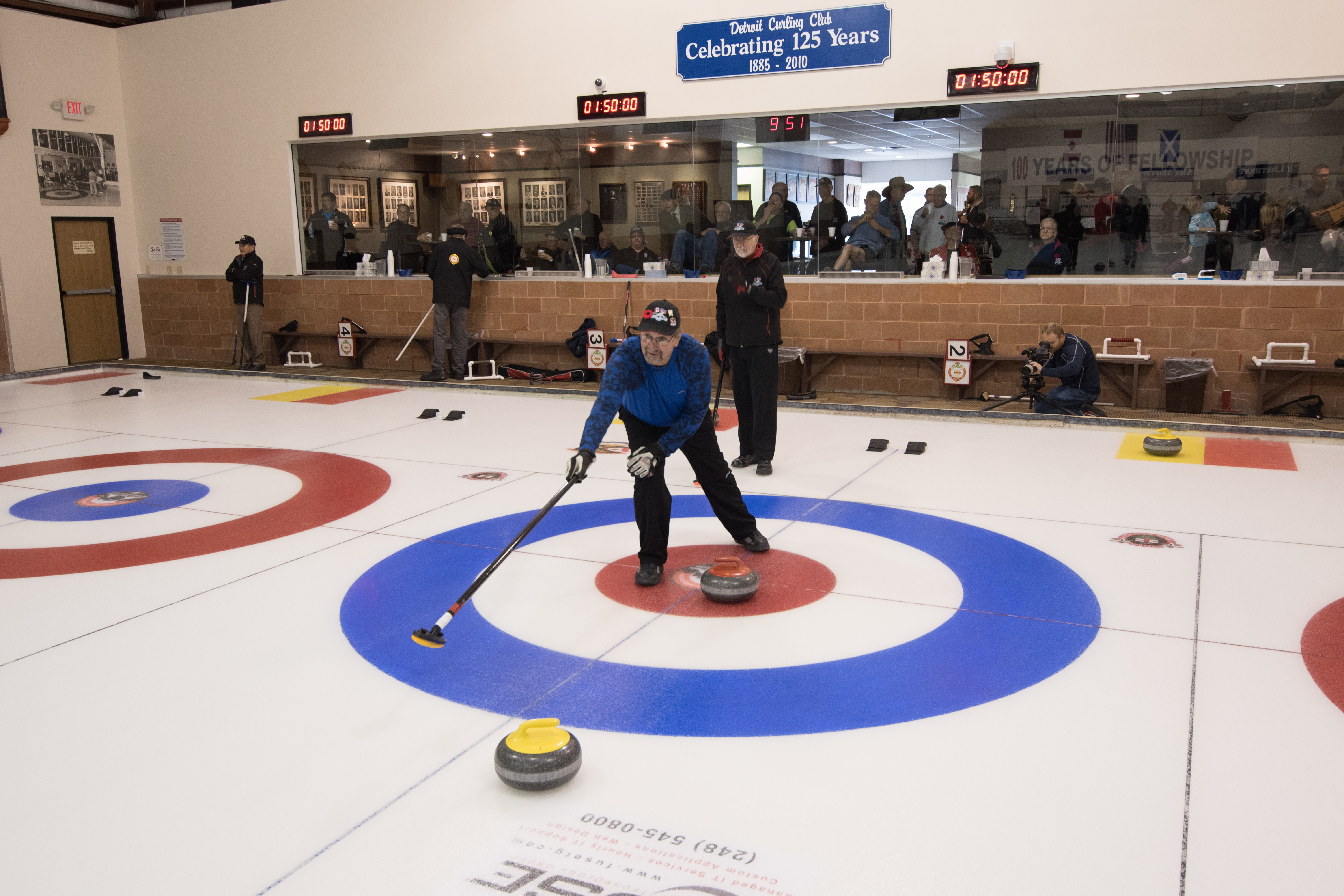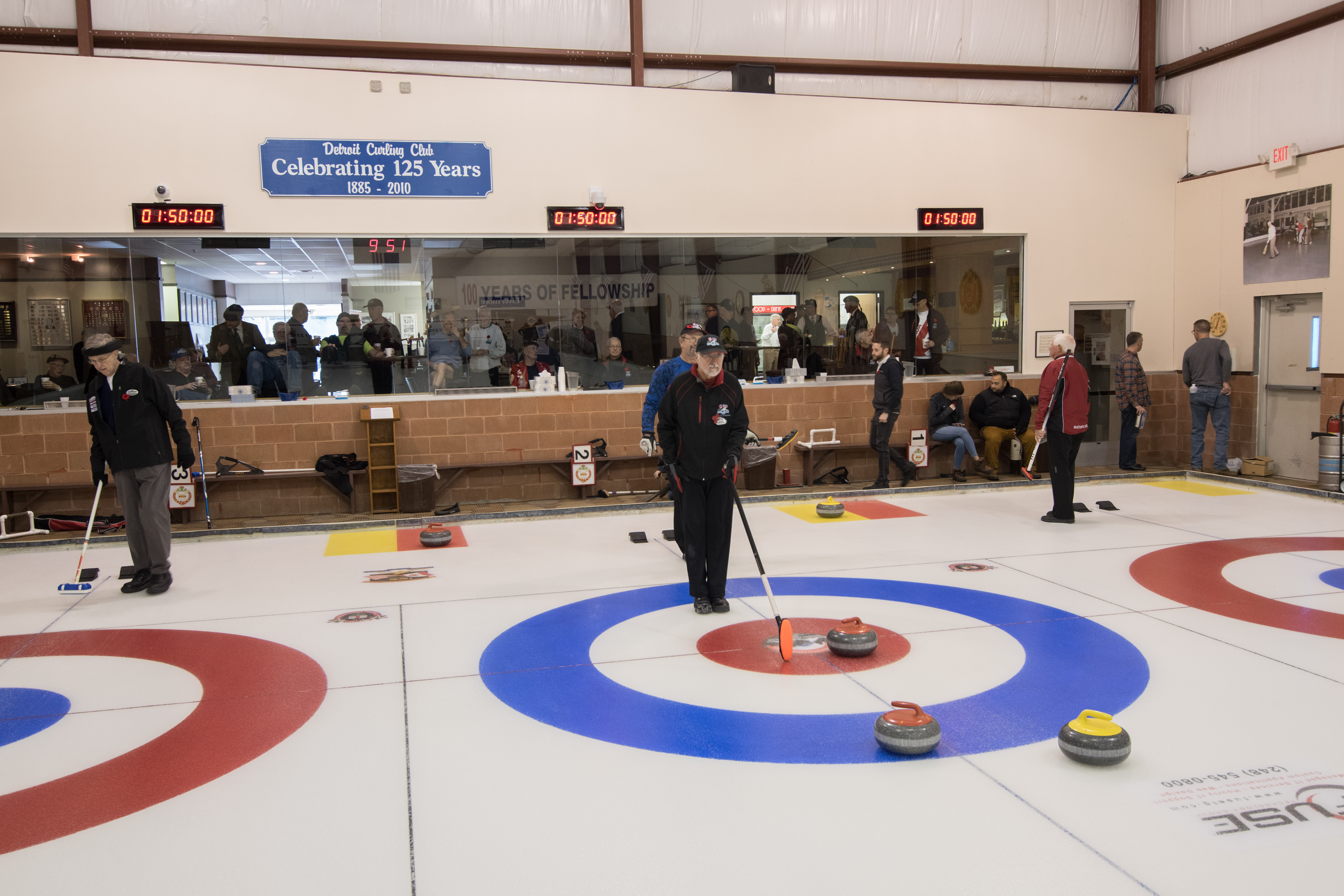 On Ice #1: Hugh Smith, Dallas Schneider, Ian Anderson, John Martin, Norm Green, Gordy Loud, Paul Sandford, Paul Carmouche and Mike RogalaOn Ice #2: Cec Hofstetter, Paul Badgero, Herb Millard, John Danckaert, Sam Kilby, Brian Gleiser, Pat Cannon and Peter HartillOn Ice #3: Matt Schumacher, Dave Hesse, Marcus Baker, Duncan Whitmore, Nate Glitman, Frank Duffey, Marty Verhoeven and Pete SylvainOn Ice #4: Luc Cormier, Kevin Bradley, Dave Nelsen, Graham Wallbank, Kevin Ingraham, Ron Boehmer, Dave Urbiel and Rick HarrisonIan Anderson wonders where his sweepers are?Showing fine form is Paul Sandford,while John Martin is ready to sweep.John Martin and Hugh Smith trying to decide whether to sweep.Sam Kilby and Pat Cannon figure this rock does not need sweeping.Will the rock curl that much Dallas?Frank Duffey with Marty Verhoeven behind.Graham Wallbank is not giving much broom for this takeout as Dave Nelsen looks on.Marcus Baker shows great form as Matt Schumacher is ready to pounce. Pete Sylvain is a little more patient.Marty reaches out to Dave NelsenNate Glitman delivers as Duncan Whitmore and Dave Hesse sweep.Luc Cormier follows the rock down the ice while Kevin Bradley and Dave Urbiel wait.Waiting behind the glassDouglas George chats with Dave CainAppropriately near the bar are the pipers and Larry AubuchonIan Anderson delivers better using a stick. Gordy Loud and Norm Green look on.Paul Badgero is telling Brian Gleiser not to sweep yet.Are you sure you want the rock there Cec?Looks like a narrow port to go through John!Big sweeping from Matt and Marcus.Did Pat and Peter sweep hard enough to make the double for Cec?Everyone is sweeping this one!A good use for a broom Cec!Ian wonders what is going on – over there?Certificate from Gov’t of Canada signed by TrudeauState of Michigan certificateDan Glendinning, Leroy Bliven, John MacDonald and Jim RenaudBob MacMillan and Nick YamburaI see you too Jerry!Don Sloat and Ken ZyrdJoe Livermore and John SpencerJim Morris being interviewed by Fox Sports – see video clipRichard Lepping being interviewed.Is that stick hollow Bob?Bret and John in front 100th bannerTeams getting ready for the second draw in the morningDave Cain, Mike Rogala, Nick Yambura, Duncan Whitmore, Gerry Dolff, Ken Romanik and Kevn Ingraham.At 11am the Last Post was played by boy scout Matthew McDonnell and his father Sean. There wasn’t a dry eye in the clubDallas Schneider with Matthew and SeanYou are supposed to stretch after you exercise Dan!Brett Dubrick ready to deliverDave wonders where all the rocks came from?Duncan is a little shakeySam is focusedDave is determinedGreat style BrettPaul has his eyes on the broomGreat stick delivery from LesKevin rests between shotsJoe is in charge of the houseVac deliversYou are supposed to look at the broom Jim!Kevin & Gerry sweep hardNich has great style in delivery and clothesI guess all that stretching before the game worked for Dan!Unlike his brother, Bill is focused on the broom.He is still focused on the broom!