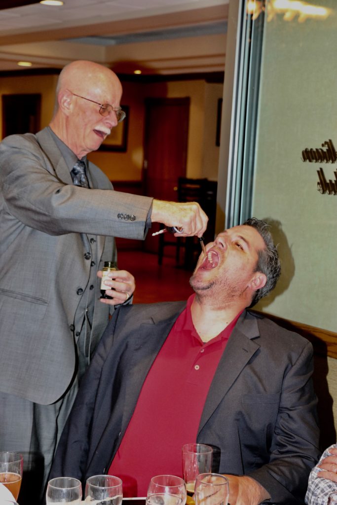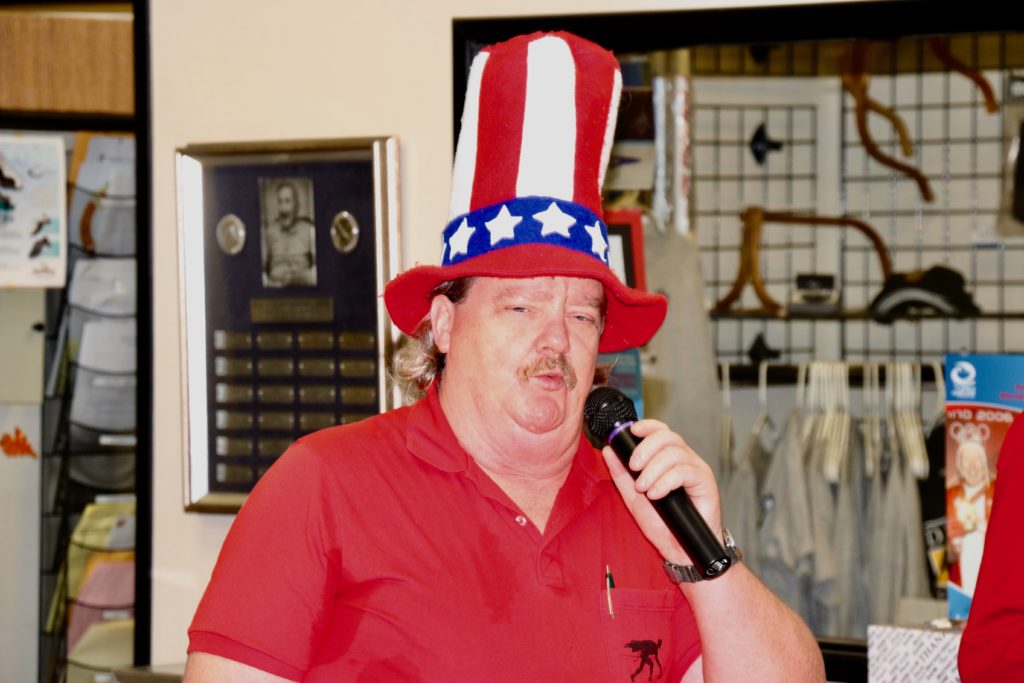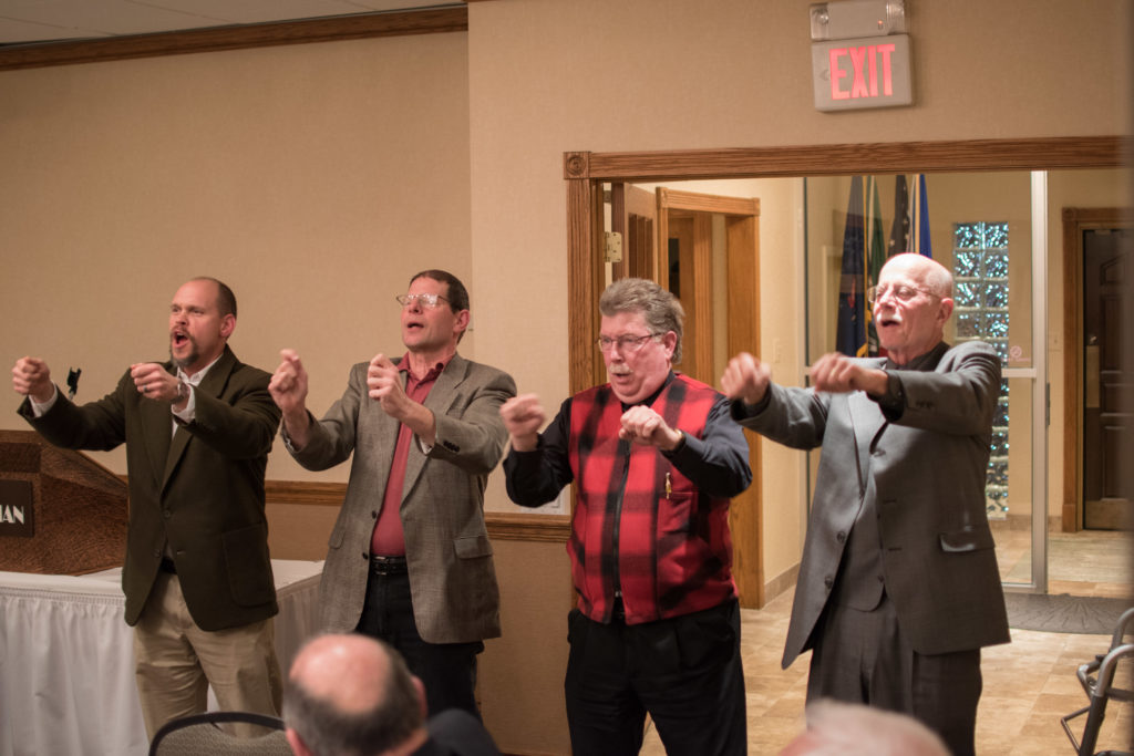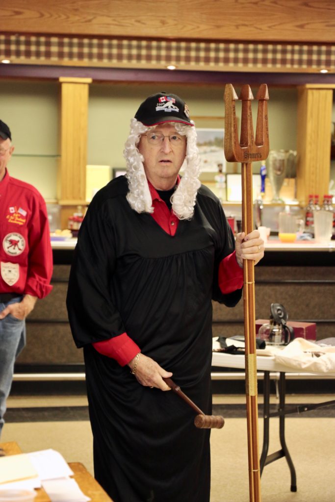Bobby Mac saying a few wordsGerry telling a storyThe judge hands out fines to miscreantsBobby has some more wordsA close upGerry telling another storyIs everyone paying attention to Gerry?Here come the judge!No mercy for the guiltyDallas, Bob and PaulMatt and Dallas“The Less Than Deplorables sing the ‘Men’ song, as the winners of the Bombay Bicycle Award” – Paul Gaines, Damien Buchkowski, Larry Aubuchon, Jim Morris and Bill Morris
