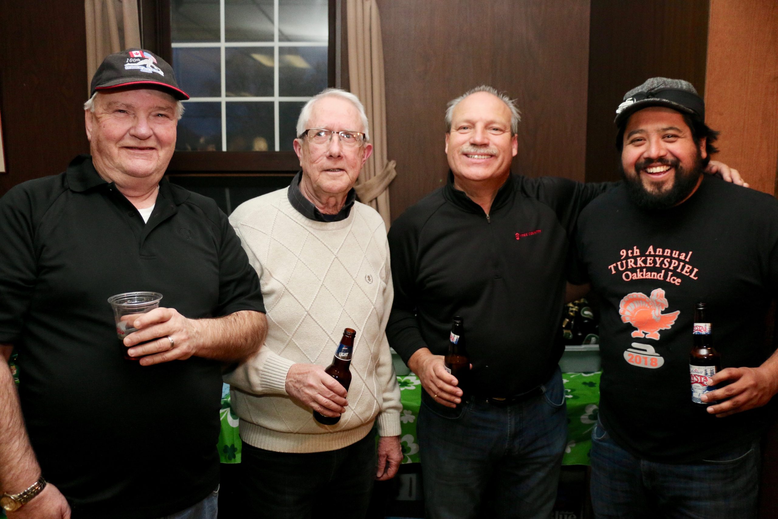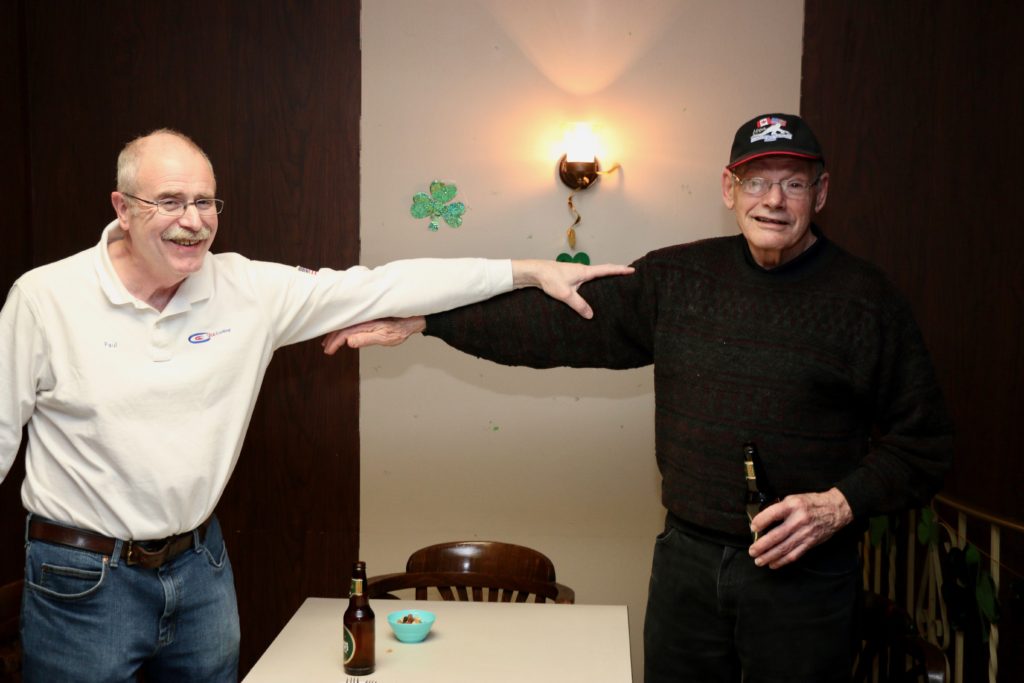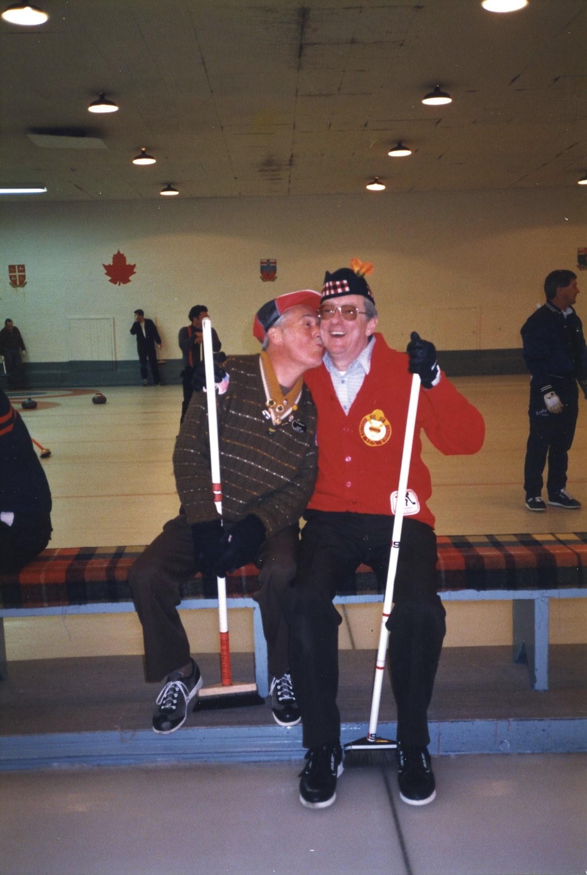 Ed and Harry in 1987Friday Hospitality:This is a touching moment but Paul and John should probably not be touching!Crash Jim joins us from Halifax, in lieu of Super Dave Osborn. Ron & Paul are in awe!Ben & Damien think that they have aiming fluid – wait until the curling tomorrow!A couple of oldtimers – Dallas & Ian – they still have their own teeth – we think!Steve & Duncan sit. Alex, Sam, Larry and Jeff stand. Bring in the clowns!Duncan is making sure the photographer is not up to any dirty tricks while Kevin makes sure he clinks Duncan’s bottle without breaking it!. Jeff & Gordy hang back!Bill (the mouth) with Dave & KW newbies – Cody & Scott – here tonight – gone tomorrow!Les & Jim – here’s the door MattThe Ben he saved or the Ben he urned!Jim, Cec & Bill. – We three kingsJim (one of the fallen), Doug, Kevin & AlexThe two Cs: Carl and what’s upChuckAll smiles are Leroy & more or LesSaturday Curling:Matt, Jeff, Alex, Damien, Duncan, Luc, Paul, Ian and Dave