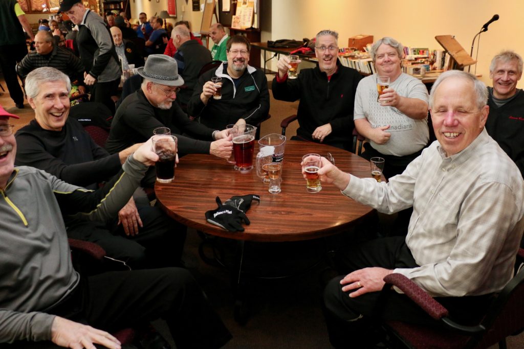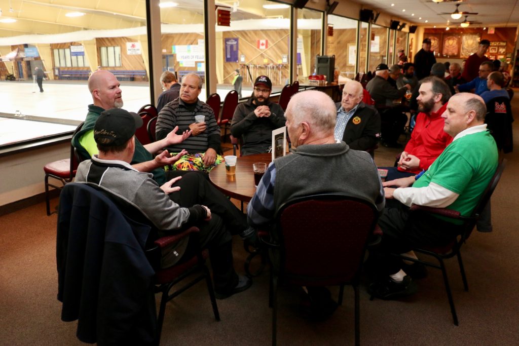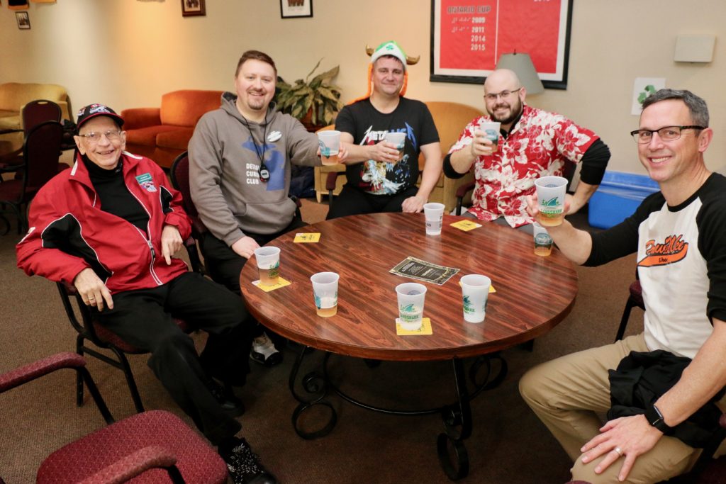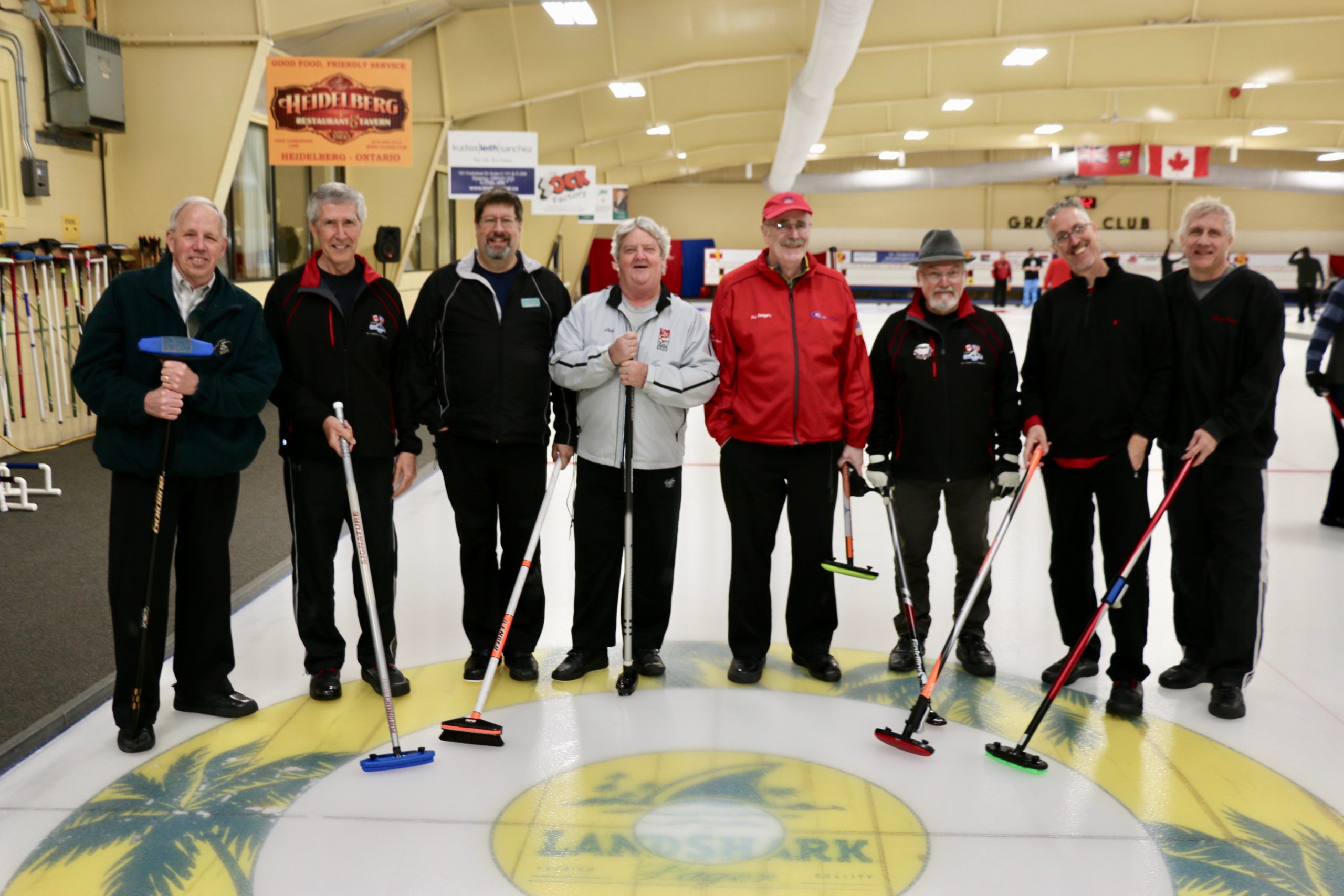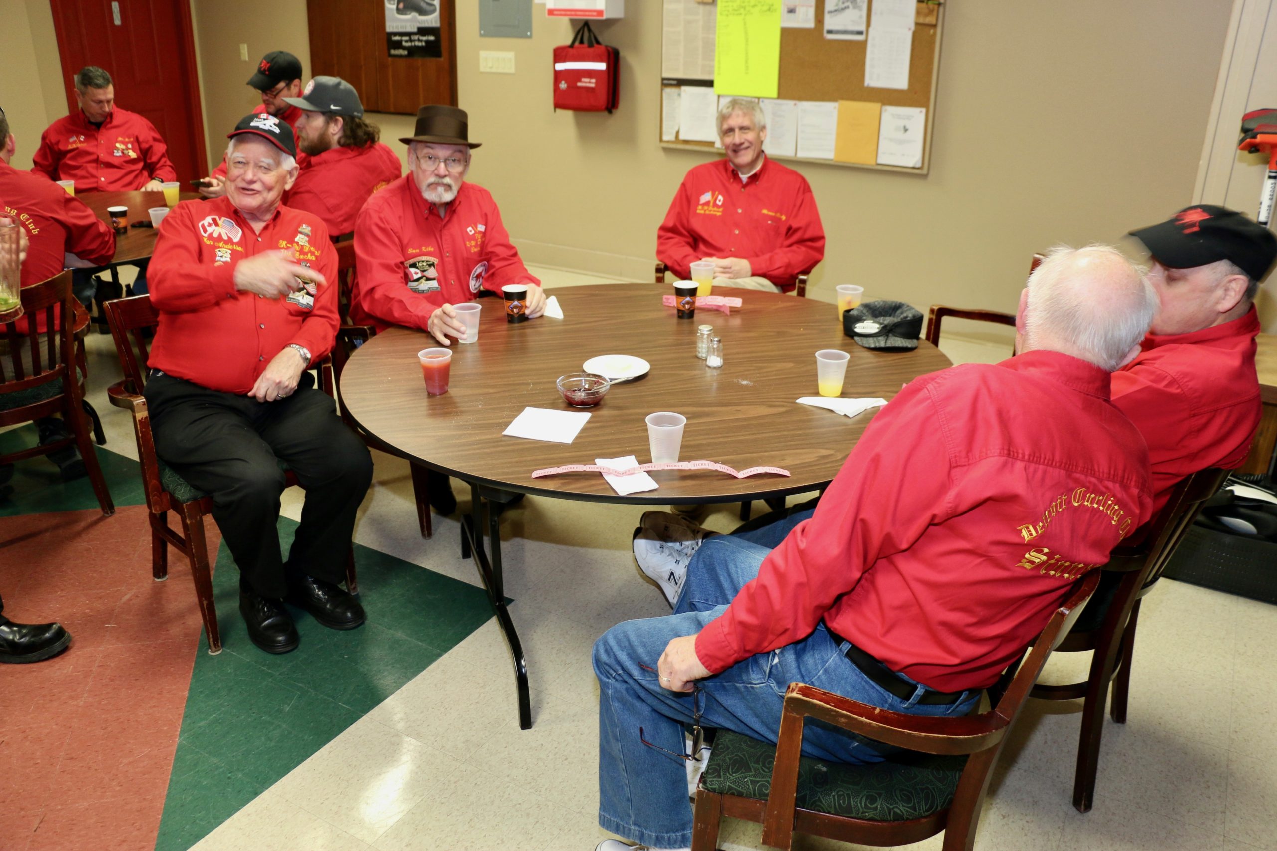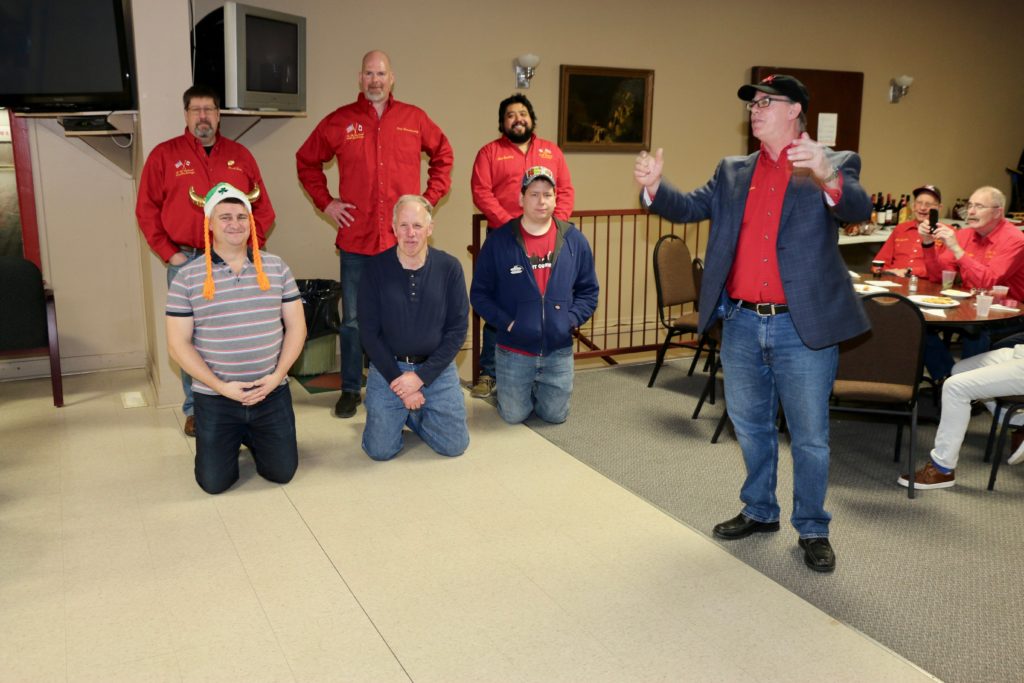 Carl, John, Brett, Bob, Paul, Sam, Joe & SteveCoaching behind the glass were the Dallas Cowboys: Dallas, Frank and JimPaul hacking it.At least they are not using their middle fingers, Ben, Tobby (Braidy bunch) & DamienGerry, Larry, Kevin & Paul (the Gerrycant’s)Cec is hoping for a double – how do I get the stick out?John, Dave (Able to raise Cain) & LeroyIan must be losing as he grits his teeth! Brian, Ian (true grit) and DuncanStack the brooms after 4 ends:Dan explains why Detroit was so far behind after the first four ends. Listening intently are clockwise from Dan: Kevin, Dave, Dave, Ben, Gordy, John & BrianNights of the Round table. Clockwise from bottom left: Gordy, John, Brian, Dan, Kevin, Dave, Dave & BenReal beer time – Cheers!: Clockwise: Paul, Luc, John, Alex, Damien, Bill, Duncan, Ian and half of DaveA happy table: Les, John, Tobby, Ben and Jim – some things come to a head!Alex is not a newby. He just likes Easter hats! PS He flew in from Phoenix and snatched victory from defeat in game 2!Dave, Marcus, Kevin, Gerry, Larry, Paul (practicing social distancing or having an a-Paulling reaction to FUPG)), Leroy & JohnLes laughs as Matt -turbating and Bill do not practice social distancingCec and desist Matt, but Jim seems to like Matt’s shoulder!Heidelberg’s free beer round!: Half of Paul, John, Sam (Diligently pouring), Brett, Joe, Bob, Steve (off to the right) and CarlSaturday Dinner:On the left: Ben & Leroy. On the right: Chuck “this over here” as Paul looks on. Norm is at the end.Frank, Dallas, Ron, Marcus, Gerry, Les and John (This coffee tastes like ….)On the left: Larry, Dave & Brett. On the right: John, Ian (chance to get ahead) and half of Paul’s about face.On the left: Joe’s head, Kevin, Carl, Cec, Sam’s hat. Steve ties one on at the head of the table. On the right: Jeff, Paul, Tobby & GordyBen, Luc, Damien, Dave, Duncan & Dapper Dan (I mean Bill)From the left: Dapper Dan, Alex, Jim (with Sam’s hat!), John, Kevin and BrianThe bar staff looked after us well!Sinner’s Breakfast:Raffle tickets are available for sale by: Dewey, Screwem & Howe. AKA: Bob. Jim & RonBar staff ready for the drinkers – what rhymes with orange?: Jim, Paul, Luc & KevinKitchen chefs get breakfast ready: Cec, Dan (the puck stops here) & BrandonCheers it’s really orange juice! Les, Ian, Steve & LeroyBashful, Happy & Dopey: AKA: Dave, Dave & Dallas4 Js and an N: Jeff, John, John, Norm & JohnSleepy, Doc & Dopey – AKA: John, Carl & BenTobby (Fairy princess), Brett (Snow White), Chuck (Sneezy) & Gordy (Prince Charming)Kevin wonders – You wanted what with that?: John & Ben are listening to someone!Kevin tops up Jim’s drink, Bill is checking the weather, Duncan is laid back and Damien tries to look disgusted!Jim says: “Kevin we don’t need anymore, we are crossing the border!” Dave & Joe have full glasses. Bill must have move on to the news feed!Ian, Sam & Steve. Gerry asks Gordy – “What did Ian say?”2 Daves in front, Chuck talks while Brett, Tobby & Kevin listen.Paul get roasted for the umpteenth time. Les on left, Larry sitting and Paul standing on right.The choir sings: Chuck, Brett, Paul, Ben, Steve, Ben, Ron, Paul, Gordy, Don, Jim & DamienThe new members are welcomed: Kneeling are: Tobby, Carl & Kevin. Behind: Brett, Dan & AlexDon adds a serious note to the gathering: Ian & Matt listenMatt “I will get your shirt by next year”It was Kevin’s phone – it’s fine with me.Paul tries to talk Matt out giving him a fine. Larry on the right was complicit, but staying out of it. Dan keeps an eye on the proceedings.Damien finds out that pleading does not give one relief from a fine from Matt. Dan has the basket ready for collection.Ron, Don, Bob and Carl await the judge’s accusation.Matt stands with the longest exchange members, From Detroit: Dallas & Dave. From KW: Ron & DonDan brings out the most sought after auction items: 1 roll of toilet paper and a bottle of hand sanitizer.We usually drink a toast from the Vince Scherer trophy. John & John show how it was done this year.Sam, Steve, Gordy & Ian do a group elbow bump.Saying goodbye are Larry, Paul & Dave – Safe trip home guys!Jim, Matt and Kevin