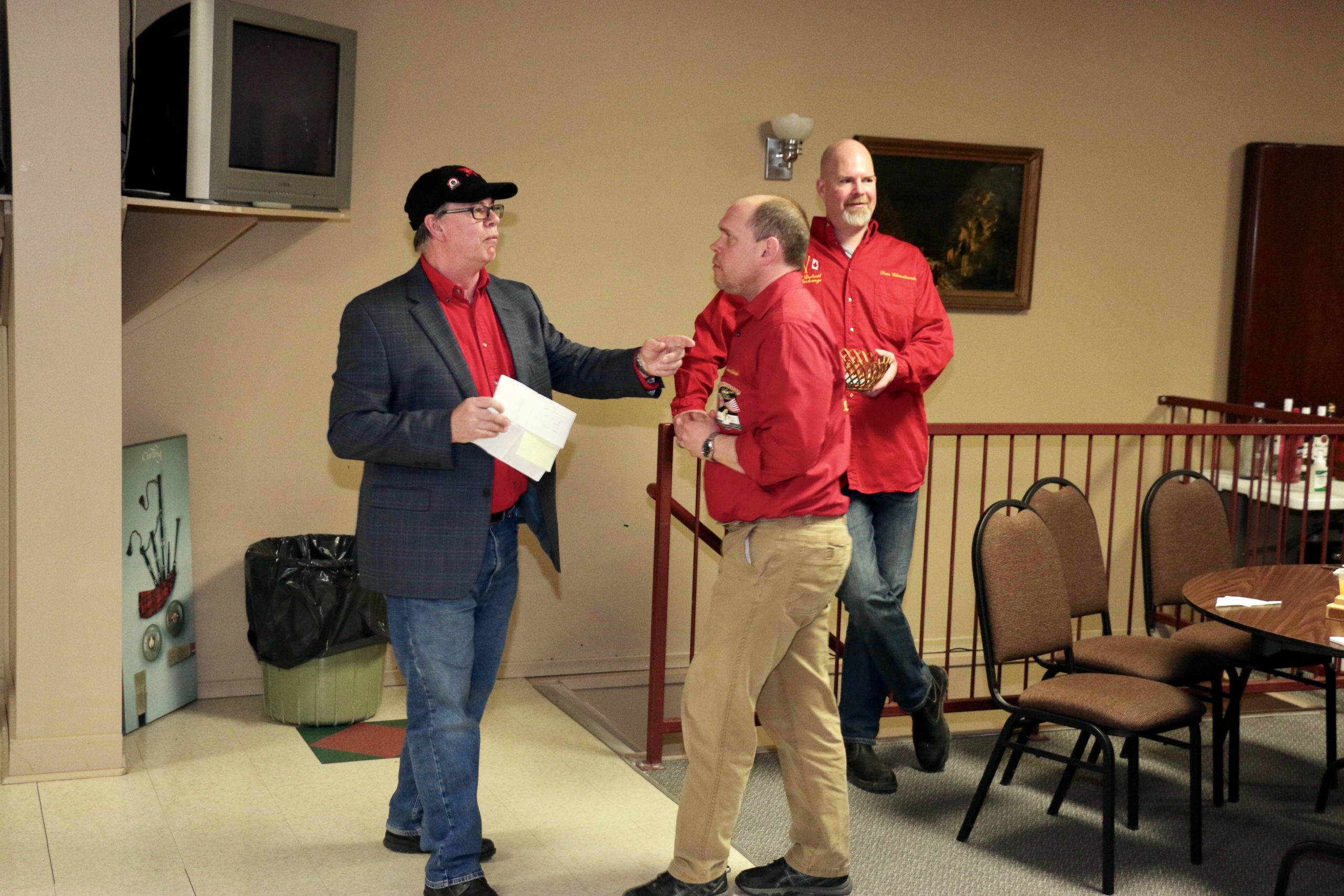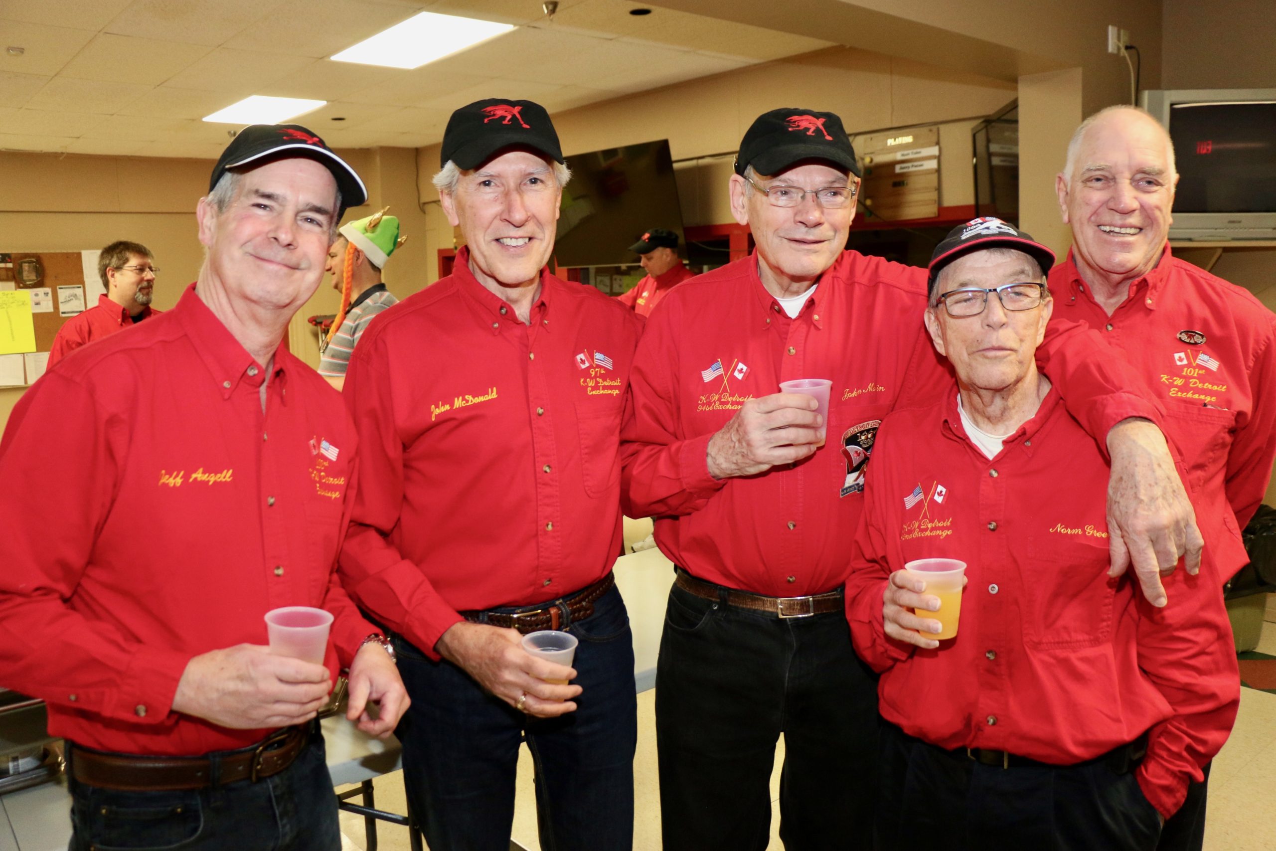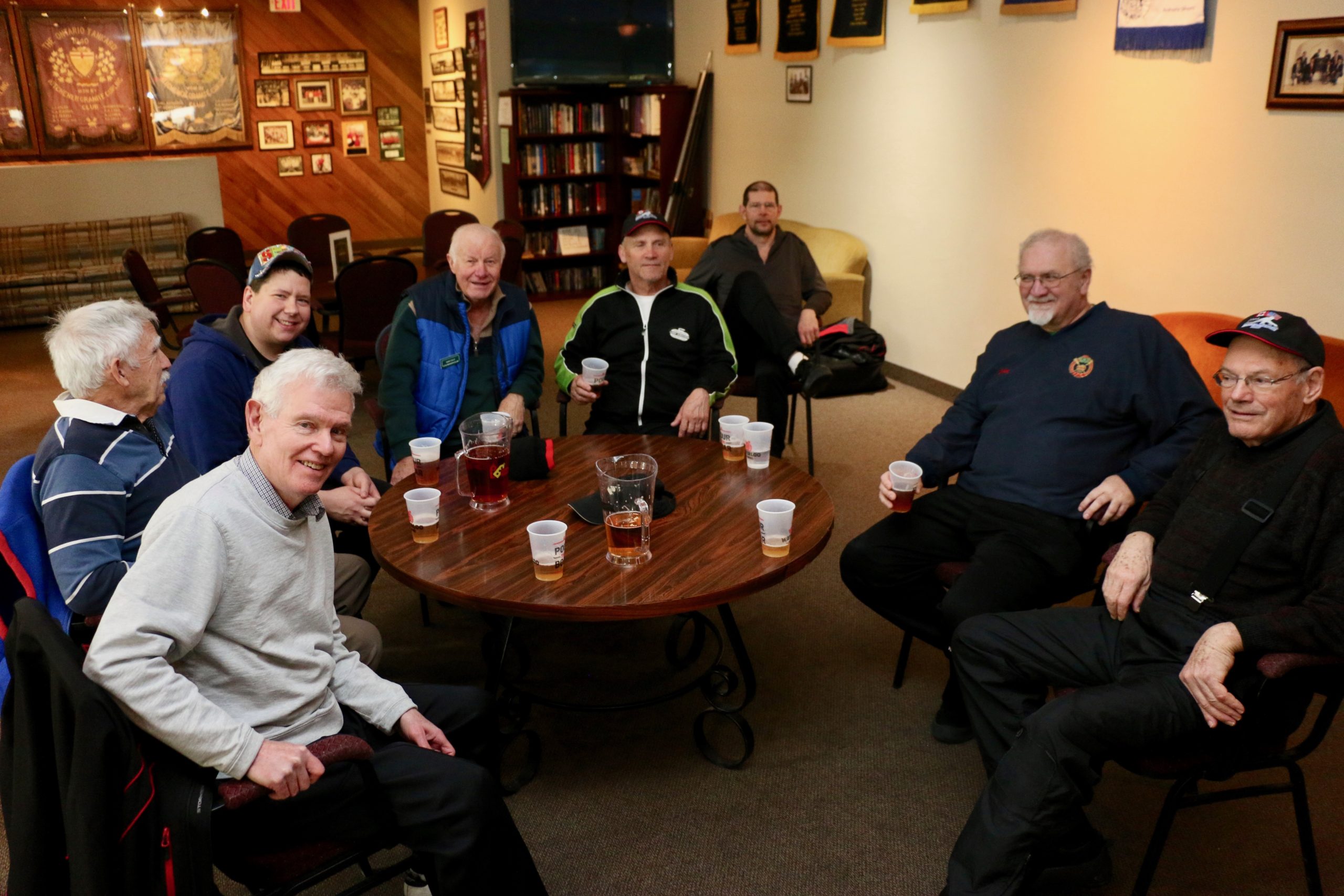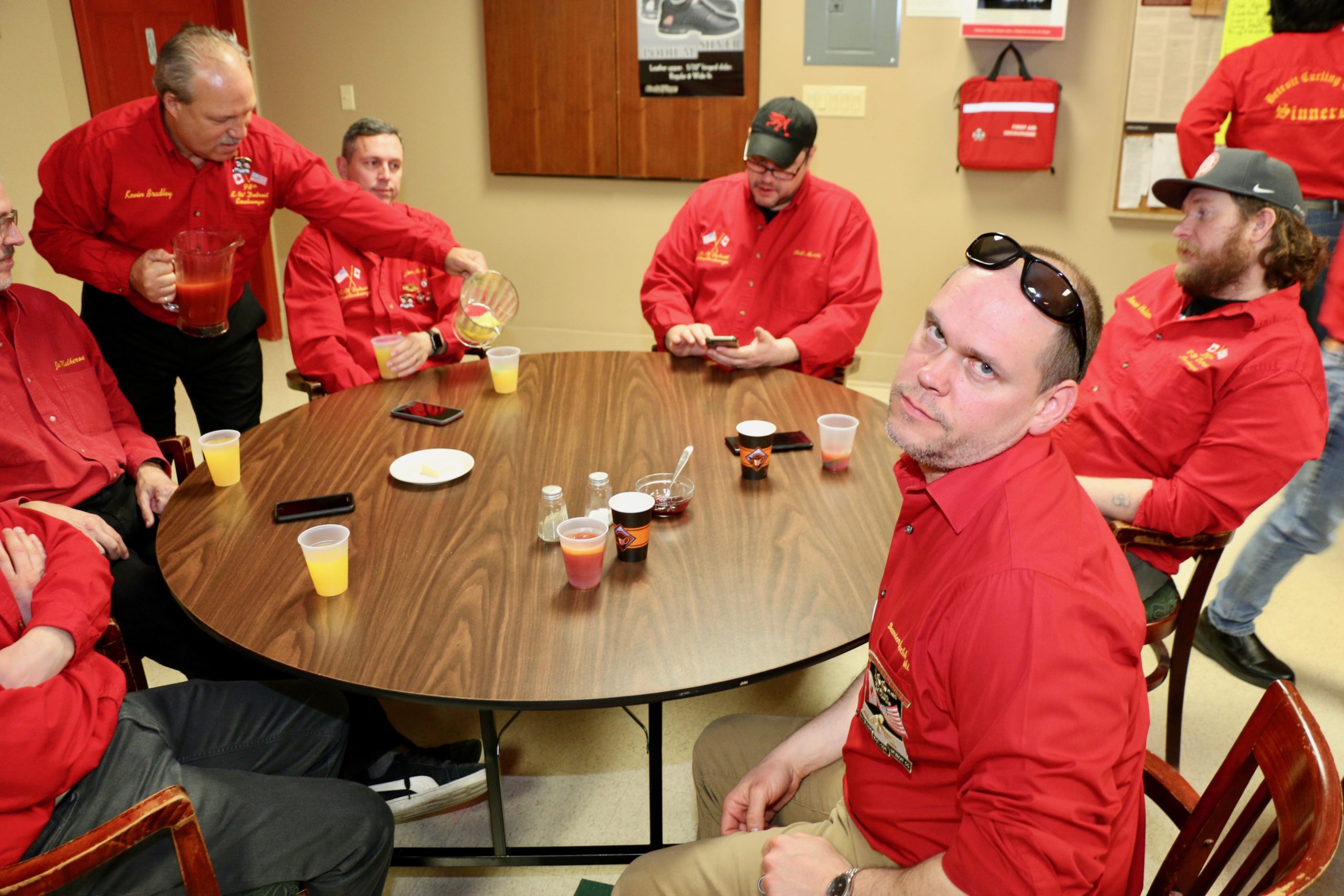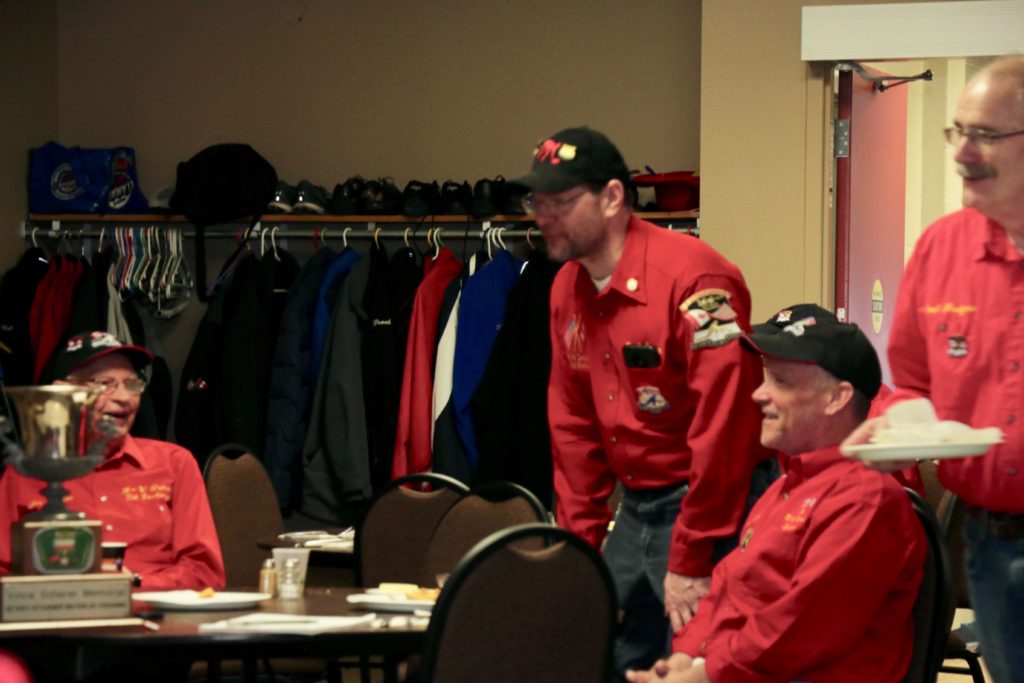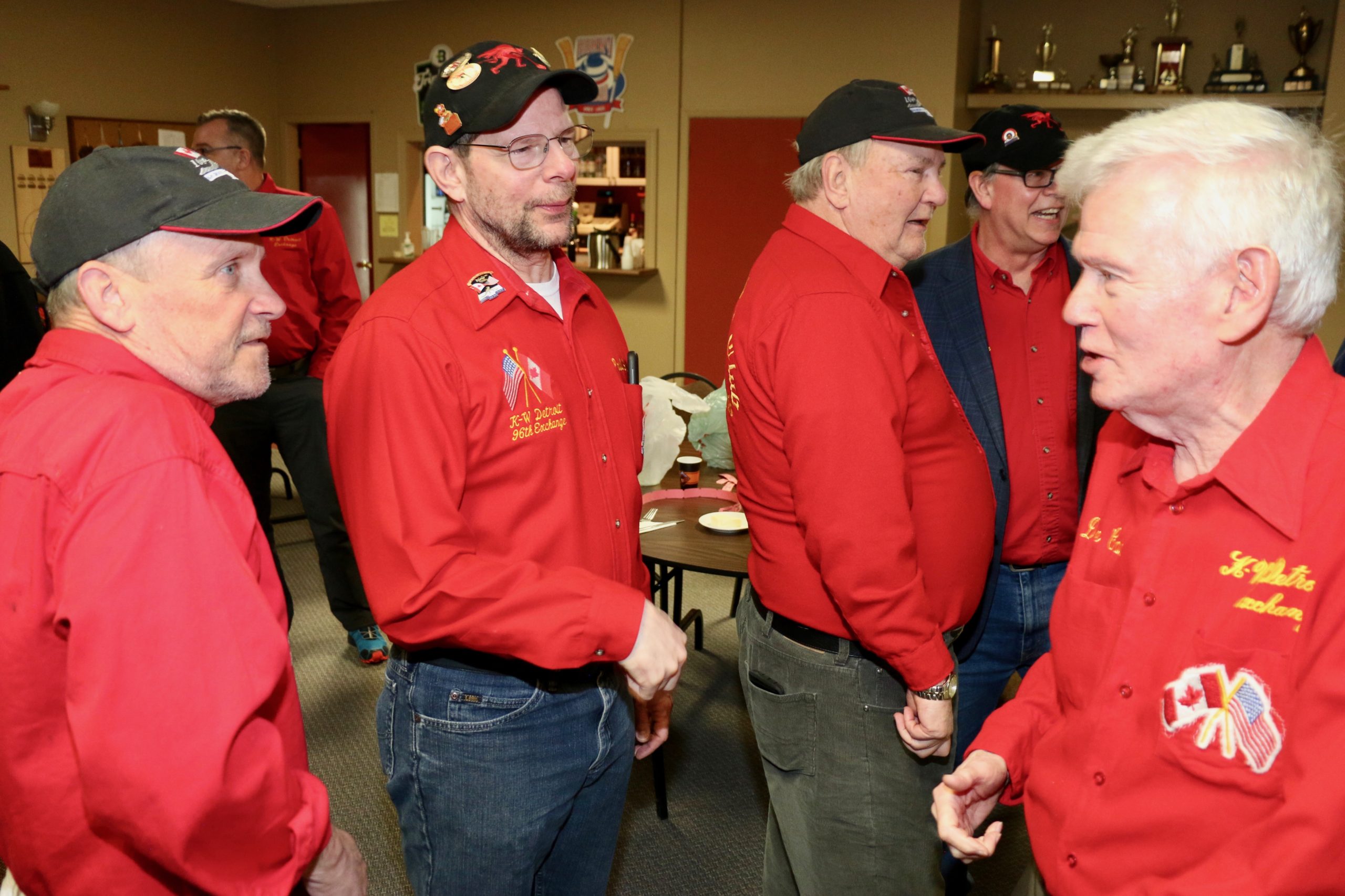Carl, John, Brett, Bob, Paul, Sam, Joe & SteveCoaching behind the glass were the Dallas Cowboys: Dallas, Frank and JimPaul hacking it.At least they are not using their middle fingers, Ben, Tobby (Braidy bunch) & DamienGerry, Larry, Kevin & Paul (the Gerrycant’s)Cec is hoping for a double – how do I get the stick out?John, Dave (Able to raise Cain) & LeroyIan must be losing as he grits his teeth! Brian, Ian (true grit) and DuncanStack the brooms after 4 ends:Dan explains why Detroit was so far behind after the first four ends. Listening intently are clockwise from Dan: Kevin, Dave, Dave, Ben, Gordy, John & BrianNights of the Round table. Clockwise from bottom left: Gordy, John, Brian, Dan, Kevin, Dave, Dave & BenReal beer time – Cheers!: Clockwise: Paul, Luc, John, Alex, Damien, Bill, Duncan, Ian and half of DaveA happy table: Les, John, Tobby, Ben and Jim – some things come to a head!Alex is not a newby. He just likes Easter hats! PS He flew in from Phoenix and snatched victory from defeat in game 2!Dave, Marcus, Kevin, Gerry, Larry, Paul (practicing social distancing or having an a-Paulling reaction to FUPG)), Leroy & JohnLes laughs as Matt -turbating and Bill do not practice social distancingCec and desist Matt, but Jim seems to like Matt’s shoulder!Heidelberg’s free beer round!: Half of Paul, John, Sam (Diligently pouring), Brett, Joe, Bob, Steve (off to the right) and CarlSaturday Dinner:On the left: Ben & Leroy. On the right: Chuck “this over here” as Paul looks on. Norm is at the end.Frank, Dallas, Ron, Marcus, Gerry, Les and John (This coffee tastes like ….)On the left: Larry, Dave & Brett. On the right: John, Ian (chance to get ahead) and half of Paul’s about face.On the left: Joe’s head, Kevin, Carl, Cec, Sam’s hat. Steve ties one on at the head of the table. On the right: Jeff, Paul, Tobby & GordyBen, Luc, Damien, Dave, Duncan & Dapper Dan (I mean Bill)From the left: Dapper Dan, Alex, Jim (with Sam’s hat!), John, Kevin and BrianThe bar staff looked after us well!Sinner’s Breakfast:Raffle tickets are available for sale by: Dewey, Screwem & Howe. AKA: Bob. Jim & RonBar staff ready for the drinkers – what rhymes with orange?: Jim, Paul, Luc & KevinKitchen chefs get breakfast ready: Cec, Dan (the puck stops here) & BrandonCheers it’s really orange juice! Les, Ian, Steve & LeroyBashful, Happy & Dopey: AKA: Dave, Dave & Dallas4 Js and an N: Jeff, John, John, Norm & JohnSleepy, Doc & Dopey – AKA: John, Carl & BenTobby (Fairy princess), Brett (Snow White), Chuck (Sneezy) & Gordy (Prince Charming)Kevin wonders – You wanted what with that?: John & Ben are listening to someone!Kevin tops up Jim’s drink, Bill is checking the weather, Duncan is laid back and Damien tries to look disgusted!Jim says: “Kevin we don’t need anymore, we are crossing the border!” Dave & Joe have full glasses. Bill must have move on to the news feed!Ian, Sam & Steve. Gerry asks Gordy – “What did Ian say?”2 Daves in front, Chuck talks while Brett, Tobby & Kevin listen.Paul get roasted for the umpteenth time. Les on left, Larry sitting and Paul standing on right.The choir sings: Chuck, Brett, Paul, Ben, Steve, Ben, Ron, Paul, Gordy, Don, Jim & DamienThe new members are welcomed: Kneeling are: Tobby, Carl & Kevin. Behind: Brett, Dan & AlexDon adds a serious note to the gathering: Ian & Matt listenMatt “I will get your shirt by next year”It was Kevin’s phone – it’s fine with me.Paul tries to talk Matt out giving him a fine. Larry on the right was complicit, but staying out of it. Dan keeps an eye on the proceedings.Damien finds out that pleading does not give one relief from a fine from Matt. Dan has the basket ready for collection.Ron, Don, Bob and Carl await the judge’s accusation.Matt stands with the longest exchange members, From Detroit: Dallas & Dave. From KW: Ron & DonDan brings out the most sought after auction items: 1 roll of toilet paper and a bottle of hand sanitizer.We usually drink a toast from the Vince Scherer trophy. John & John show how it was done this year.Sam, Steve, Gordy & Ian do a group elbow bump.Saying goodbye are Larry, Paul & Dave – Safe trip home guys!Jim, Matt and Kevin