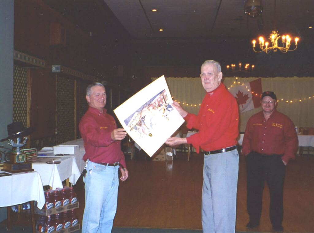 2002 March: Paul presents Joe with a print celebrating the 80th exchange.