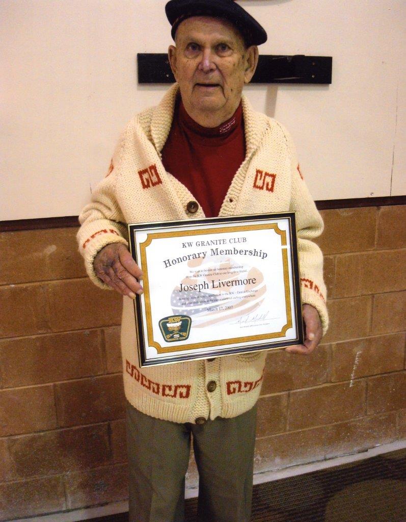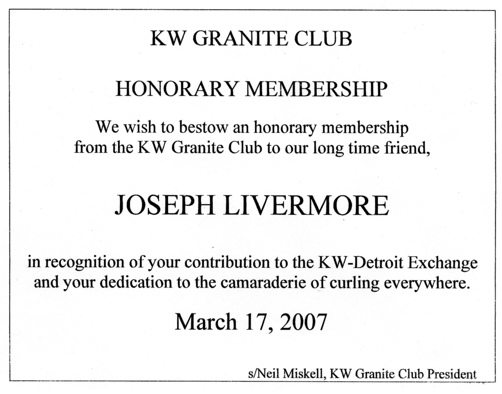 2007 March: As a token of appreciation for his years of service to the exchange, Joe was presented with an honorary membership from the KW Granite Club at the Kitchener end of the 90th exchange.